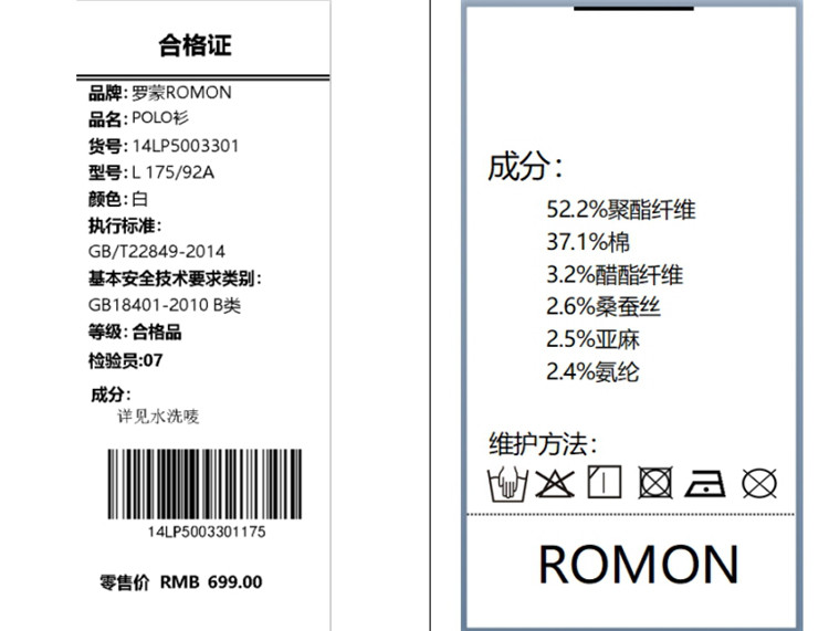 面料:52.2%聚酯纤维 37.1%棉 3.2%醋酯纤维 2.6%桑蚕丝 2.5%亚麻 2.4%氨纶