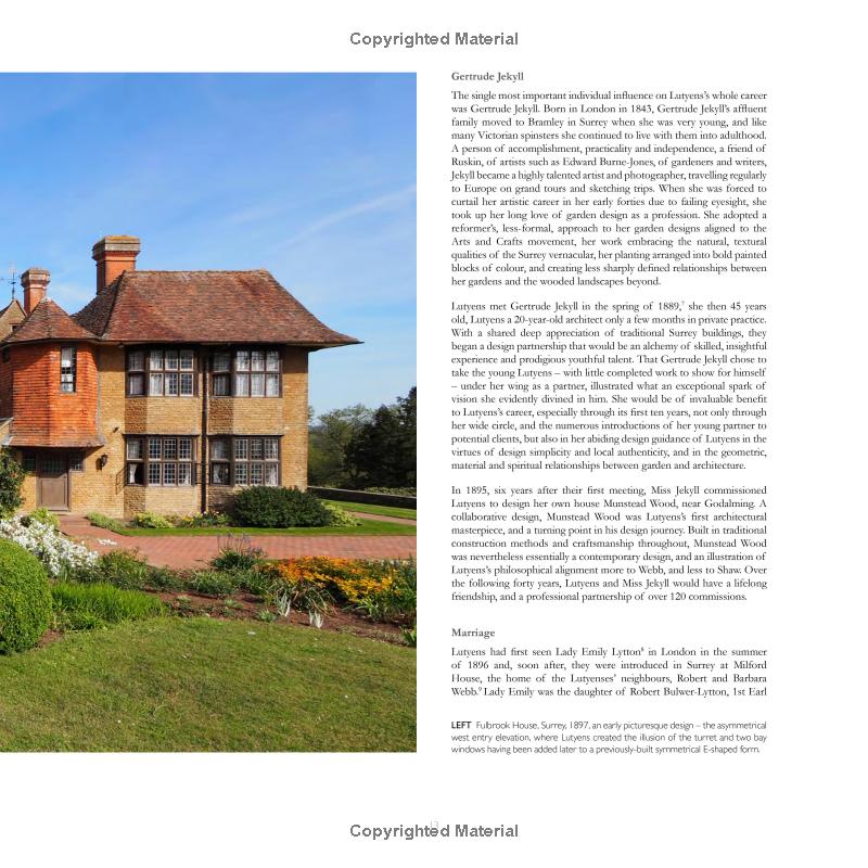 埃德温·卢琴斯爵士被广泛认为是英国最伟大的建筑师之一。在50多年的职业生涯中,跨越了维多利亚时代,爱德华时代和现代建筑时代。他的作品包括伟大的乡间别墅,城市商业办公楼,他在欧洲和英国建造的著名的第一次世界大战纪念馆,以及他在20世纪20年代和30年代为新德里建造的巨著设计。尽管在他漫长的职业生涯中,建筑类型如此多样化,但Lutyens最着名的作品仍然是他的乡间别墅,这在19世纪90年代首次建立了他的声誉。随着Lutyens的实践蓬勃发展,他的作品在《乡村生活》杂志等出版物中得到了广泛推广,他的房屋,特别是那些以白话方式设计的房屋,随后产生了整个英国乡间别墅的流派,直到今天,它被称为"Lutyens风格"的房子。