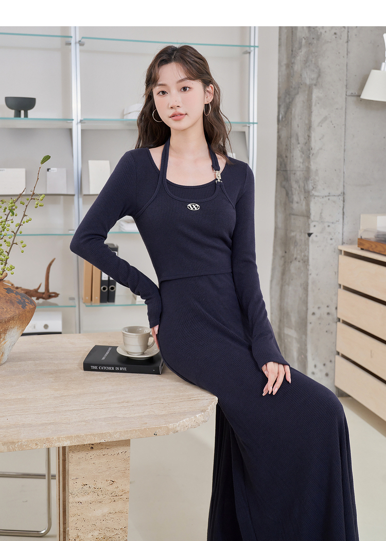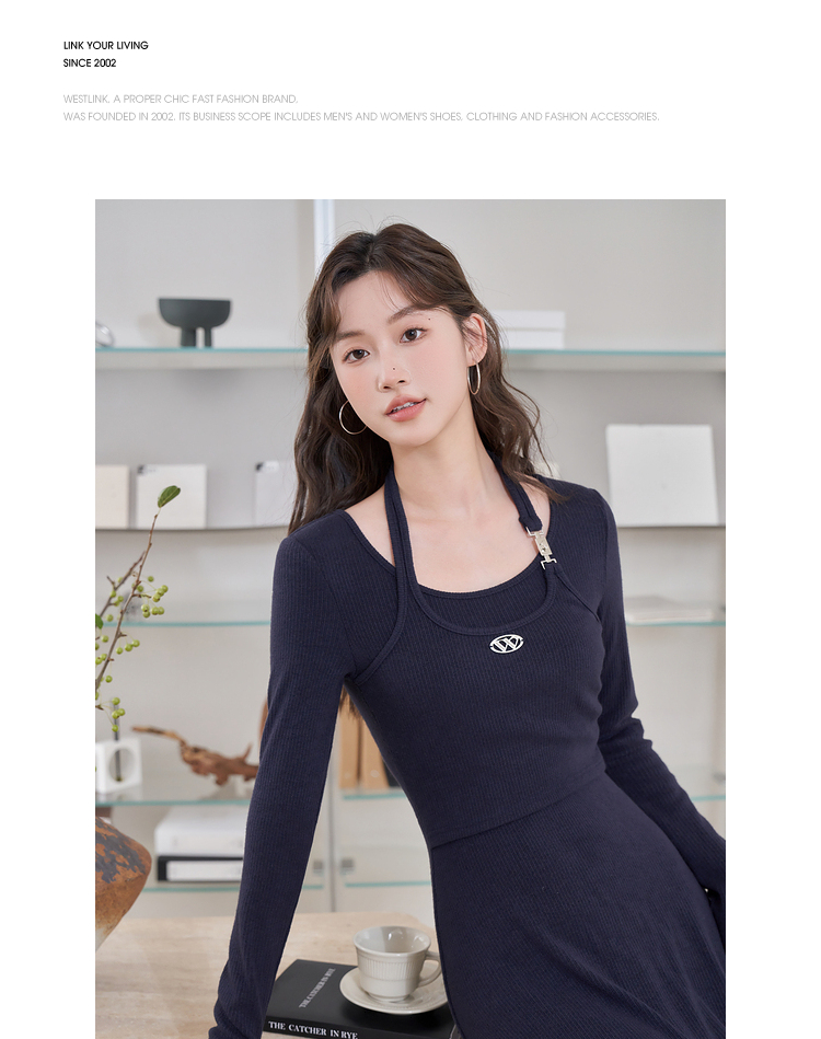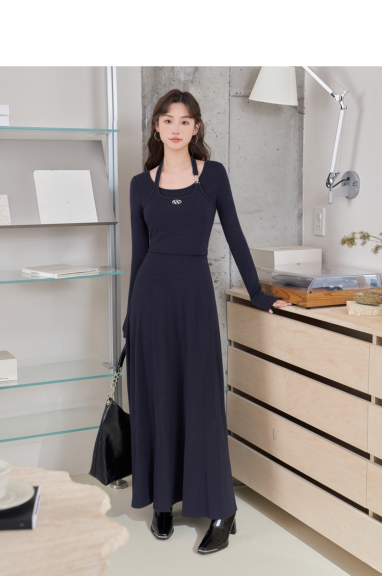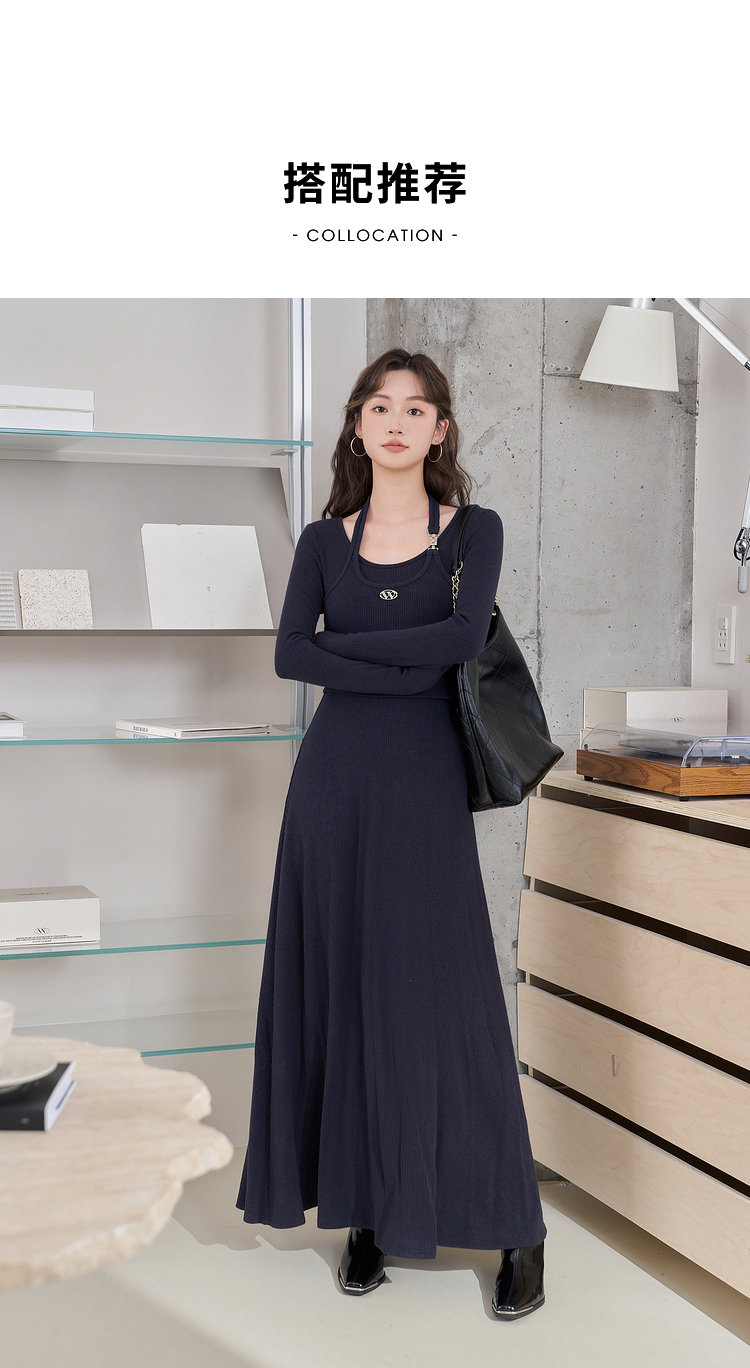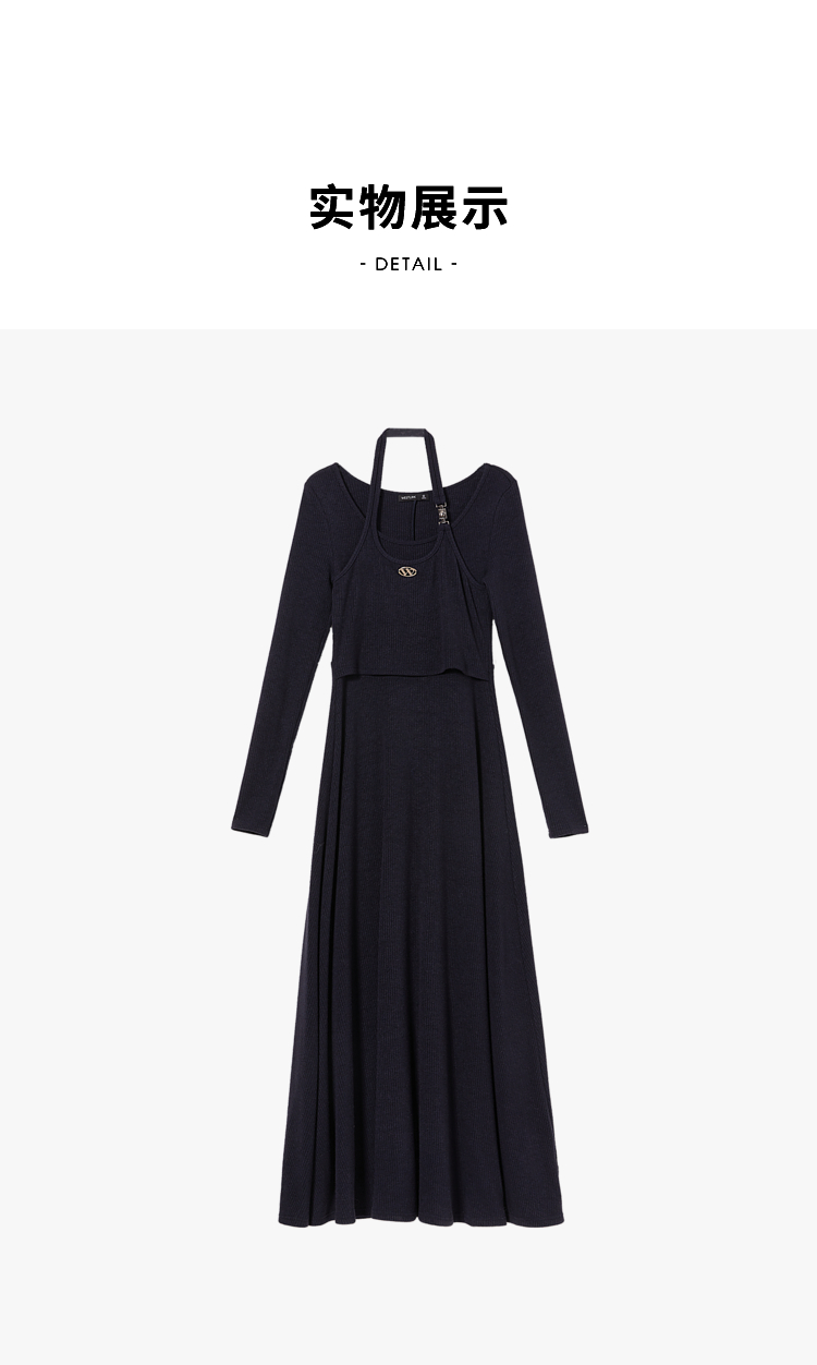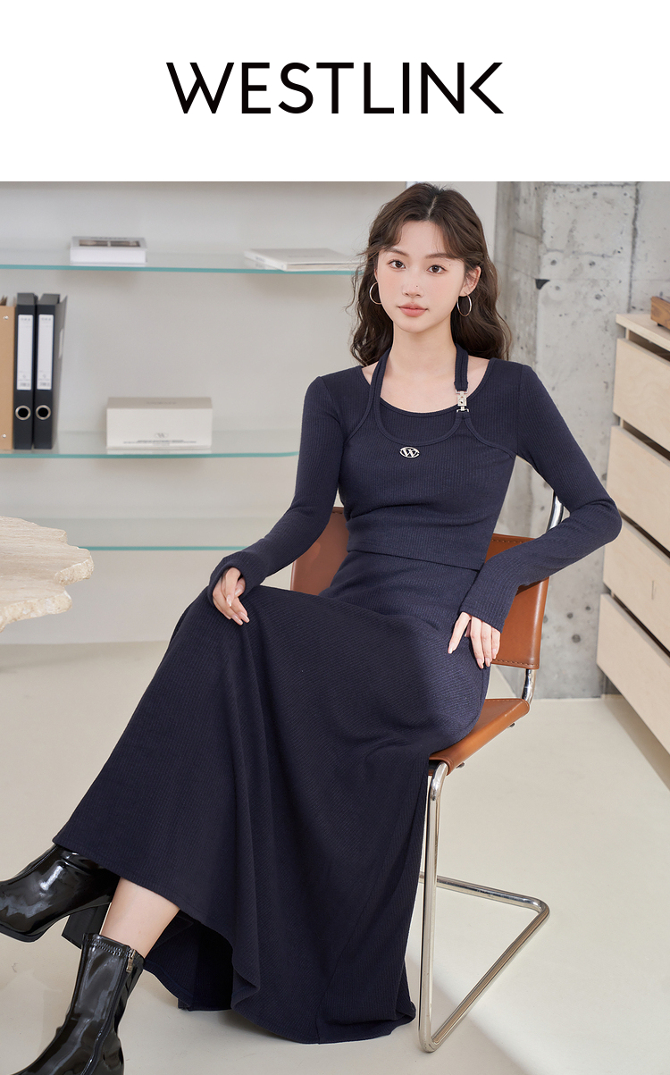 西遇长袖针织连衣裙女新款优雅坠垂感修身显瘦蓝色裙子D2138538