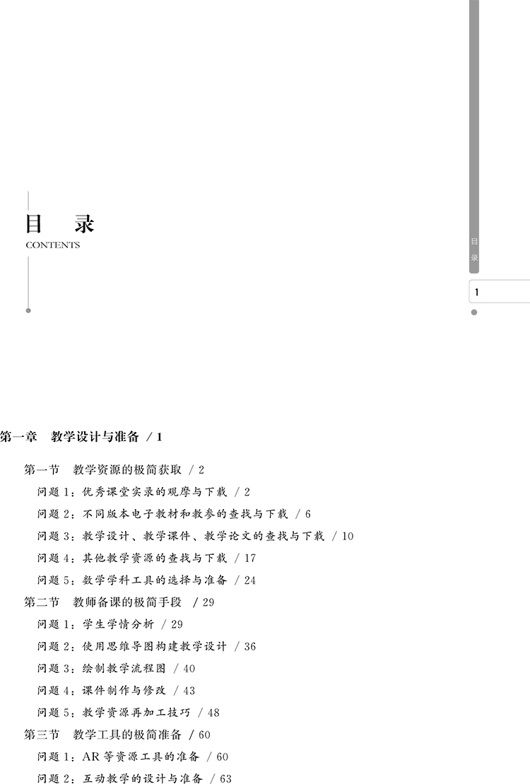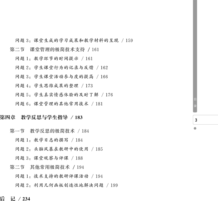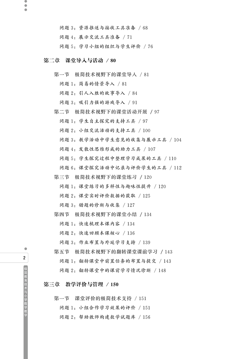 本书以一线小学数学教师的教学工作流程为内容组织方式,从教学准备、教学设计、教学实施、教学评价、教学管理、教学反思,这5个部分介绍简单易用的教学支持技术。每个工作流程中设置不同的场景(主要是多媒体教学环境、混合学习环境、智慧学习环境)作为技术应用的情景创建。第一部分:极简技术视野下的小学数学教师高效教学准备;第二部分:极简技术支持下的小学数学教师信息化教学设计;第三部分:小学数学教学过程中教师应知应会的极简教学技术;第四部分:极简技术支持下的小学数学教学评价活动开展;第五部分:极简教育技术支持下的小学数学课堂教学管理;第六部分:技术支持下的小学数学教学反思。