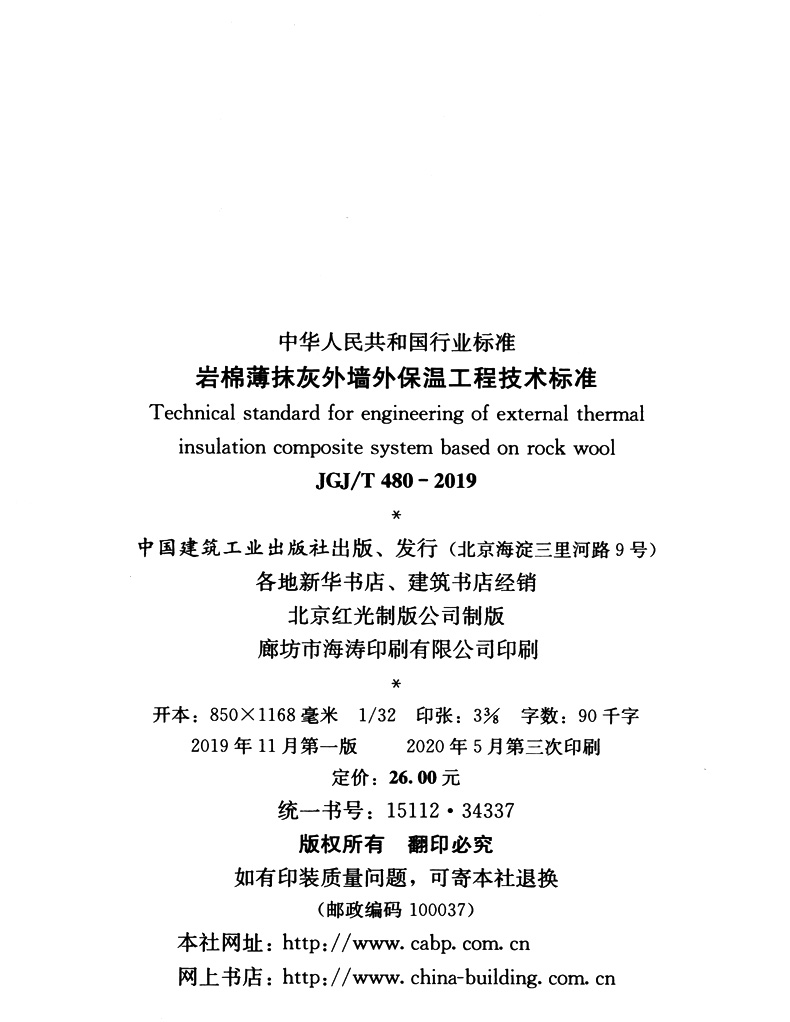 书名:岩棉薄抹灰外墙外保温工程技术标准 JGJ/T 480-2019
