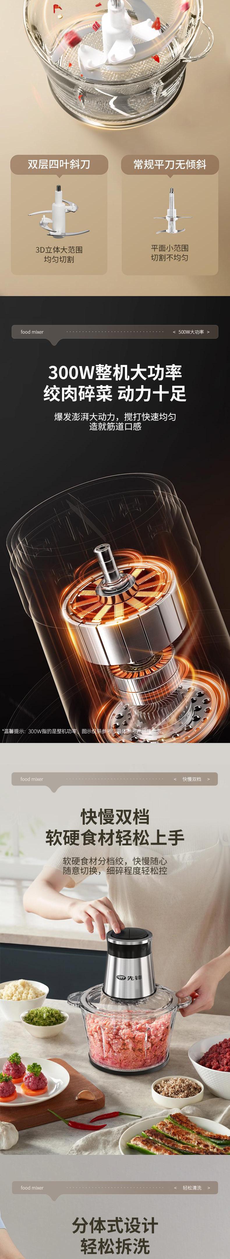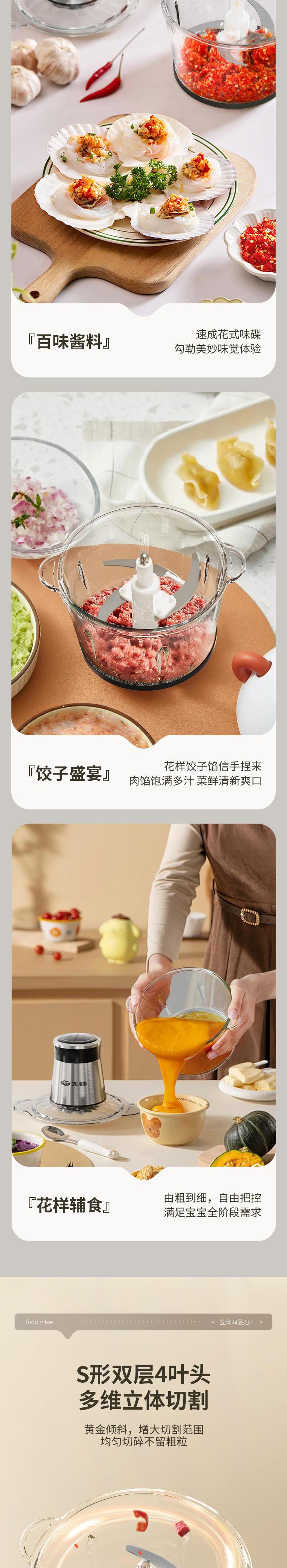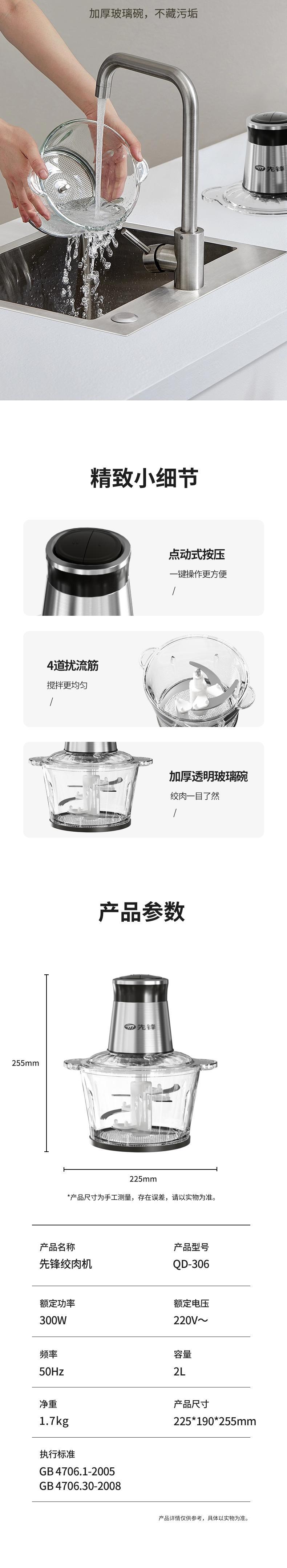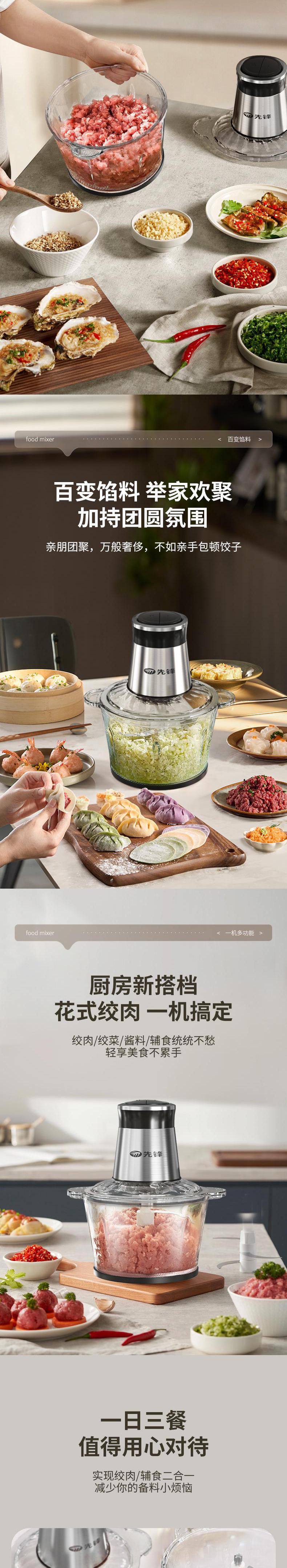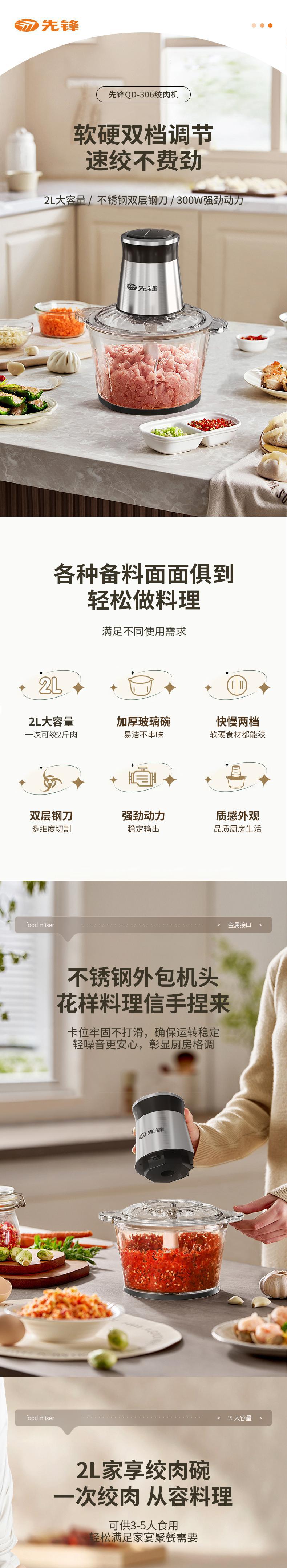 【自营】先锋QD-306多功能料理机(绞肉机)不锈钢款碎肉辅食机剥蒜打泥切菜省力
