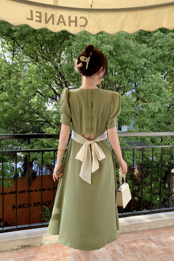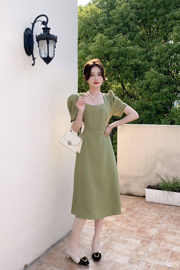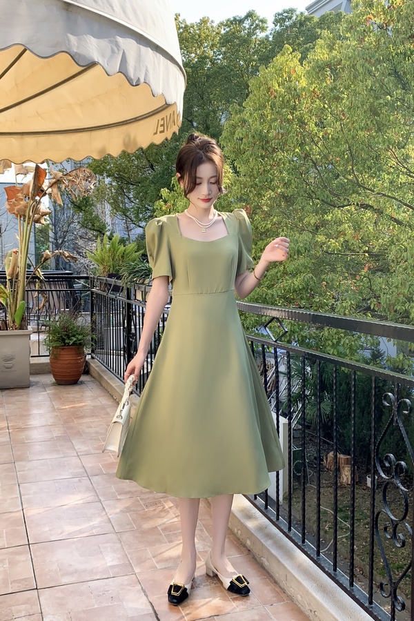 Le Malene 豆绿色方领泡泡袖连衣裙 18199