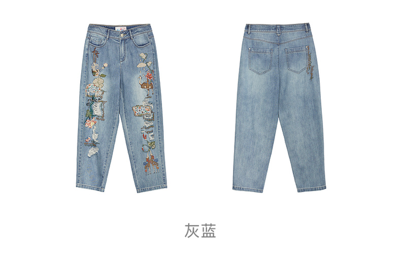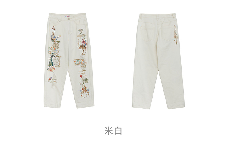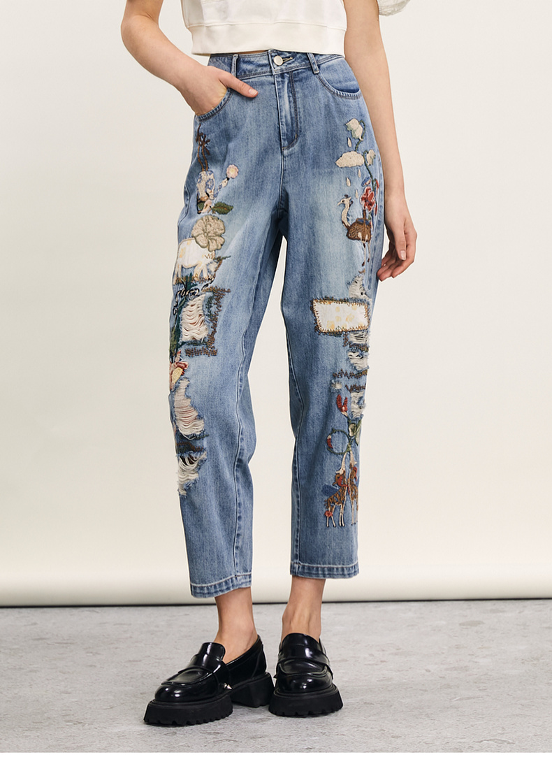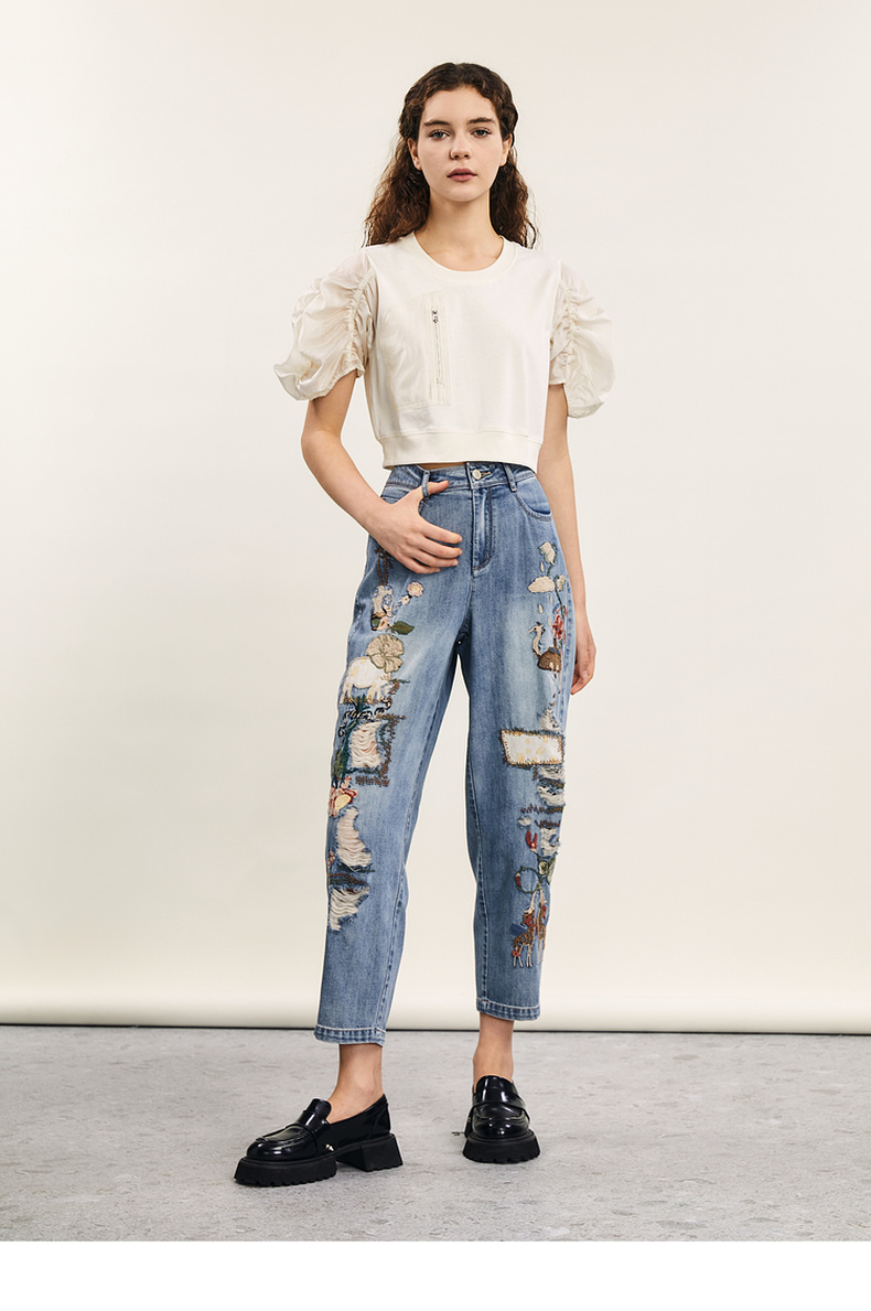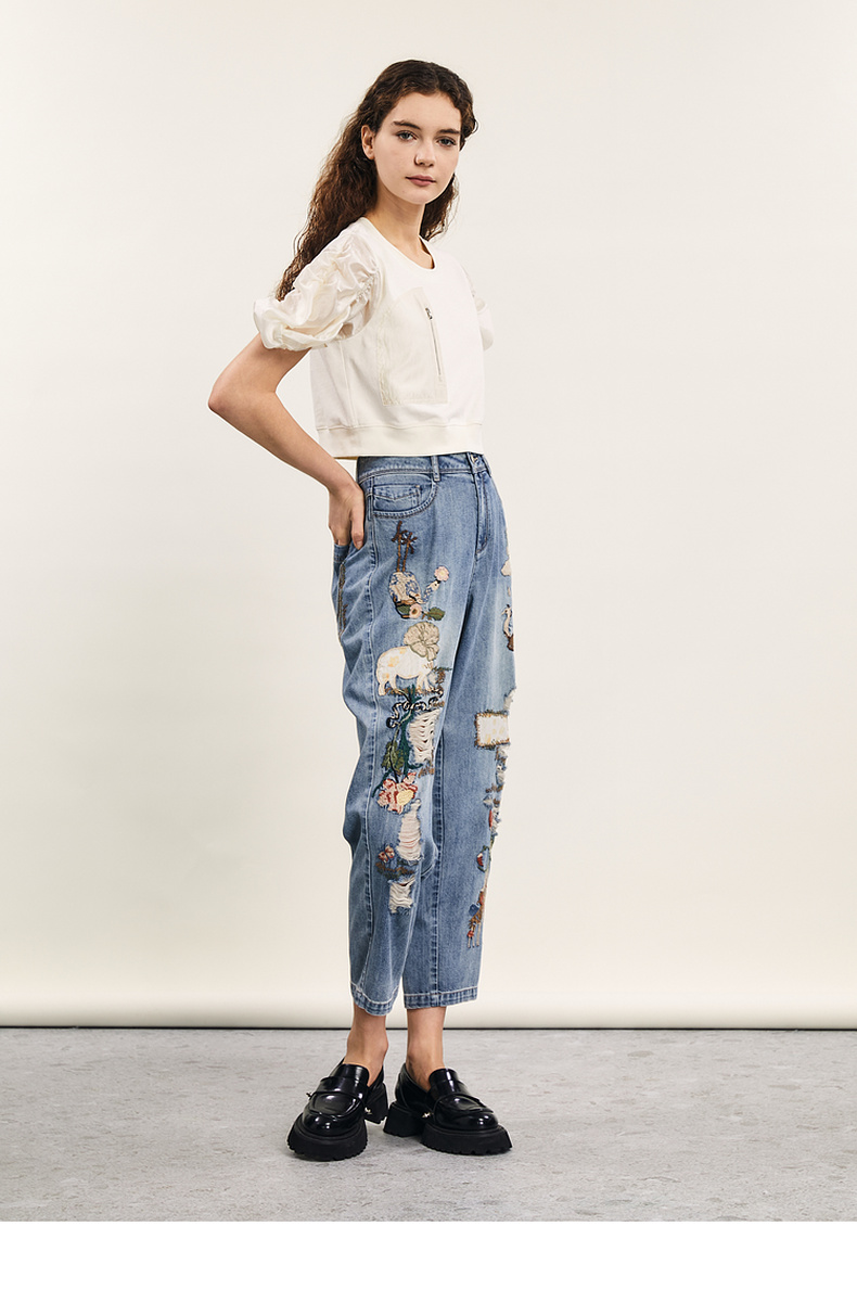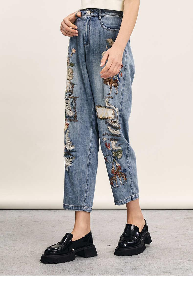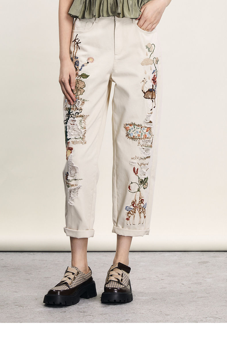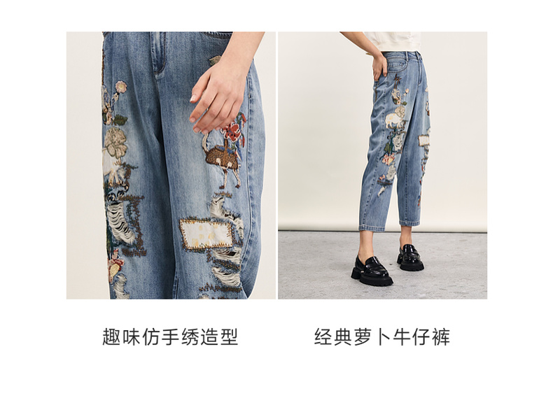 谜底萝卜裤女2024夏季新品复古重工绣花破洞宽松九分裤242MK0666