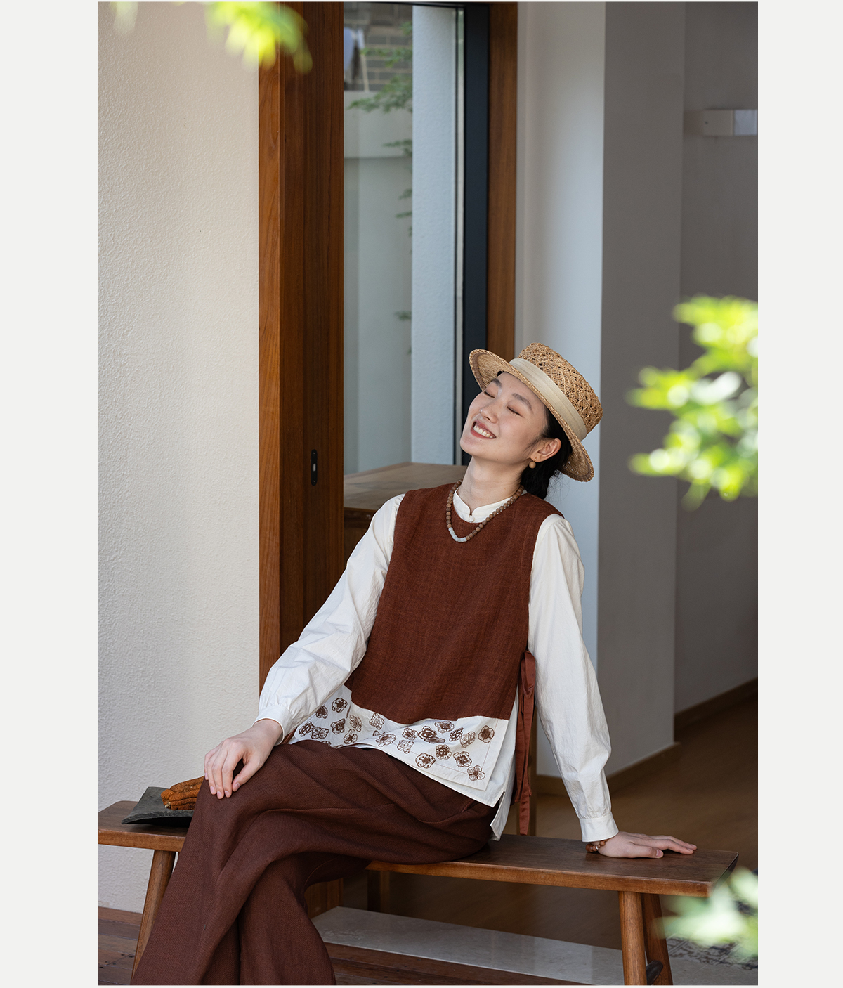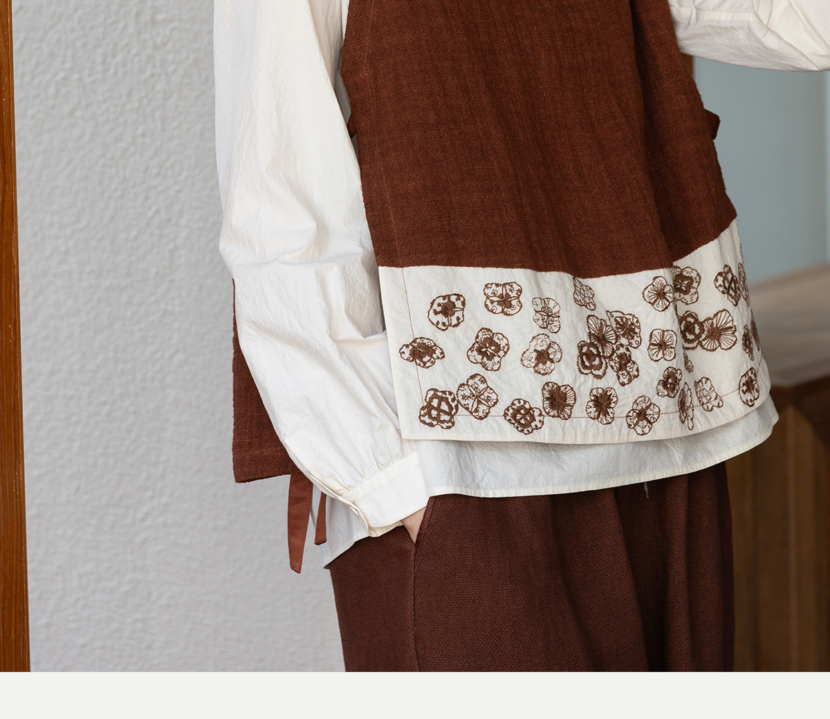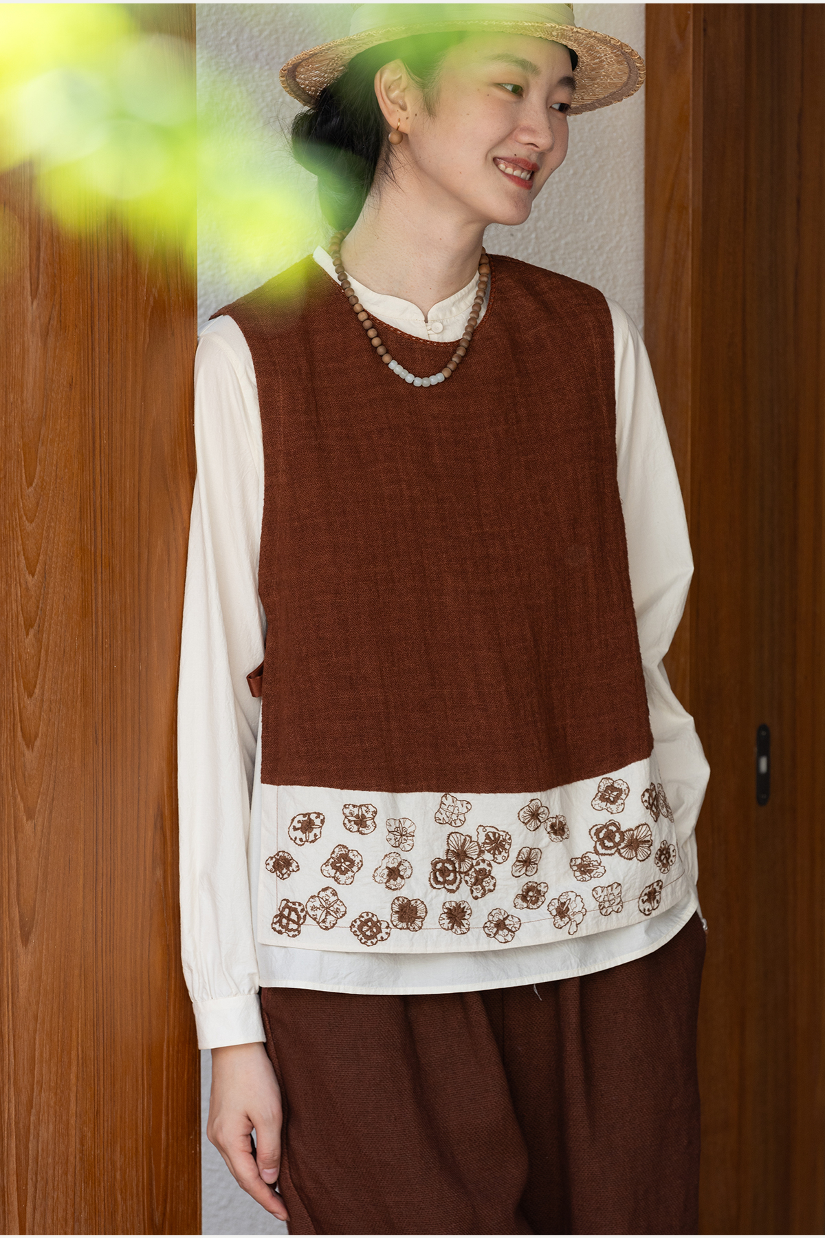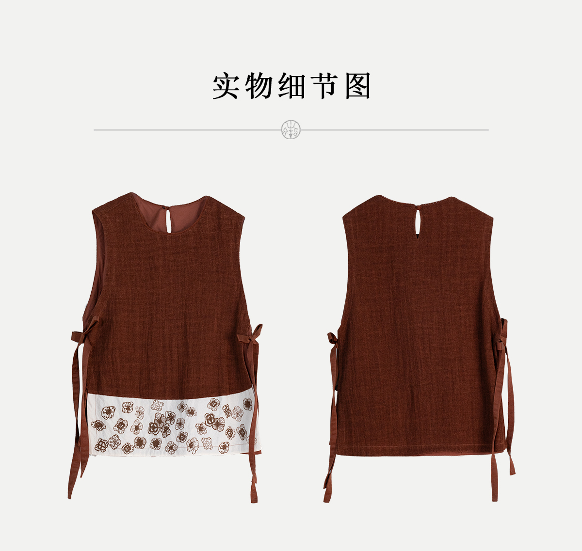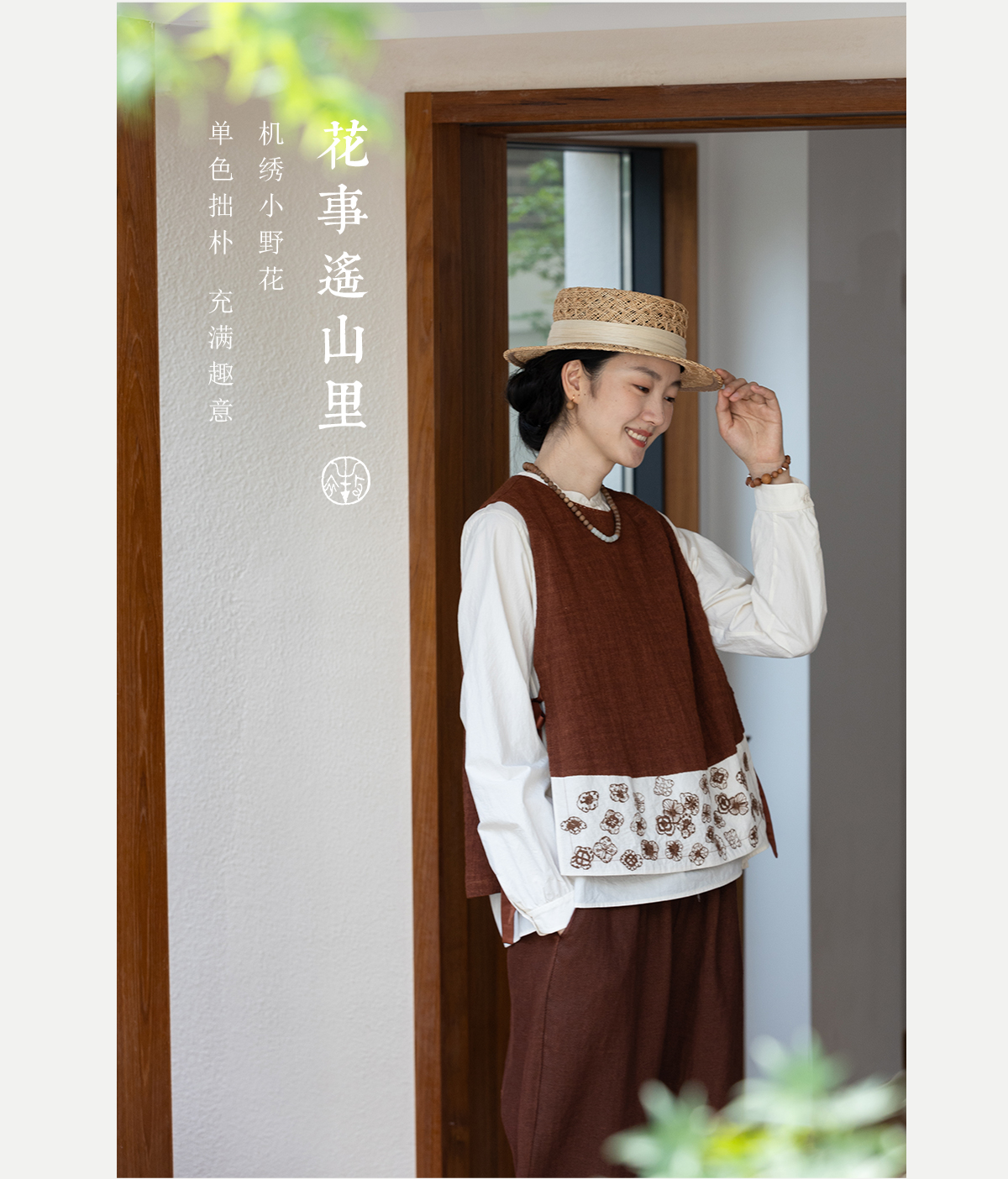 牧衣游原创 炒色机绣亚麻马夹新品设计感古朴撞色系带上衣 知意