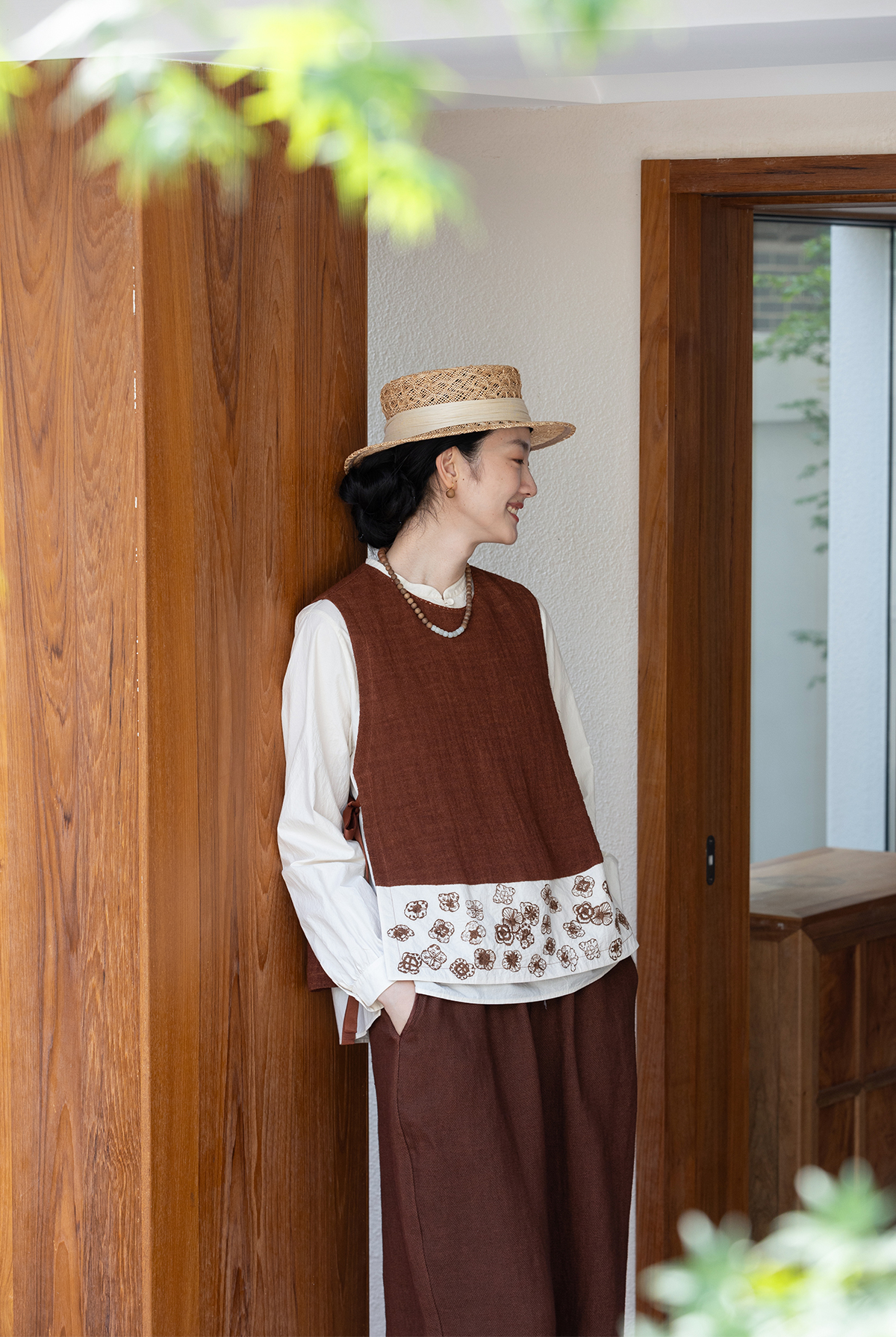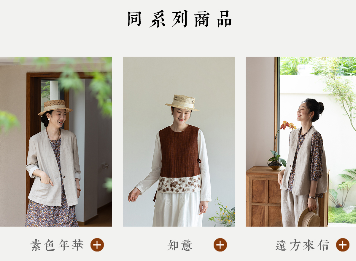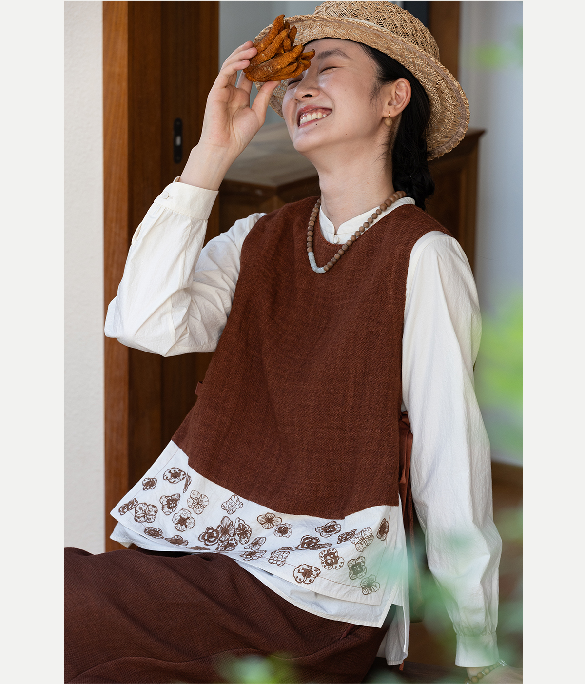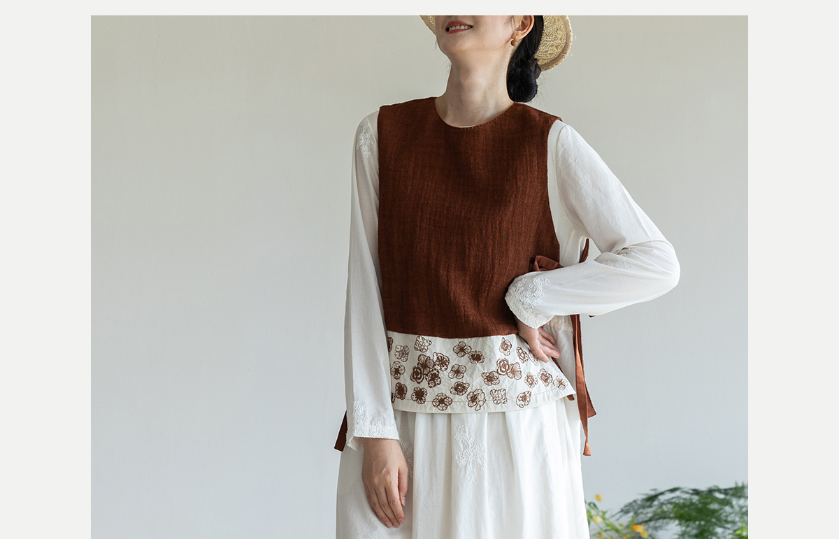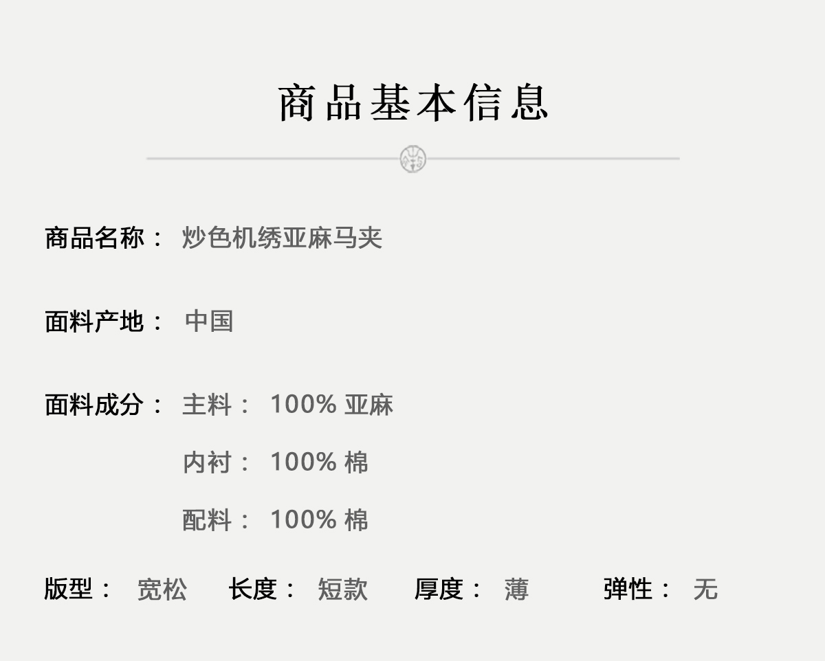 牧衣游原创 炒色机绣亚麻马夹新品设计感古朴撞色系带上衣 知意