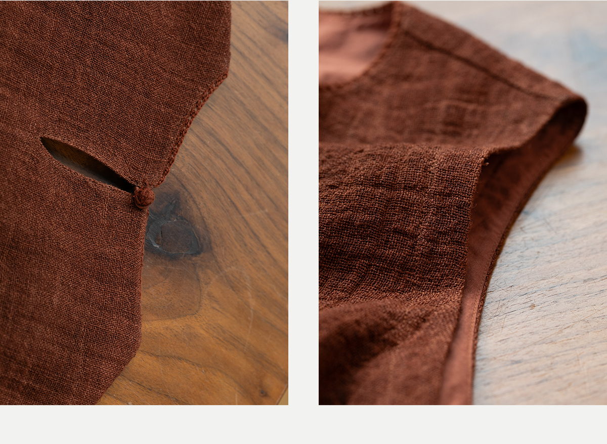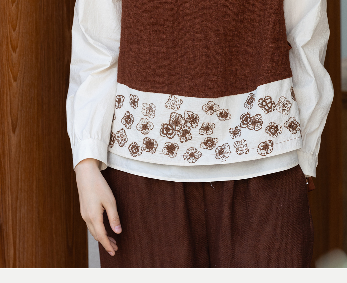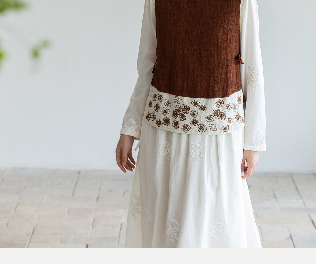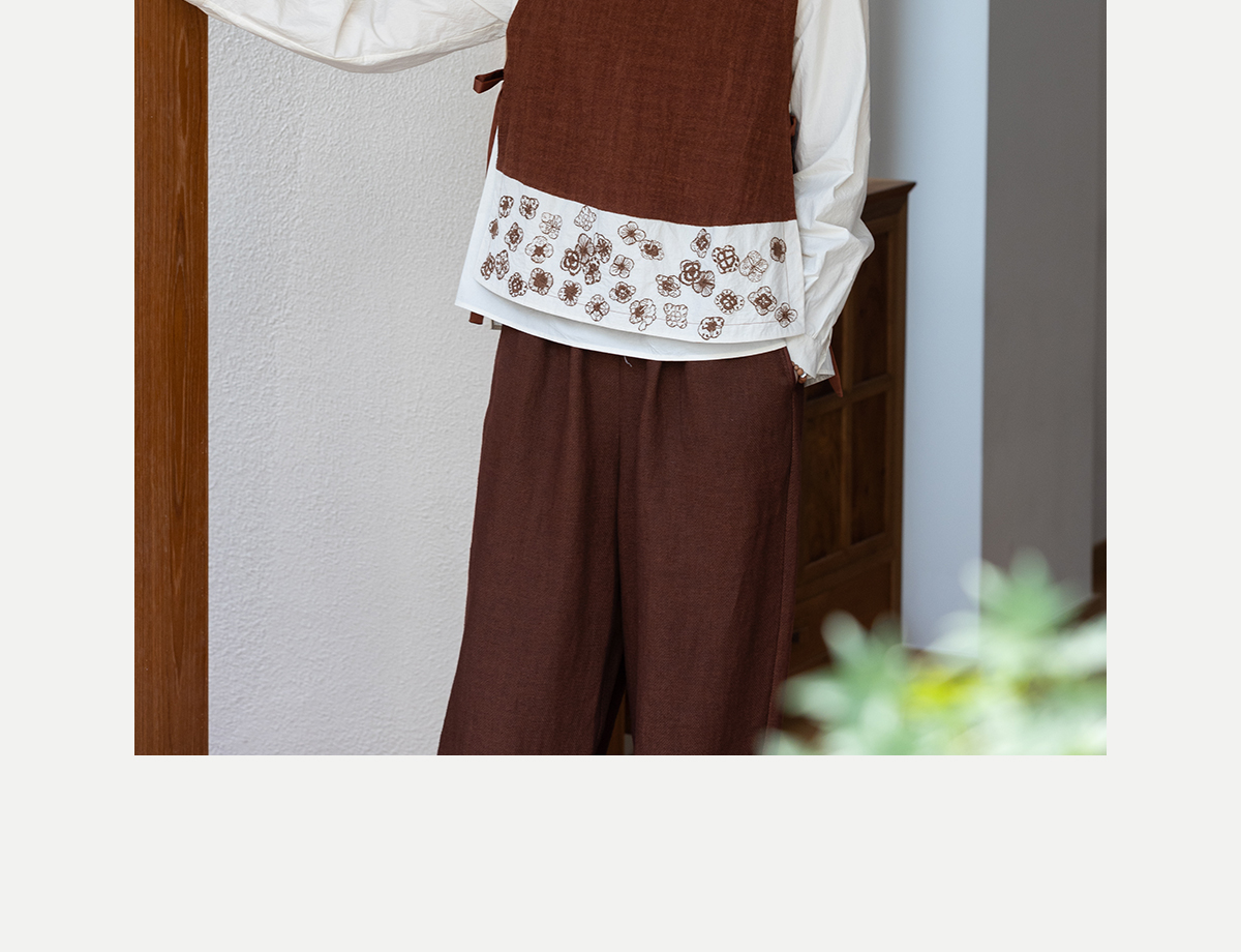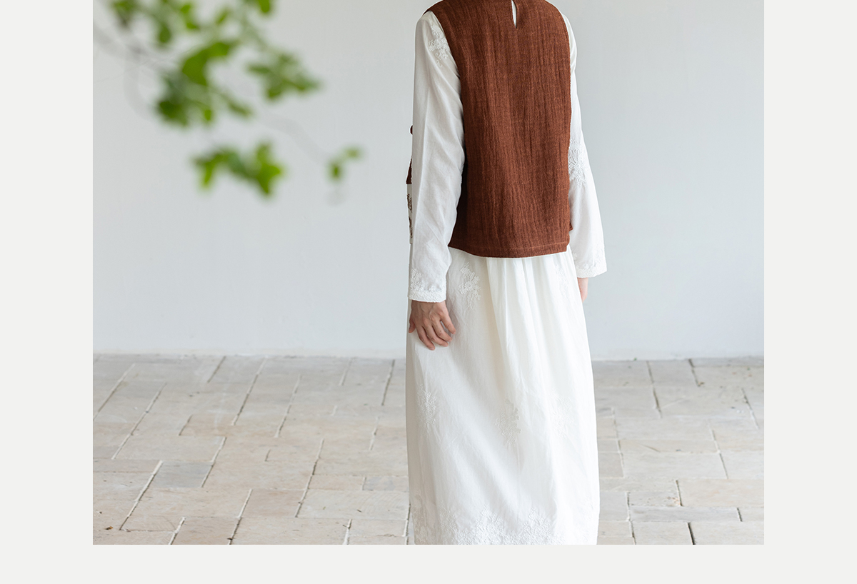 牧衣游原创 炒色机绣亚麻马夹新品设计感古朴撞色系带上衣 知意