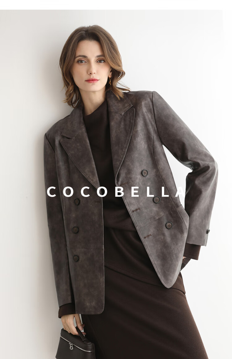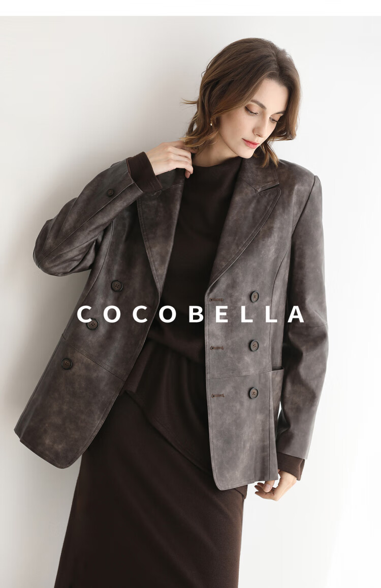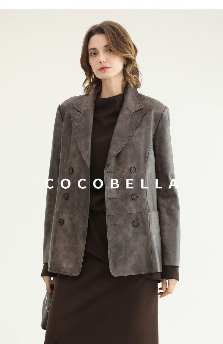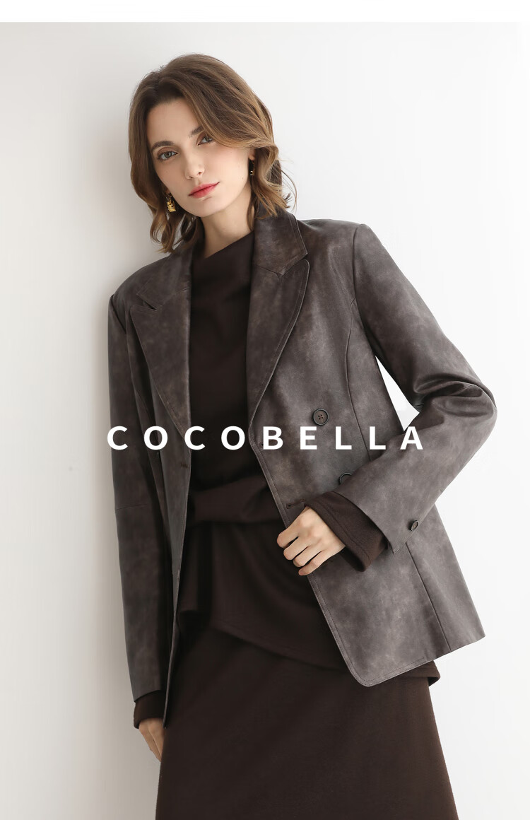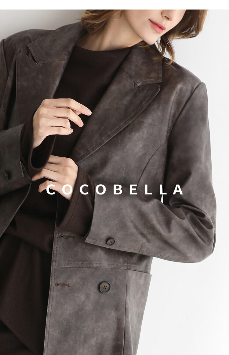 COCOBELLA复古双排扣PU西装手工擦色时尚环保皮衣夹克外套PU3099