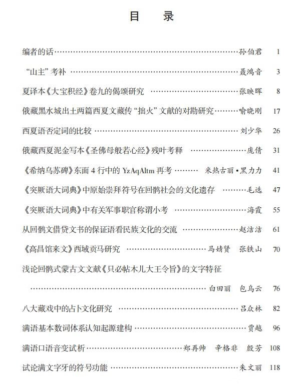 本辑收录论文共19篇,涉及西夏语文研究的5篇、突厥回鹘语文研究的5篇、蒙古语文、藏语文研究的各1篇、满语文研究4篇、察合台文研究的3篇,其中聂鸿音、张铁山先生带领的西夏学、突厥回鹘语文研究学术团队的成果尤为突出。从研究方法上,两位先生尤为注重于民族古文字文献研究中贯彻传统的考据学方法,并着眼于汉语与少数民族语言的接触、影响与互证,把少数民族文字文献的内容纳入传统文献学的大系统。藏文、蒙古文、满语文、察合台文研究的论文也基本遵循了这一研究方法,揭示了民族文献中所蕴含的语言规律和历史文化特征。