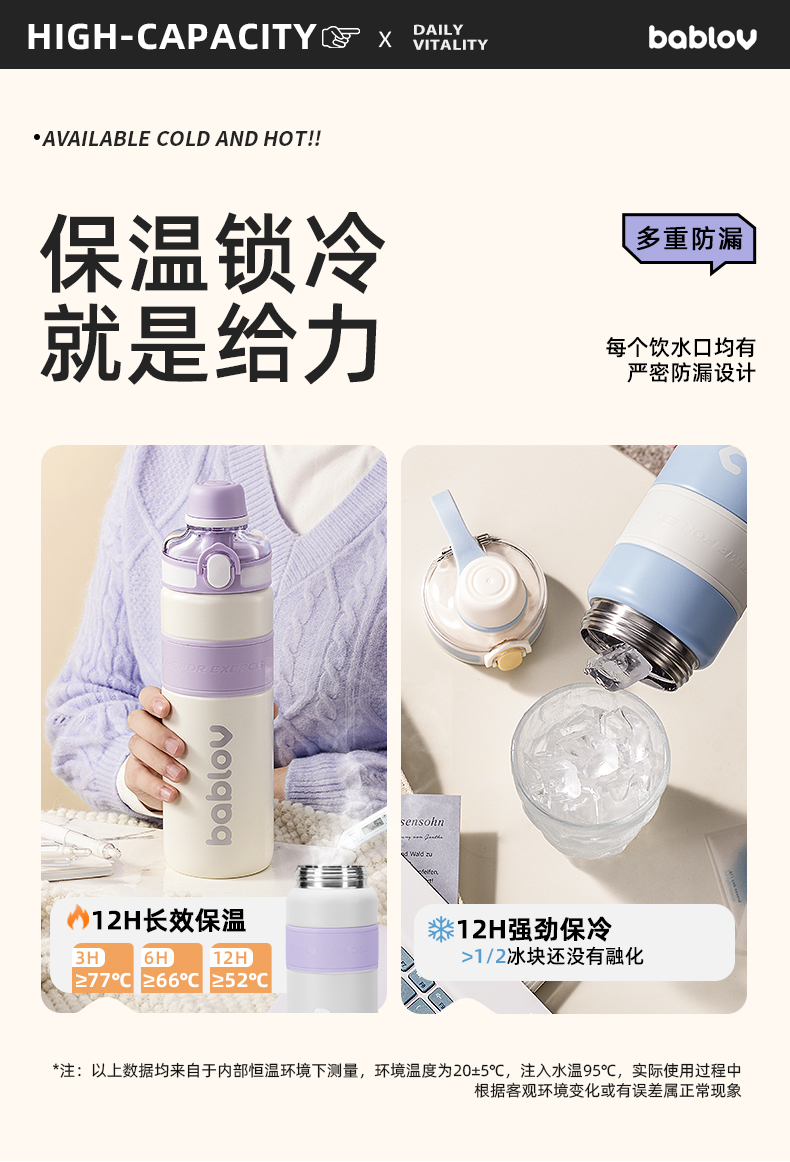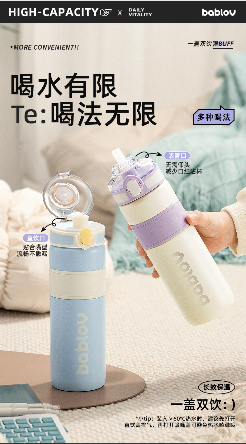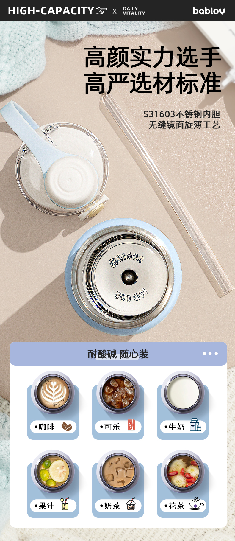 bablov大容量保温杯女学生水杯子儿童带吸管316不锈钢水壶高颜值