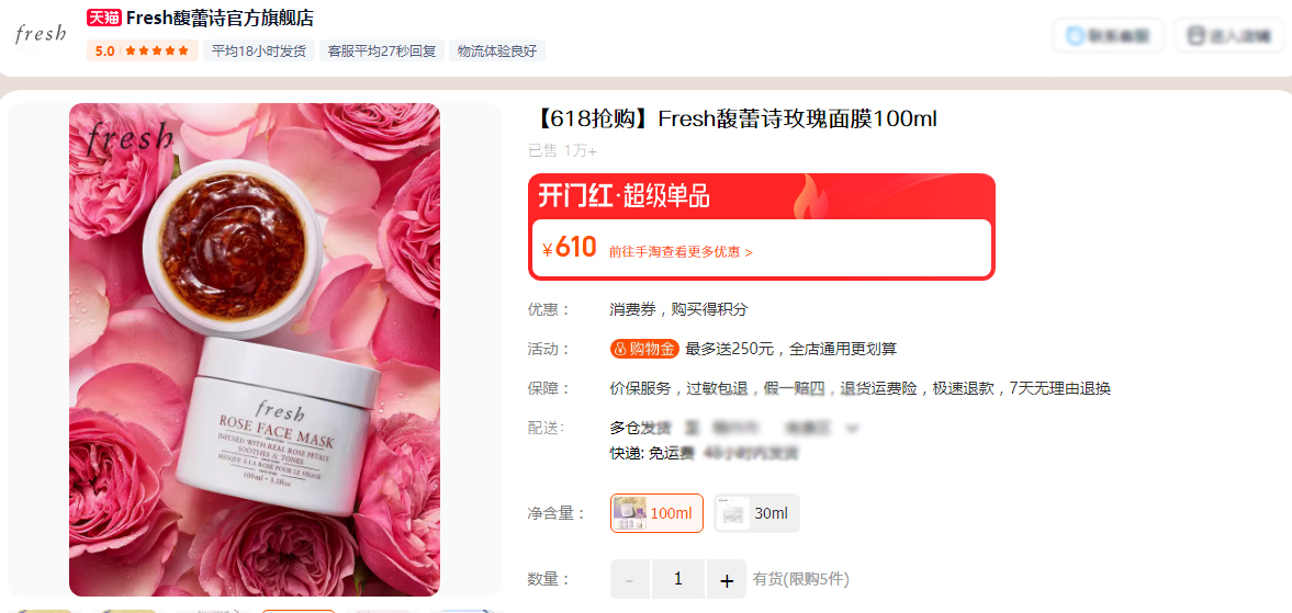 【5.25王炸割肉价】Fresh馥蕾诗玫瑰保湿面膜100ML(限25年4月)