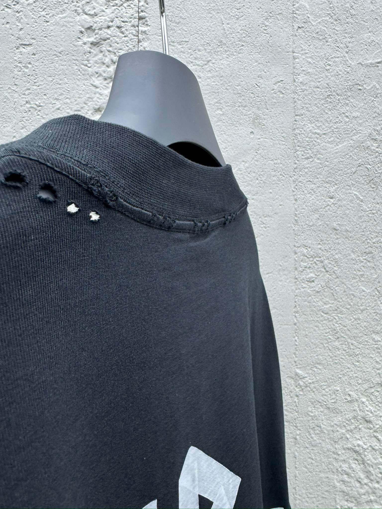 工艺说明: 袖子以及下摆采用磨烂效果  内里处理干净 无线头 无余边  肩部采用磨烂设计  车线平直 三针五线工艺 肩膀处内里带压条 面料采用做旧洗水磨毛工艺  领口部位磨烂破洞设计  罗纹面料定织定染色 颜色一致无色差 胸前运用美纹纸胶带字母  整体重工艺的工序 水洗面料 舒适柔软 磨损洗旧效果 背后字母采用人工对位用烫版定型做胶浆印花工艺