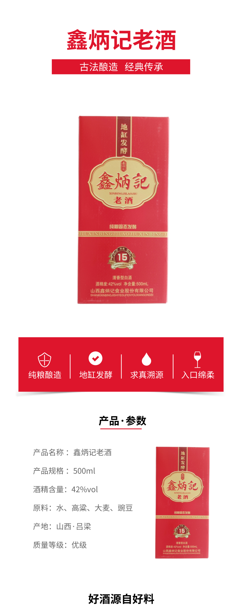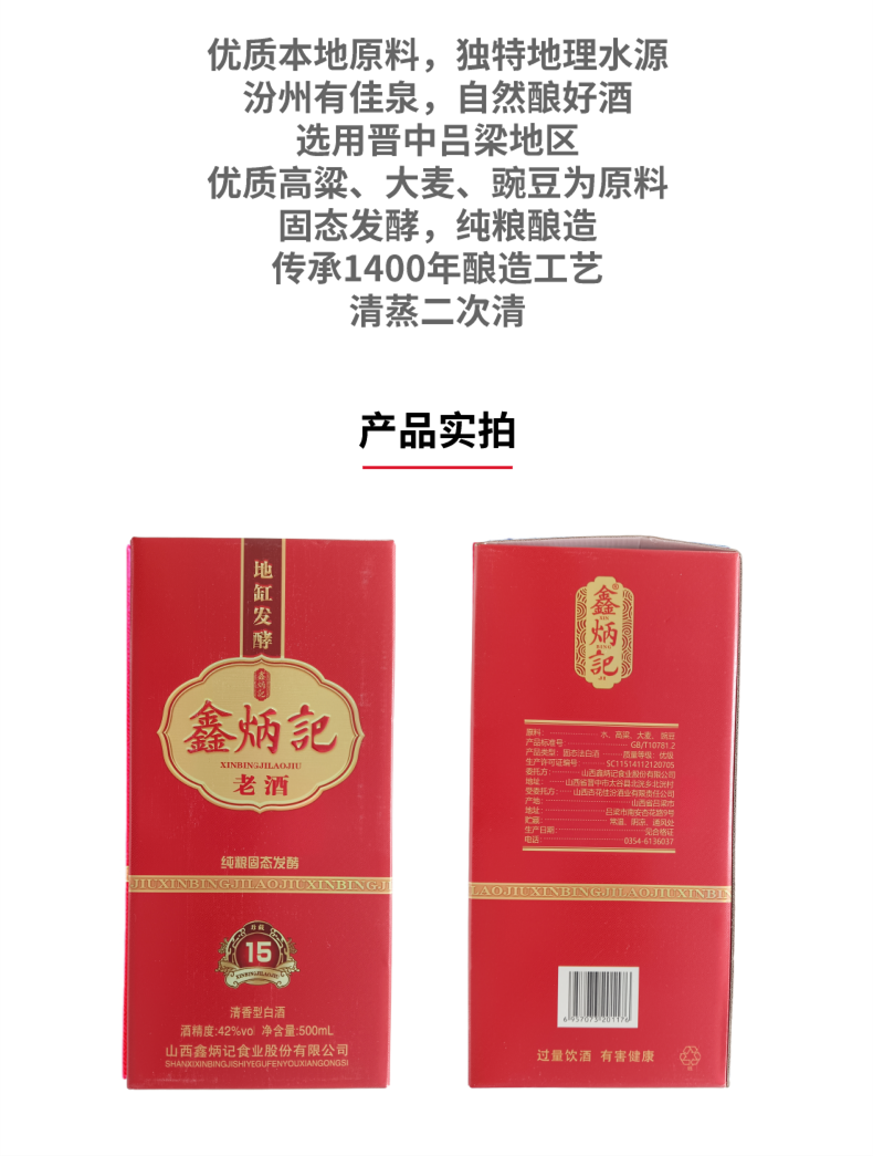鑫炳记老酒15年陈酿500ML清香型42度国产白酒纯粮酿造
