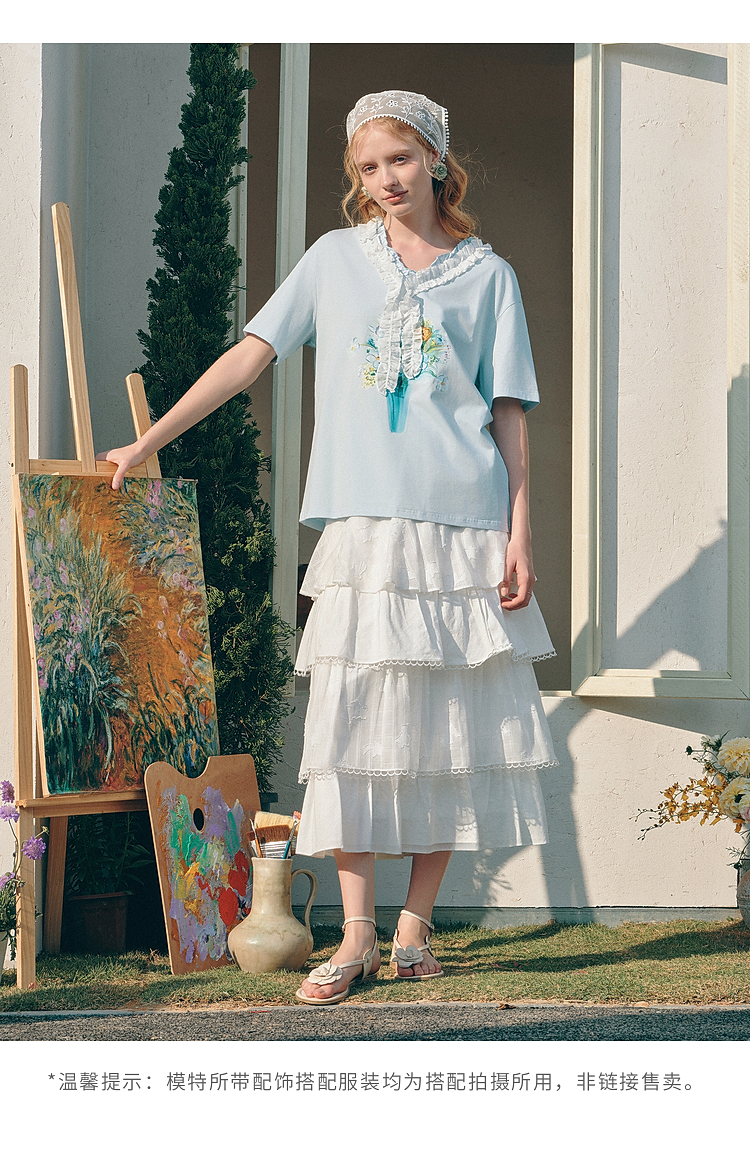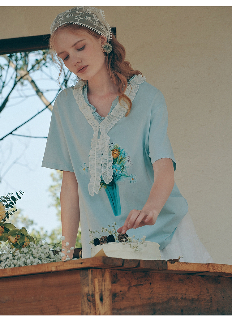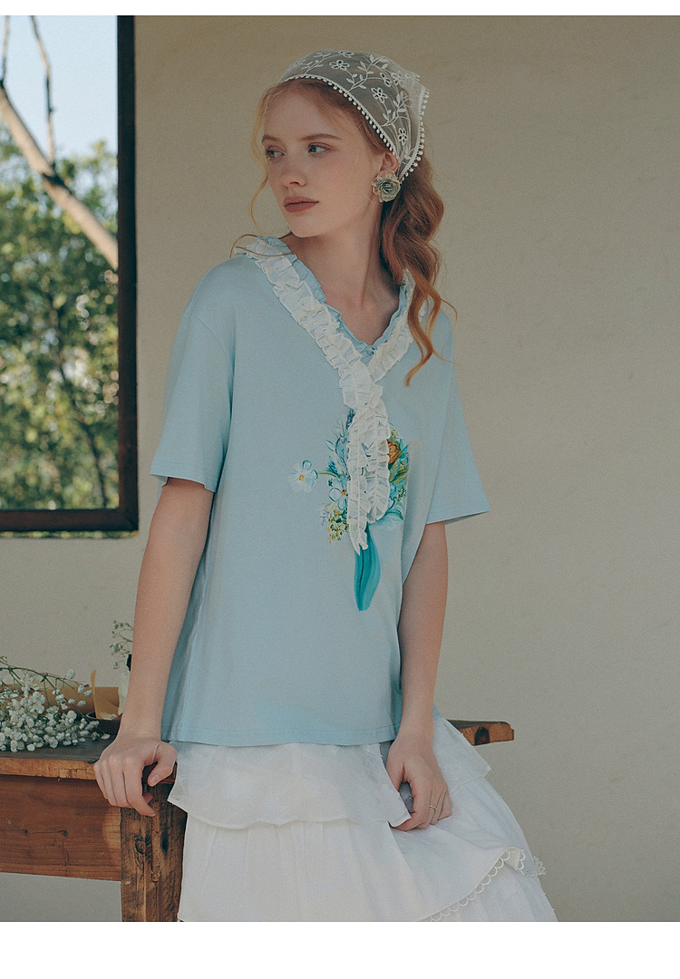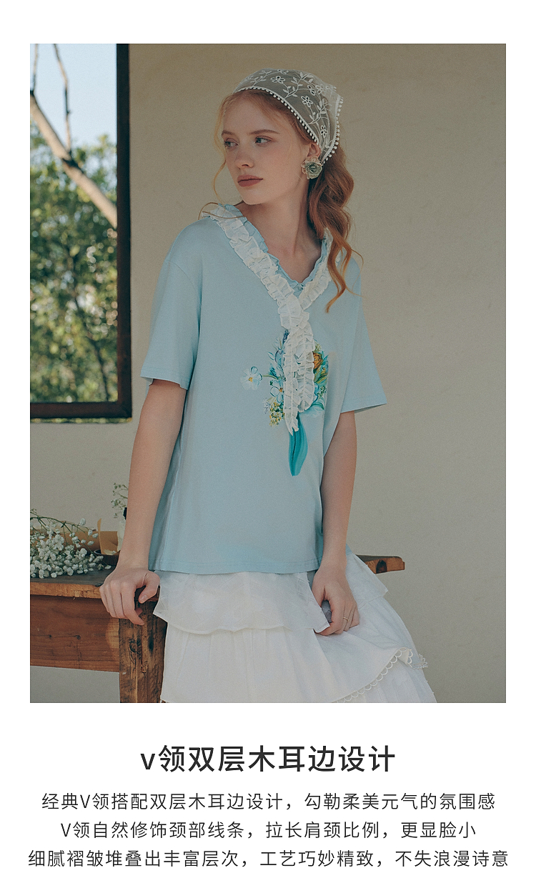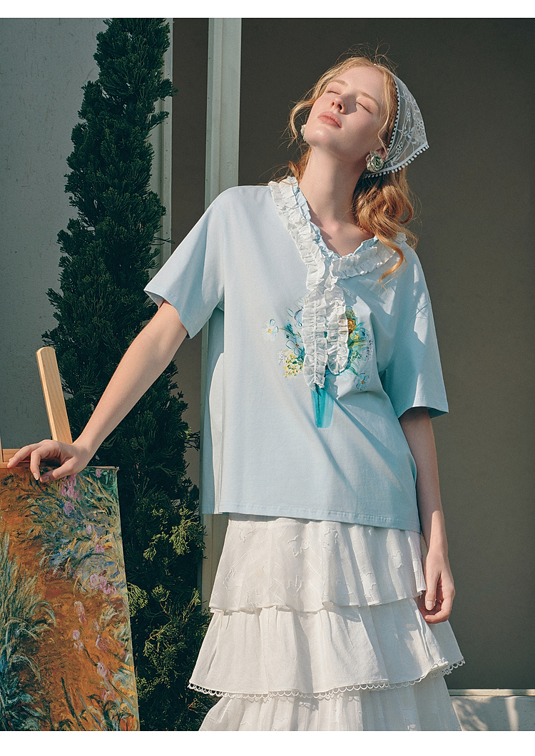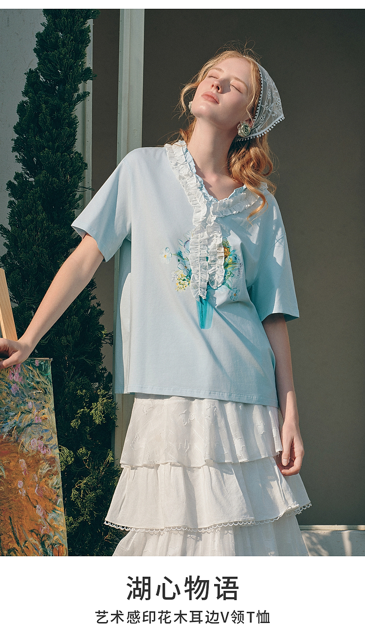 两三事梵高文艺 湖心物语 2026春季新款小清新木耳边v领印花t恤女