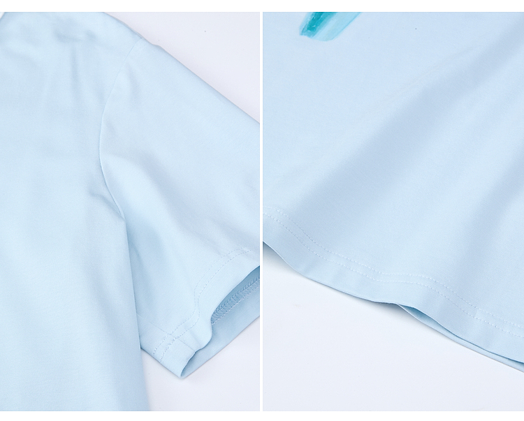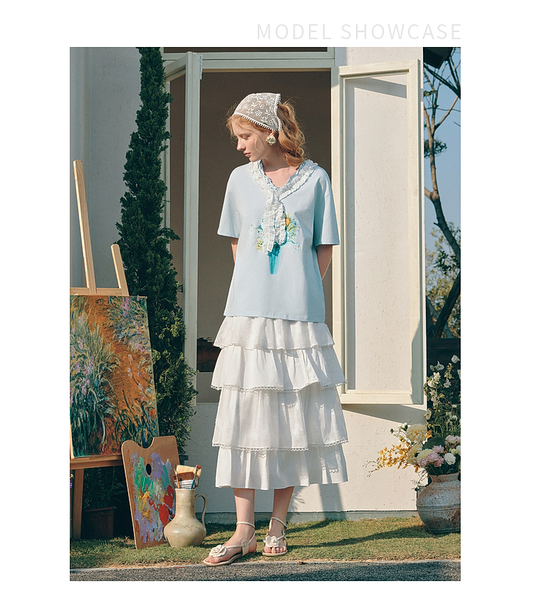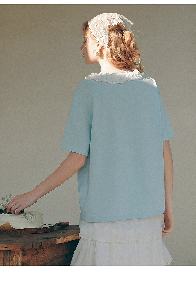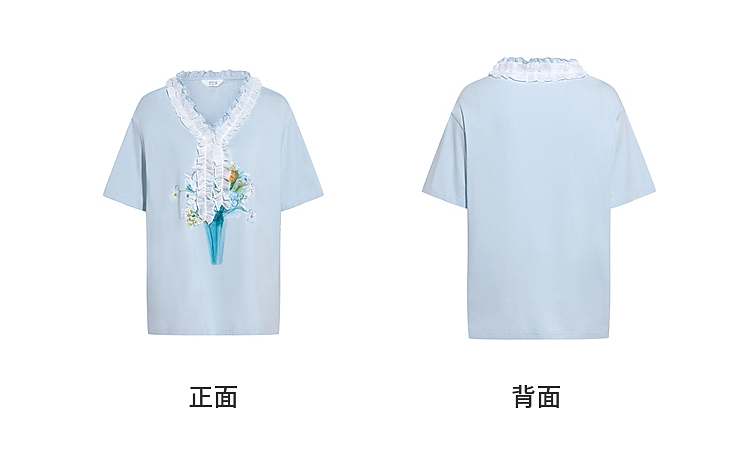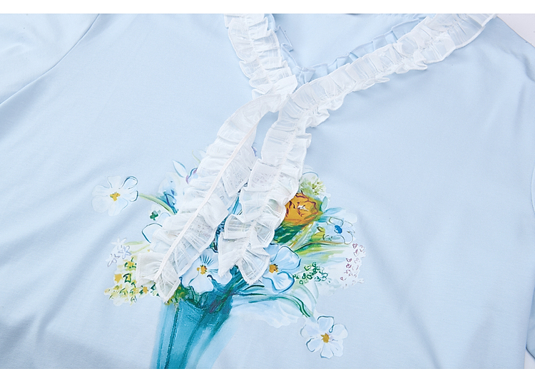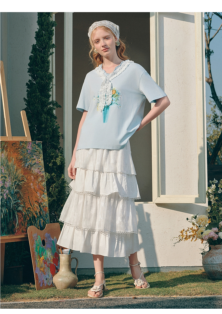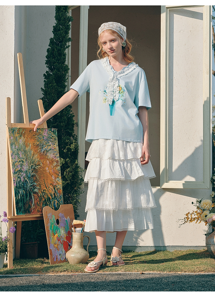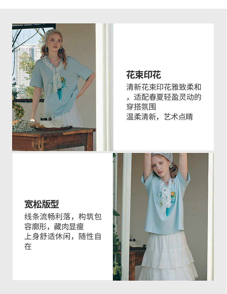 两三事梵高文艺 湖心物语 2026春季新款小清新木耳边v领印花t恤女