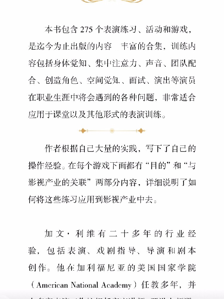 2、作者基于二十多年的表演、戏剧指导、导演和剧本创作的经验,对各种游戏进行调整、修改使其适应表演训练的需要,涵盖了从热身、建立舞台空间意识,到戏剧呈现、面试演出各个环节。