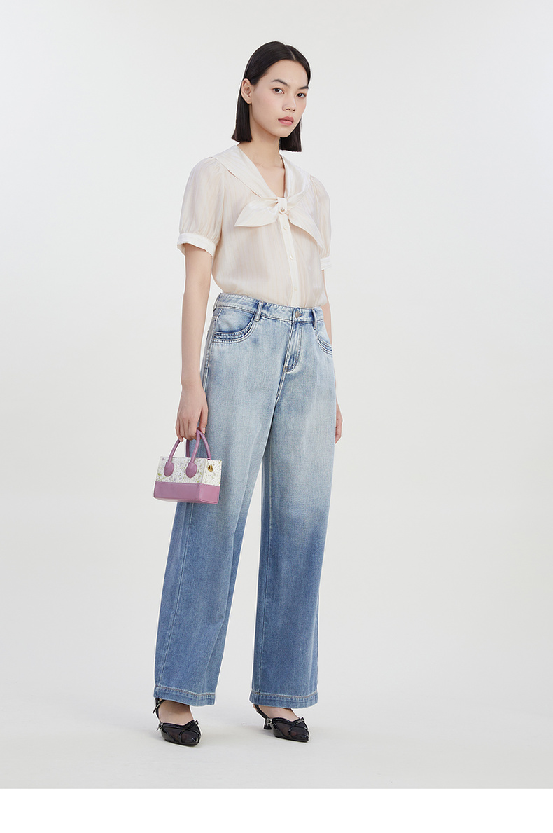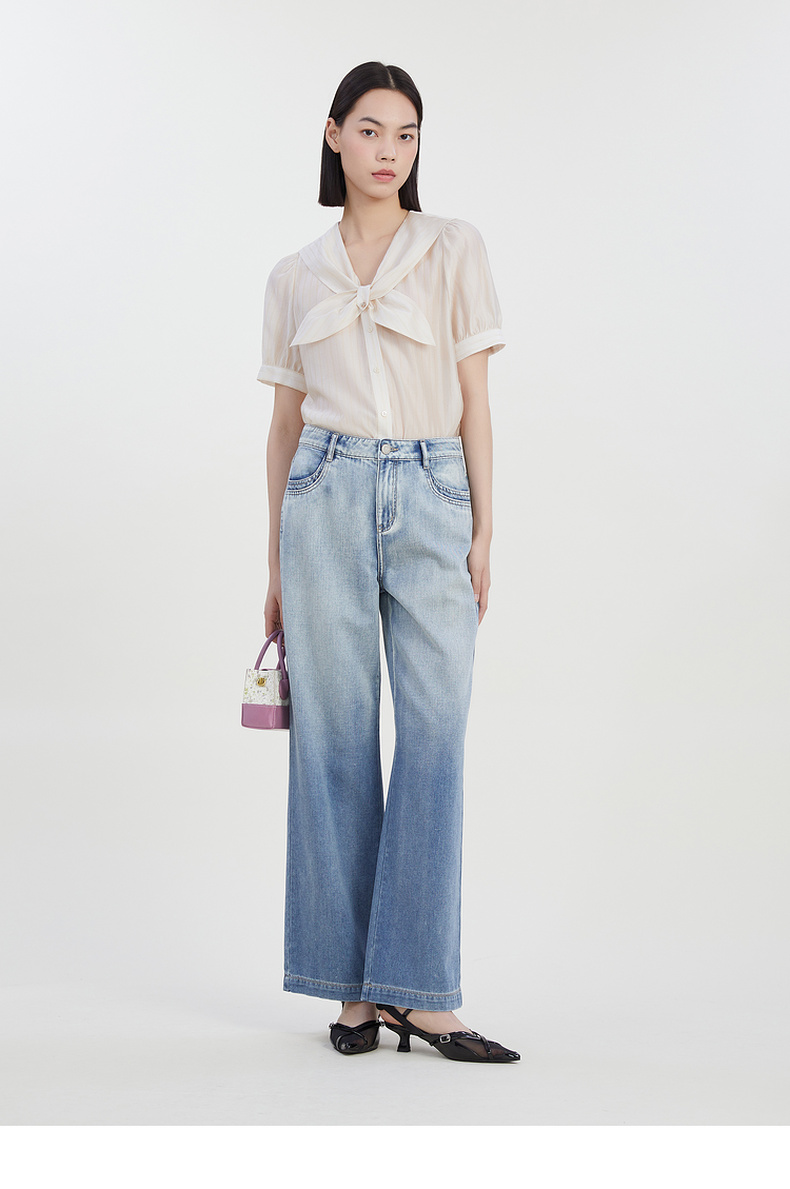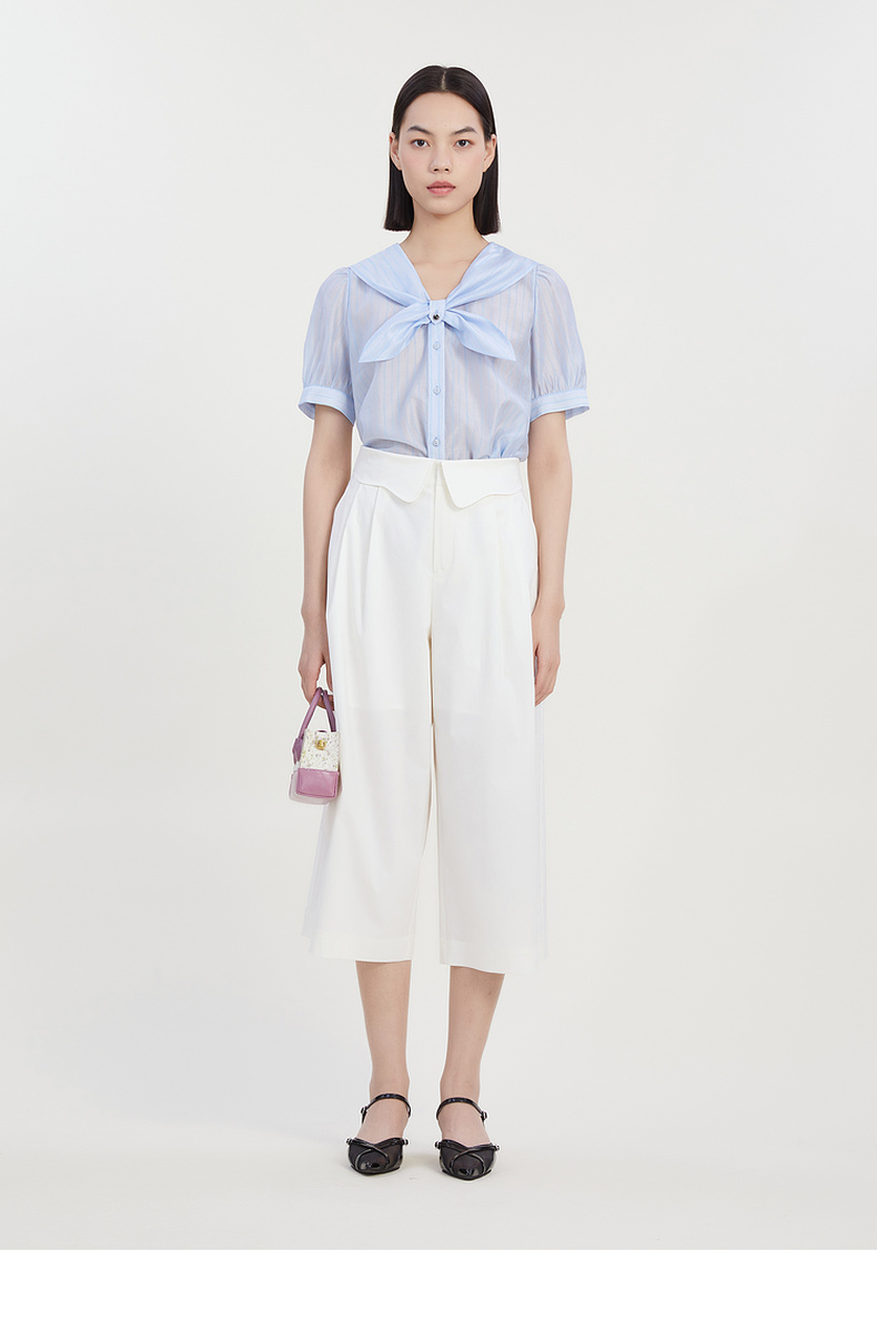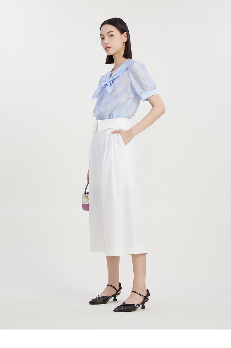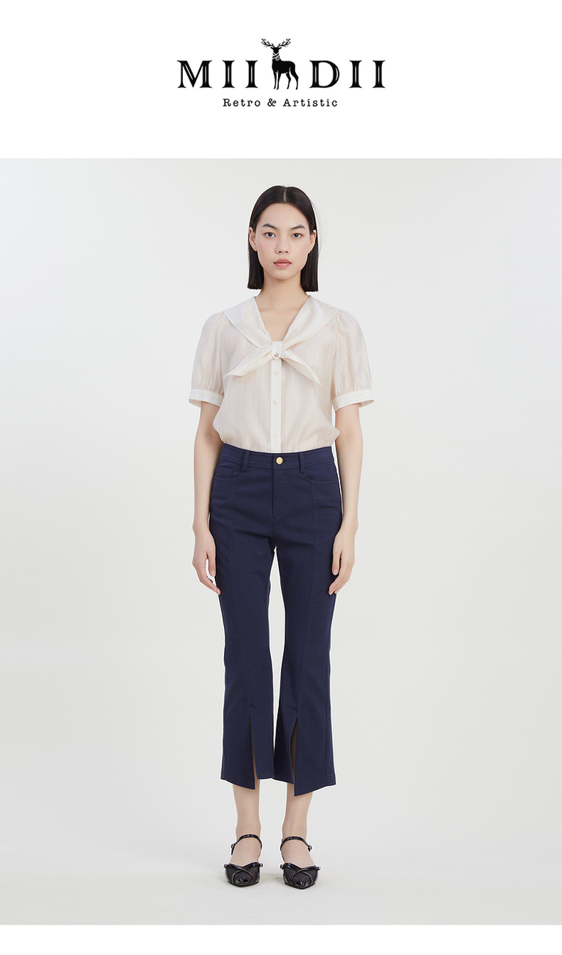 谜底气质系带圆领天丝衬衫短袖女2023夏款通勤修身衬衣232MC0695