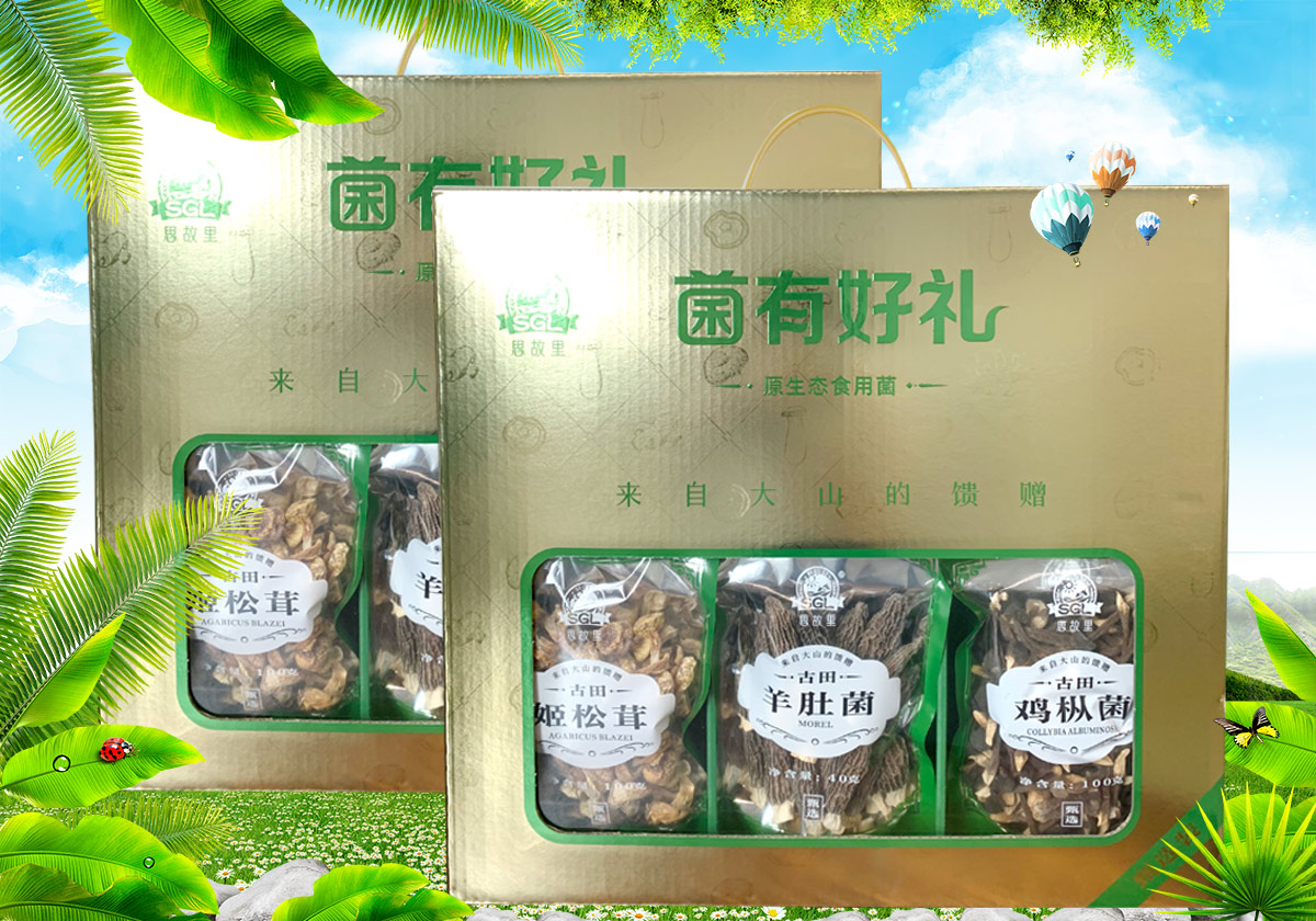 礼盒内含:竹荪20克、鸡枞菌100克、羊肚菌40克、姬松茸100克、鹿茸菇100克、金钱菇100克