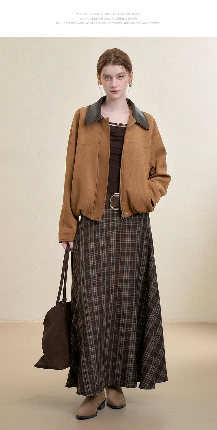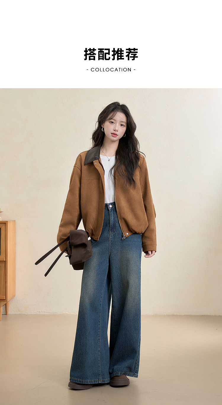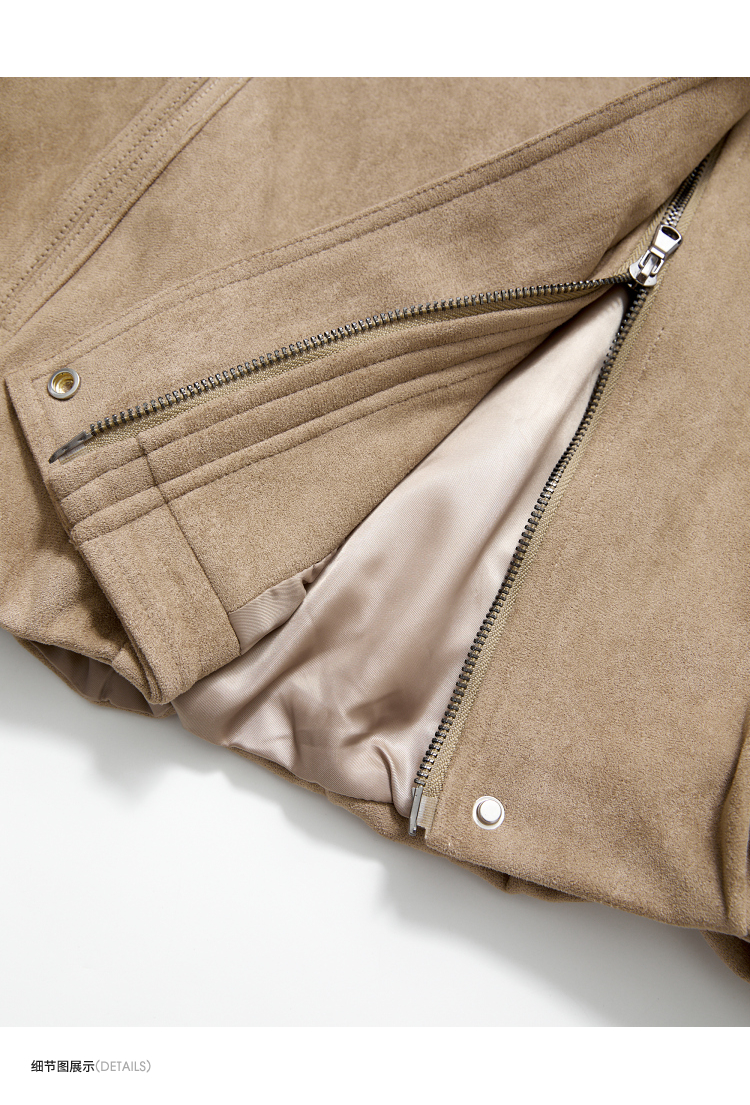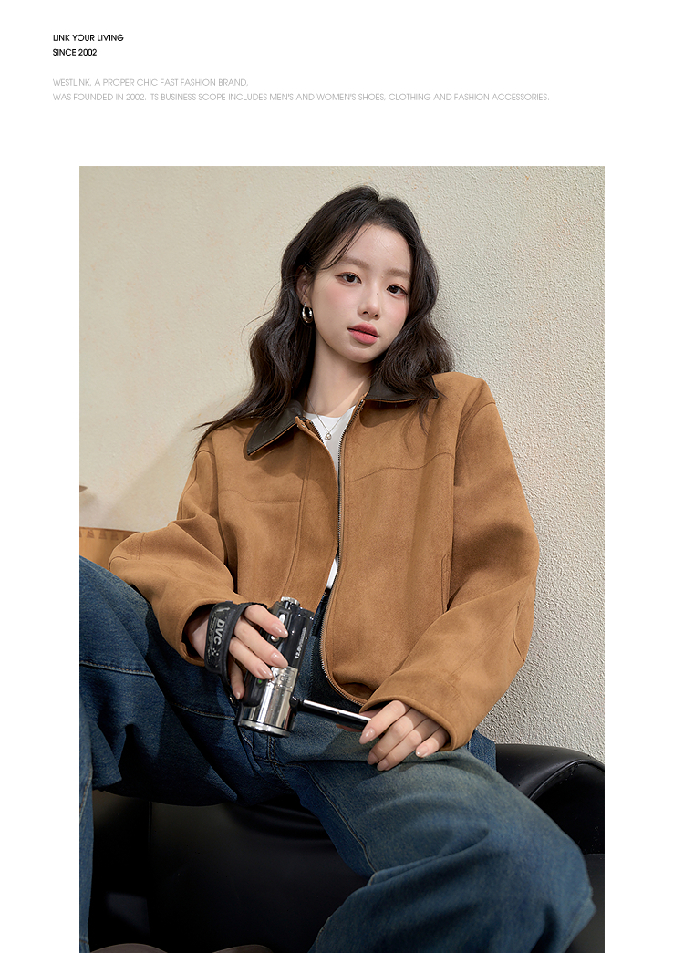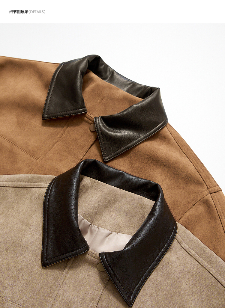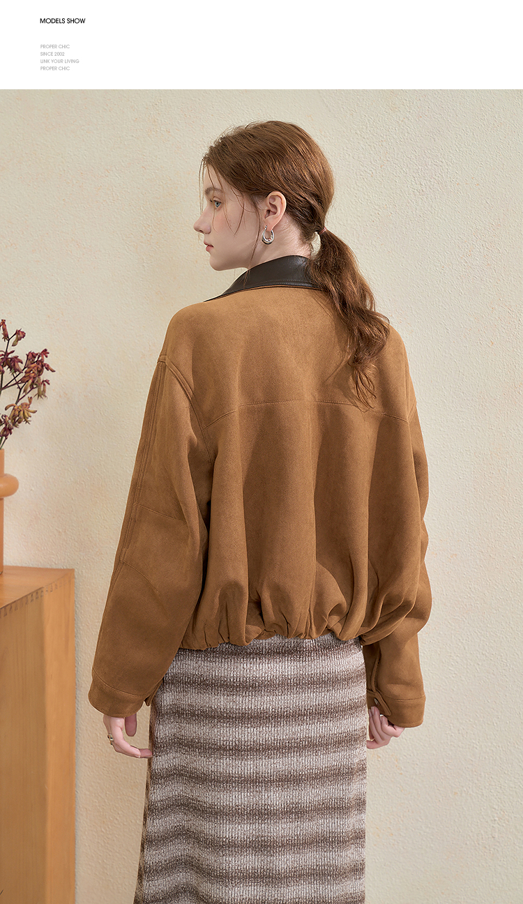 西遇美式复古麂皮外套女秋季新款美拉德撞色翻领休闲夹克外套H0055234