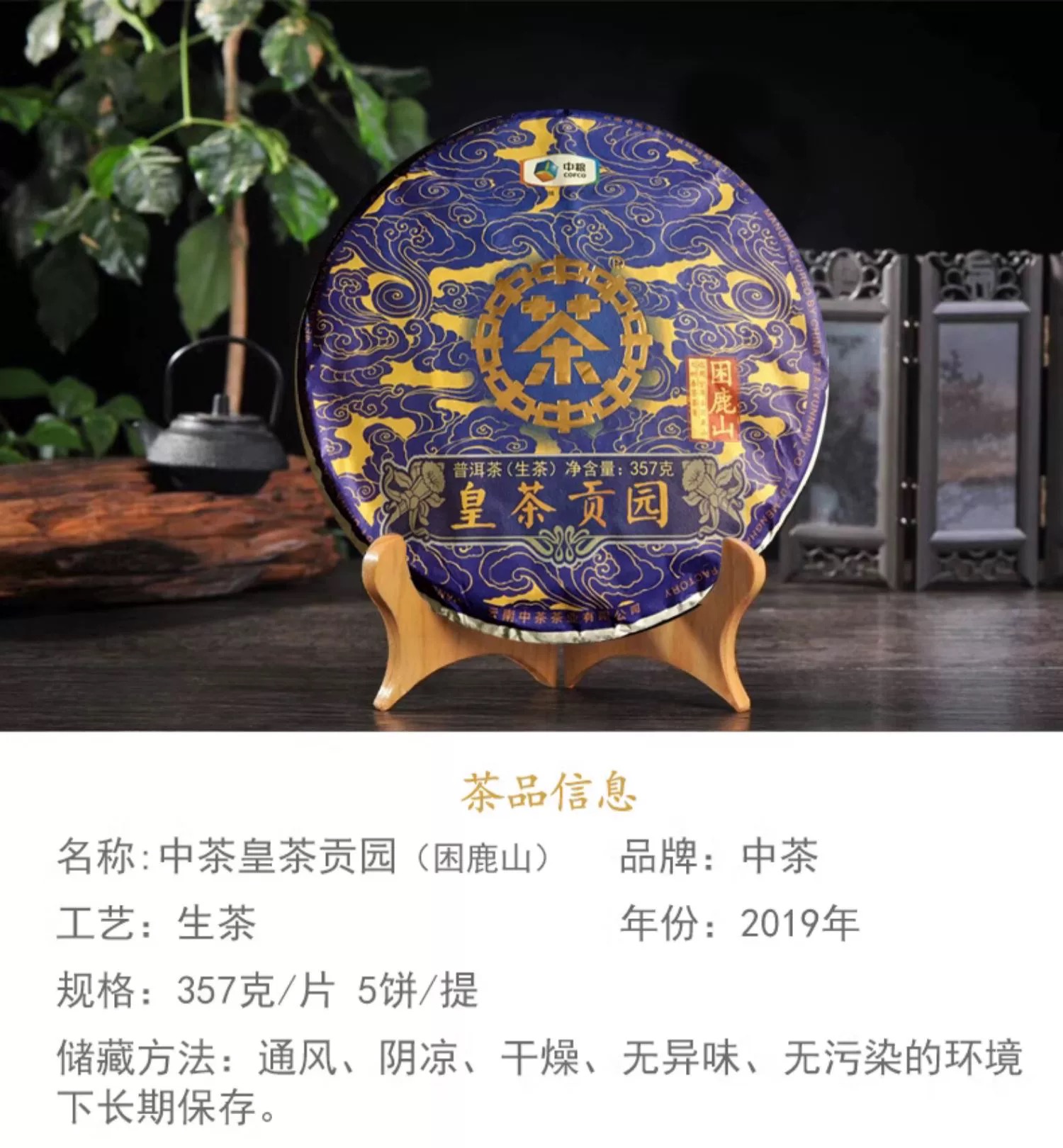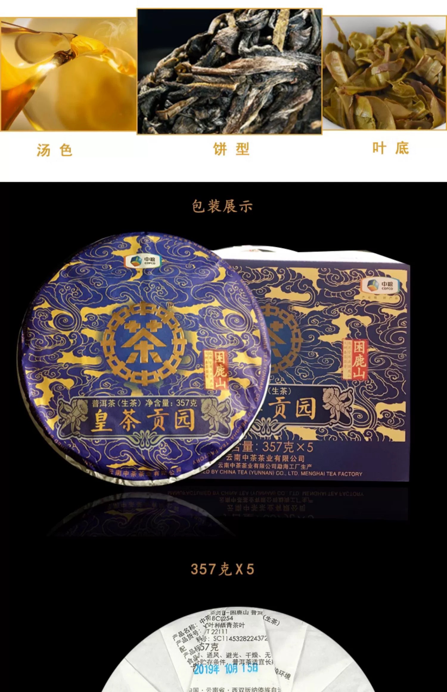 中粮-中茶 2019年中茶皇茶贡园-困鹿山生茶 357g/饼 /云南干仓直发