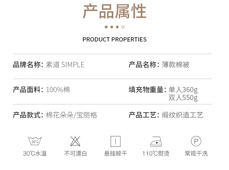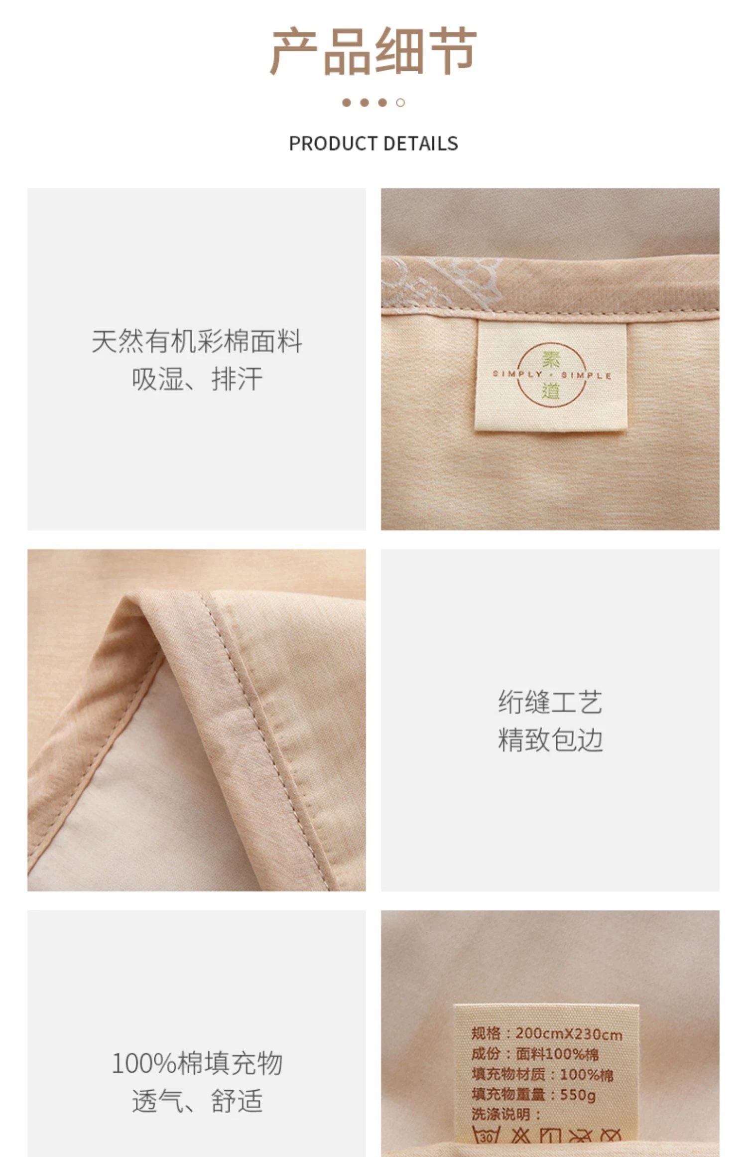 【有机彩棉】素道 夏凉被 透气不闷热 色泽如丝 柔软细腻 亲肤又贴身 给您温柔的肌肤触碰感 成分:100%棉 填充物重量:单人薄被360g,双人薄被550g 柔软触感 不染色 不漂白