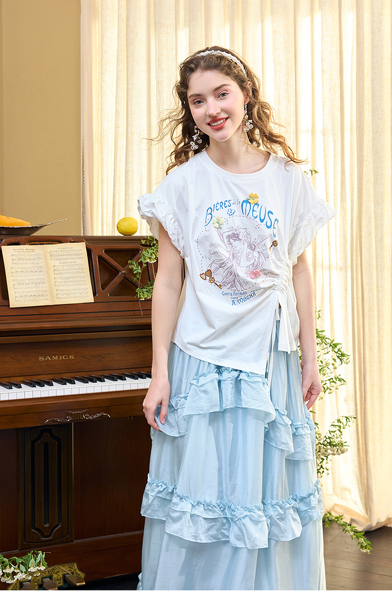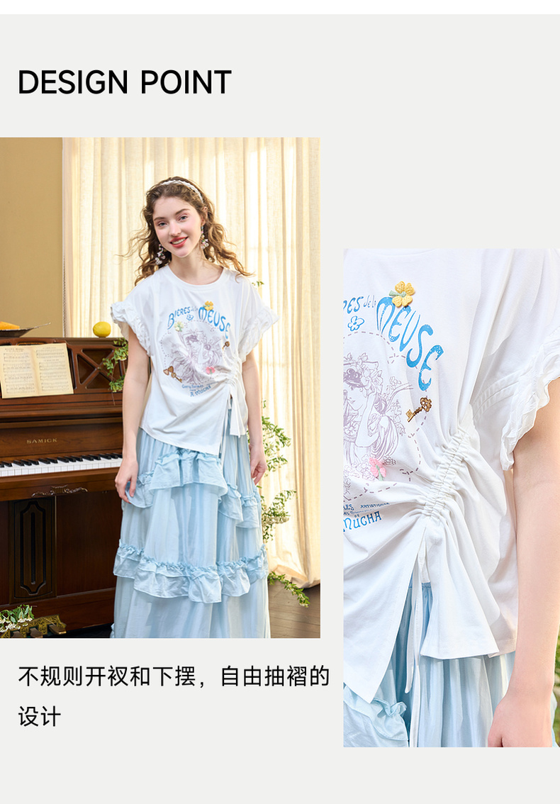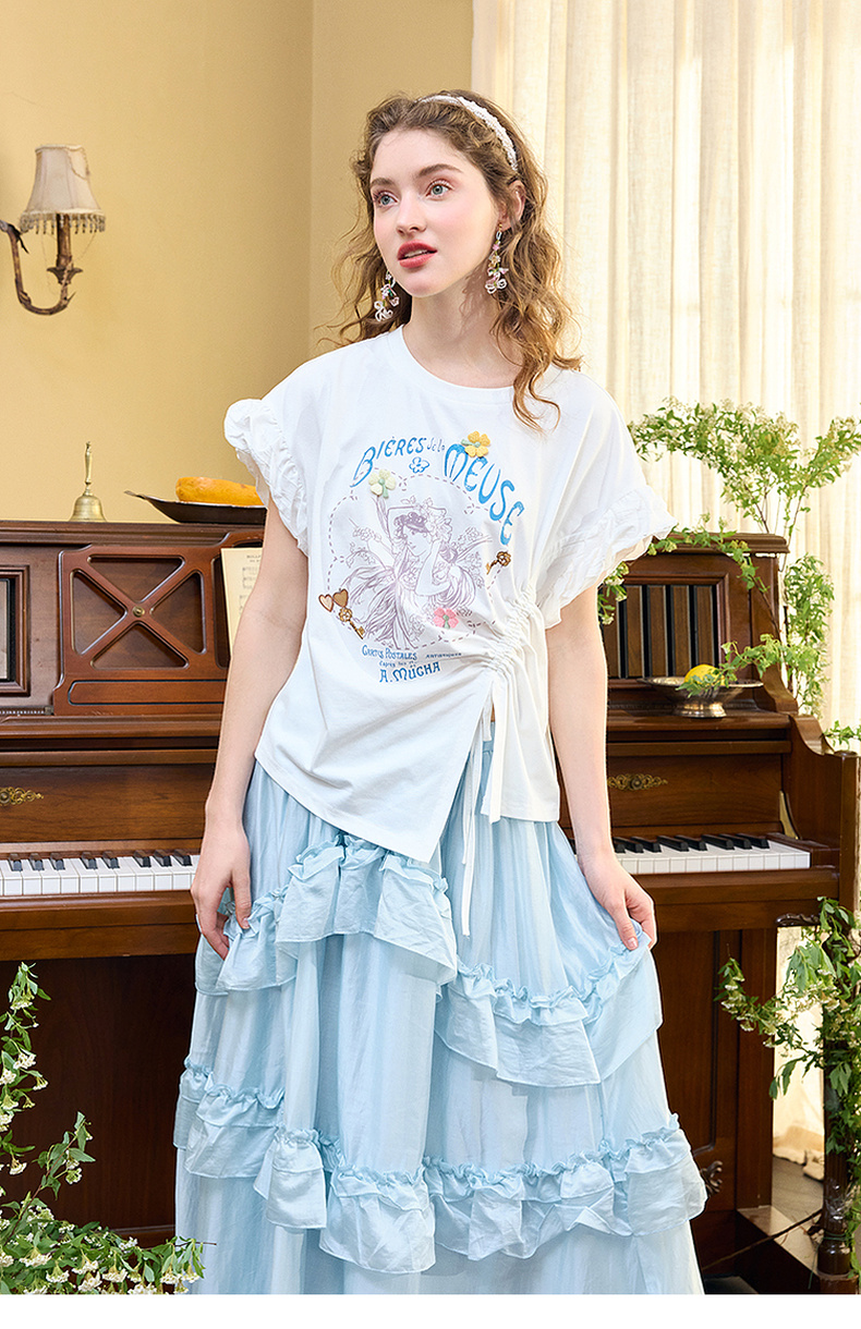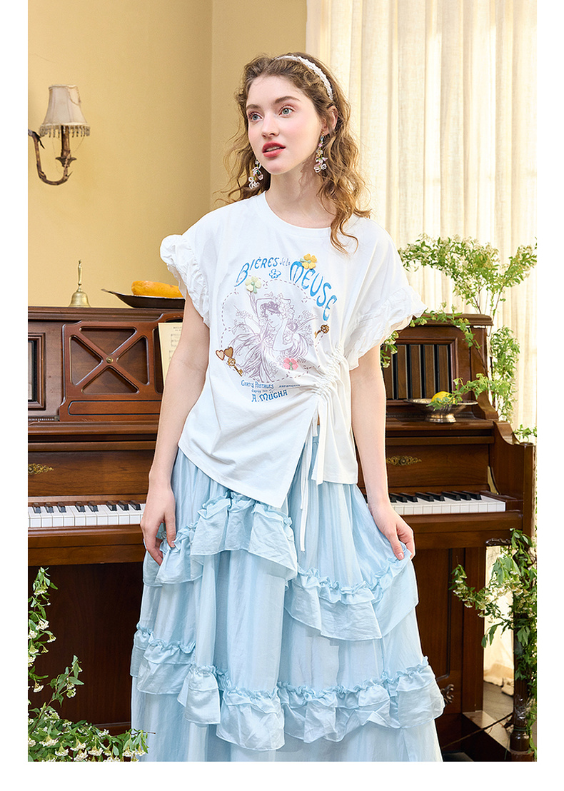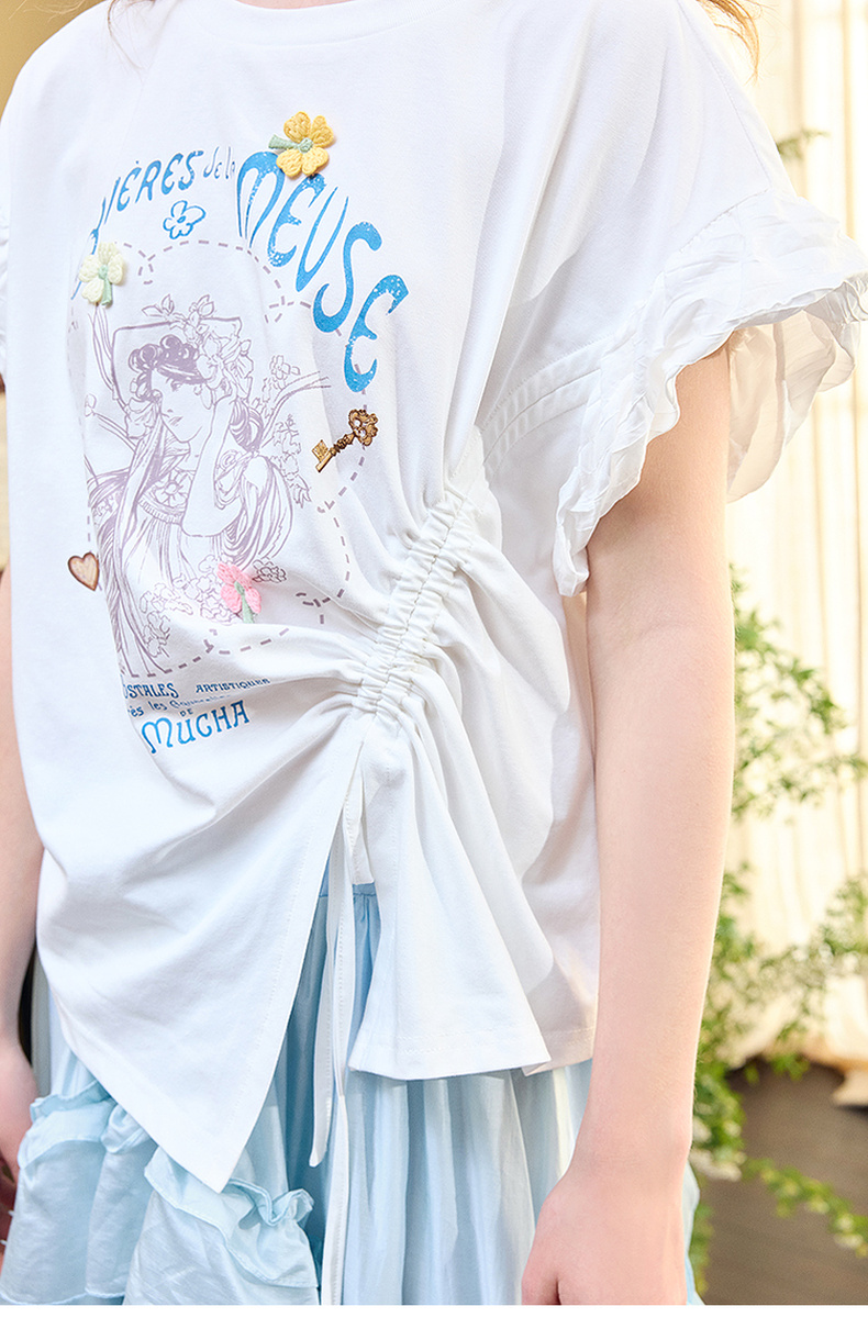 两三事四果冰2024夏季新款小清新印花立体装饰抽绳花边短袖t恤女