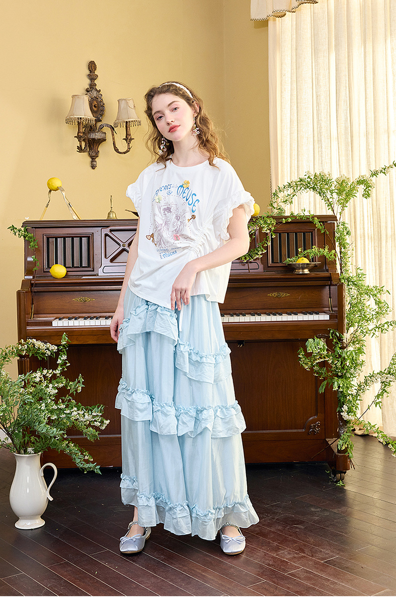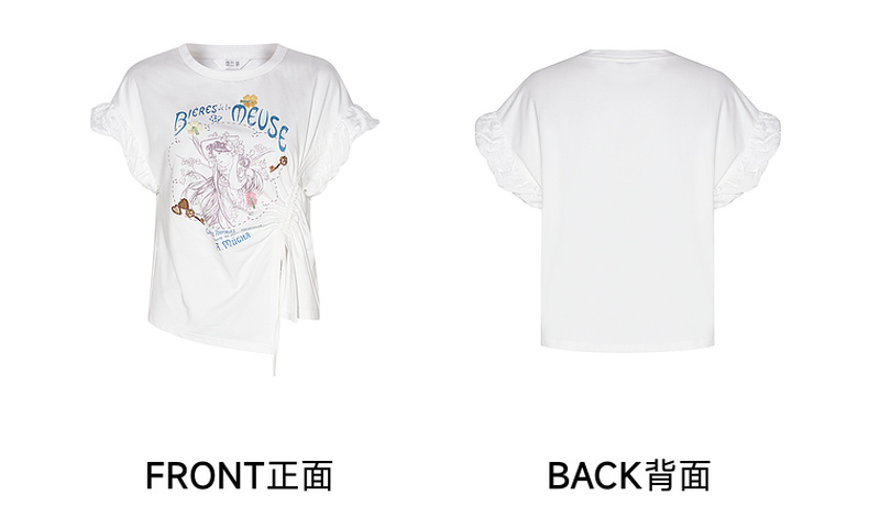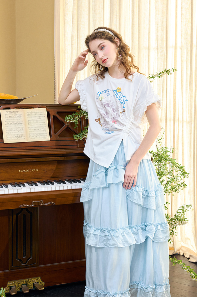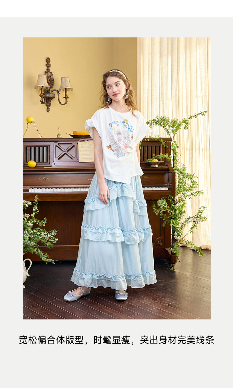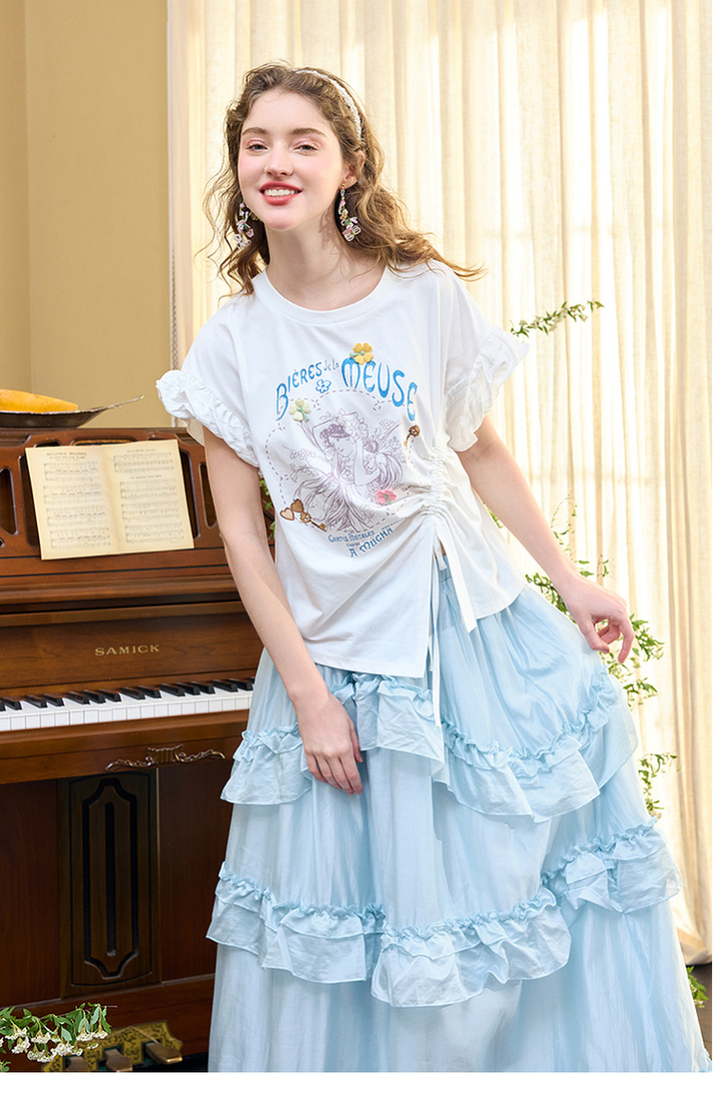 两三事四果冰2024夏季新款小清新印花立体装饰抽绳花边短袖t恤女