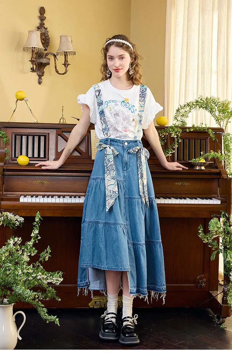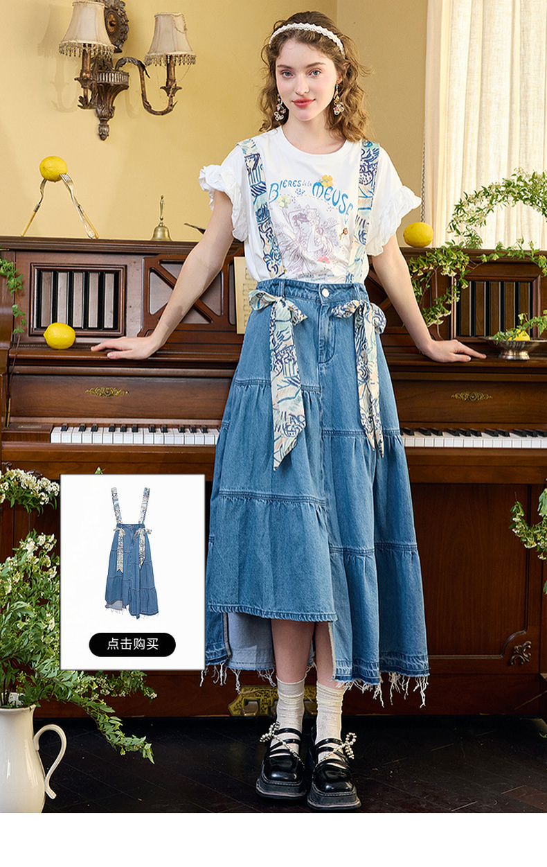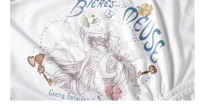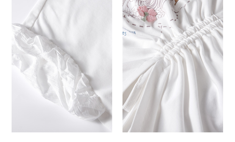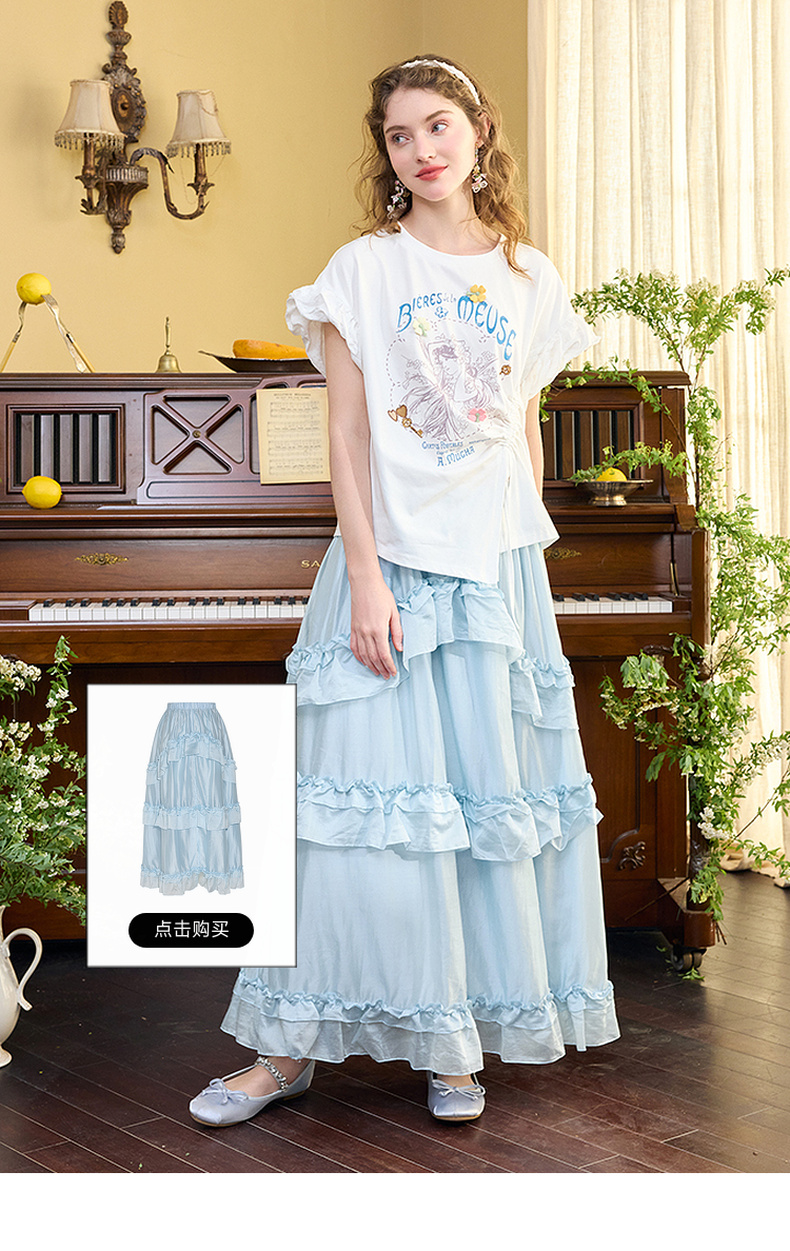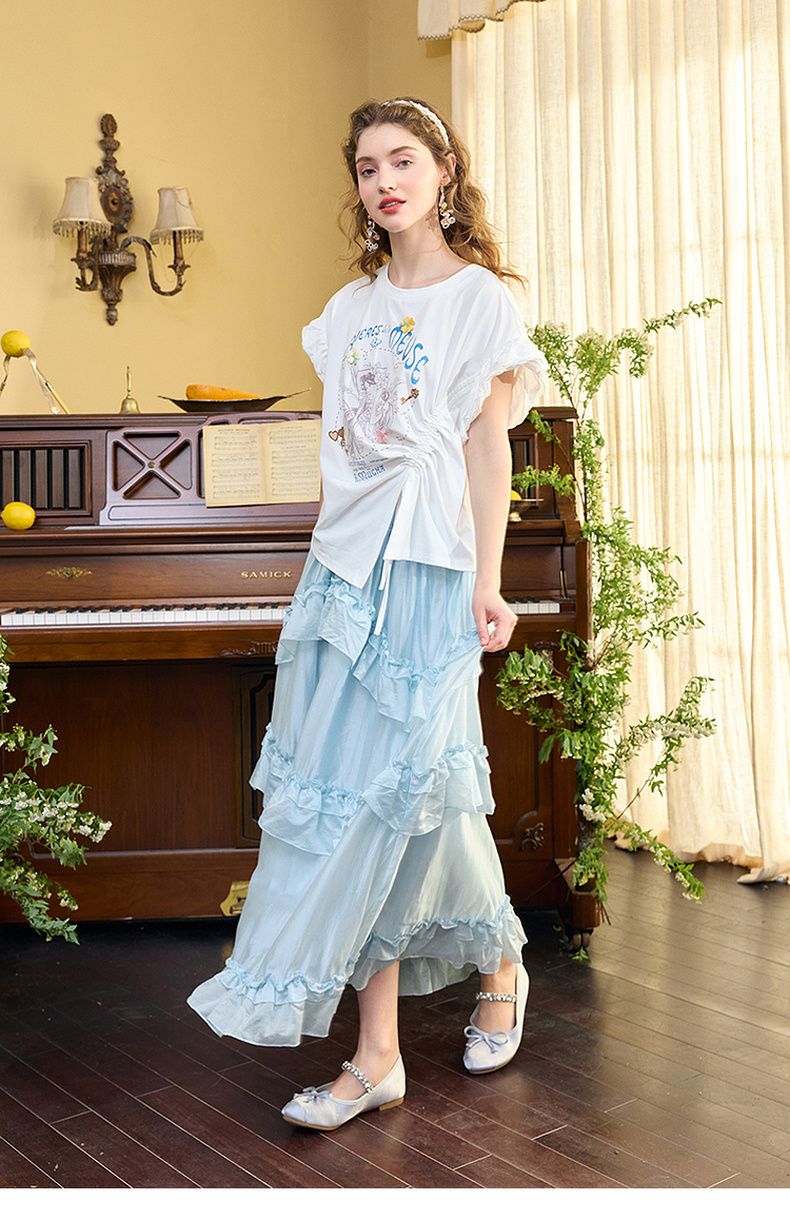 两三事四果冰2024夏季新款小清新印花立体装饰抽绳花边短袖t恤女