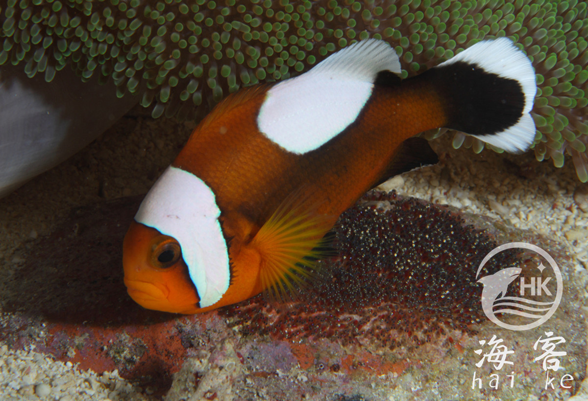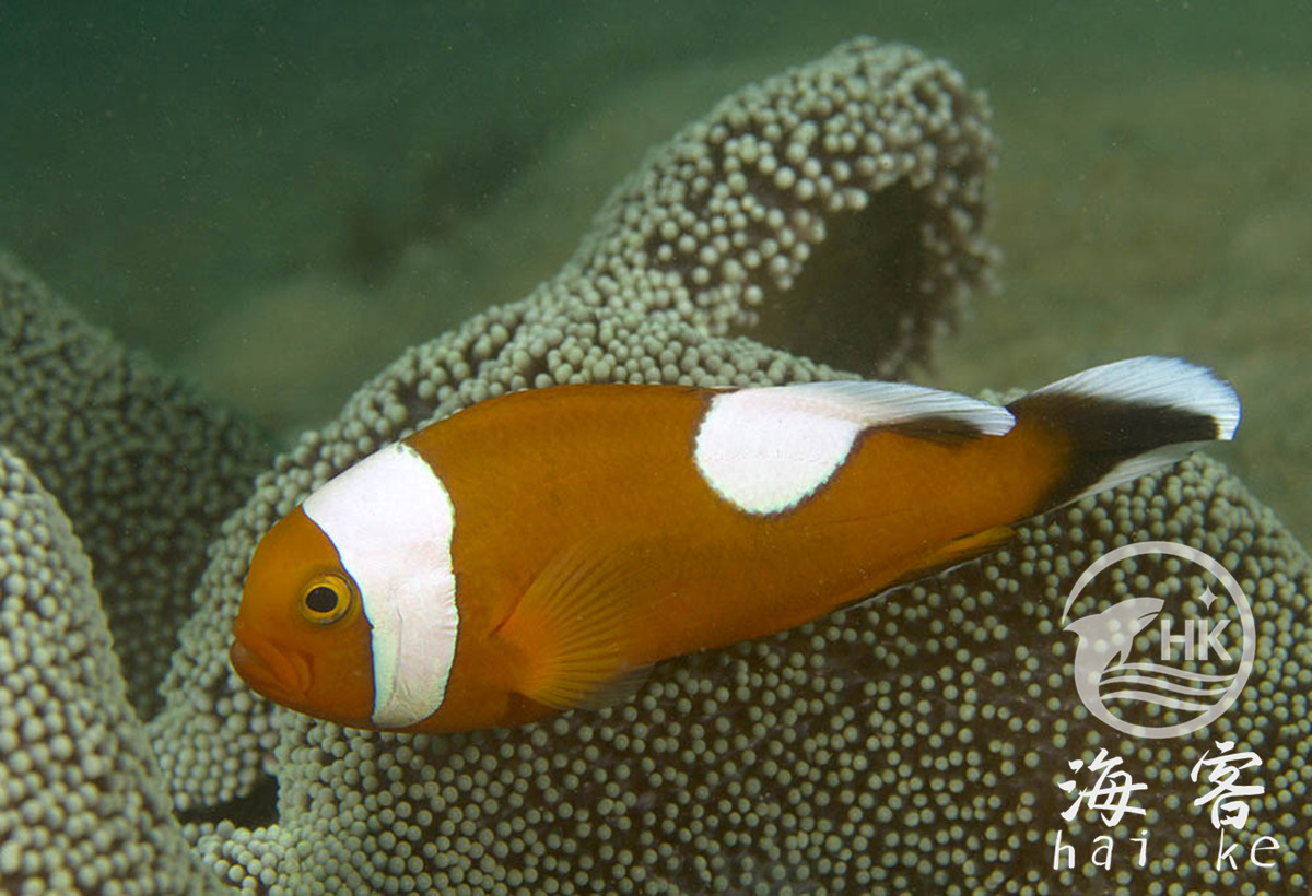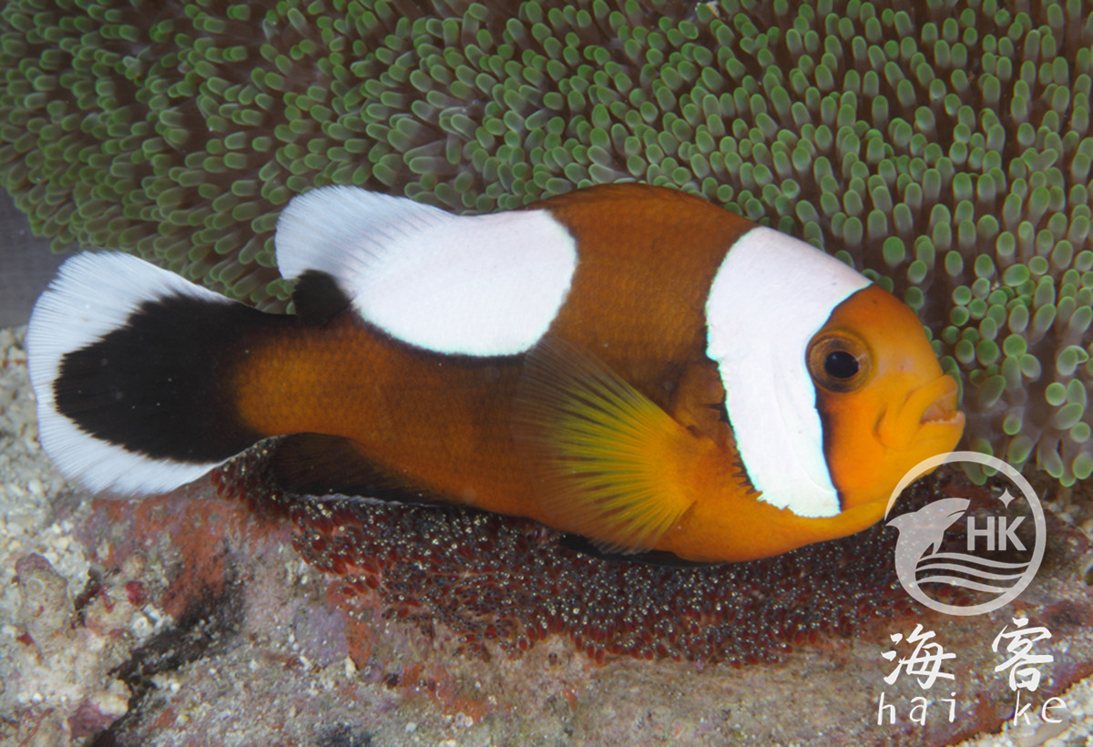 身体橘褐色,眼睛后面、背鳍及尾鳍两边有白色条纹。也有黑色的品种,叫黑豹小丑。
