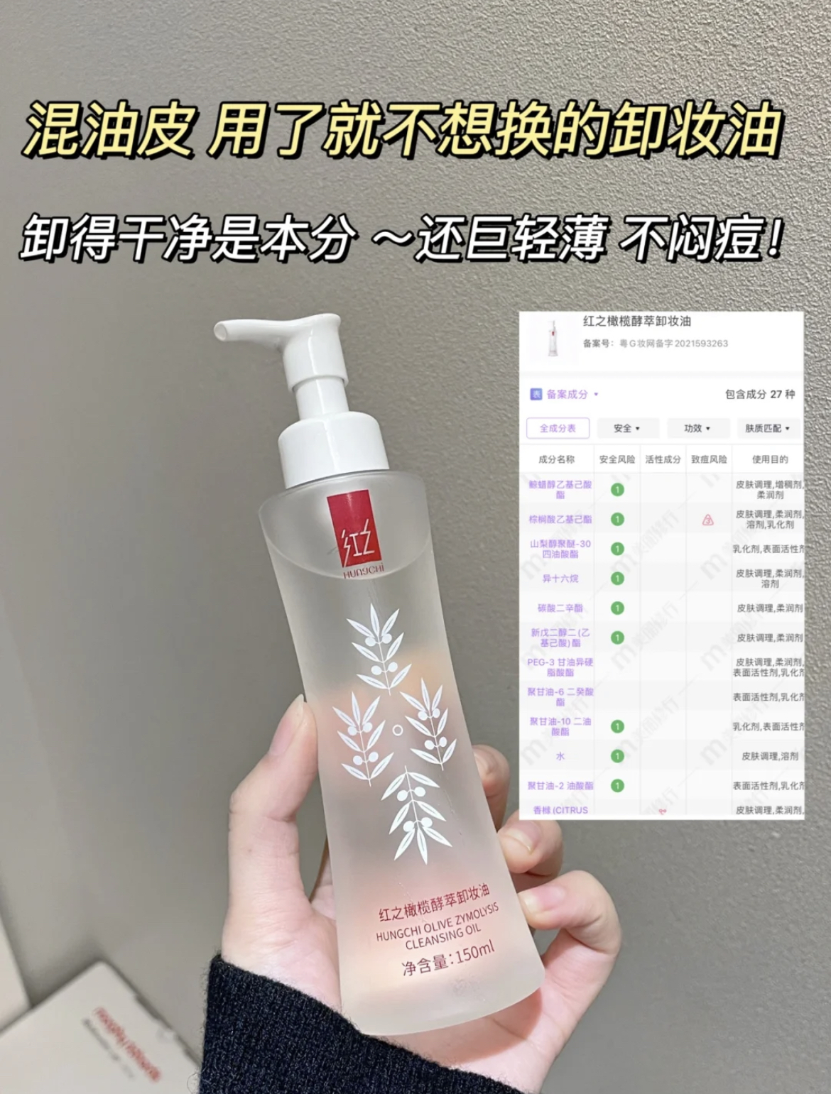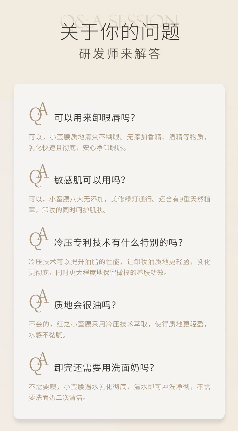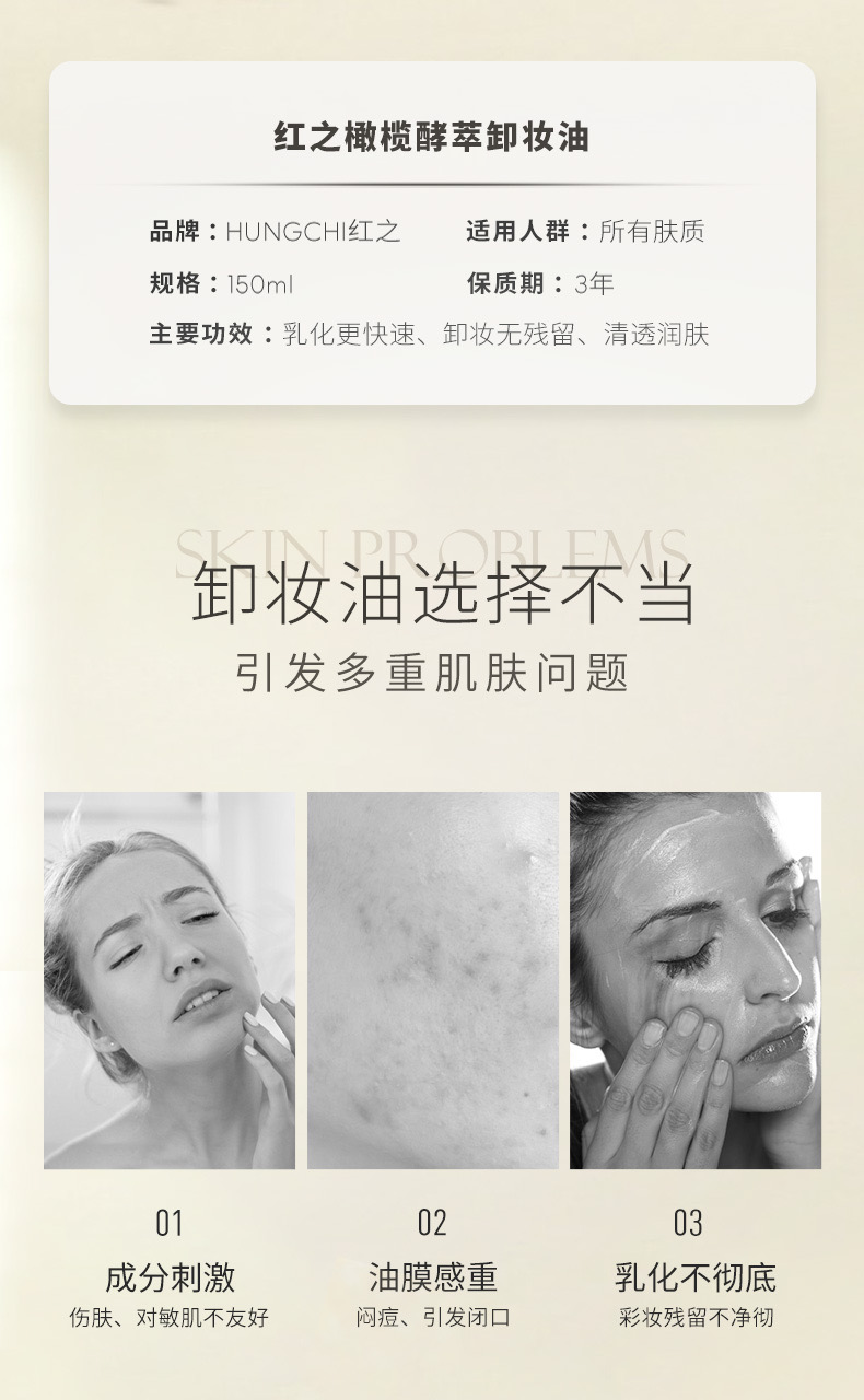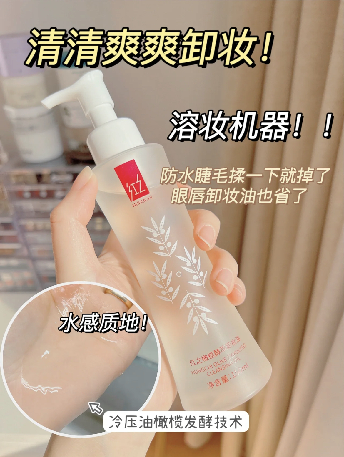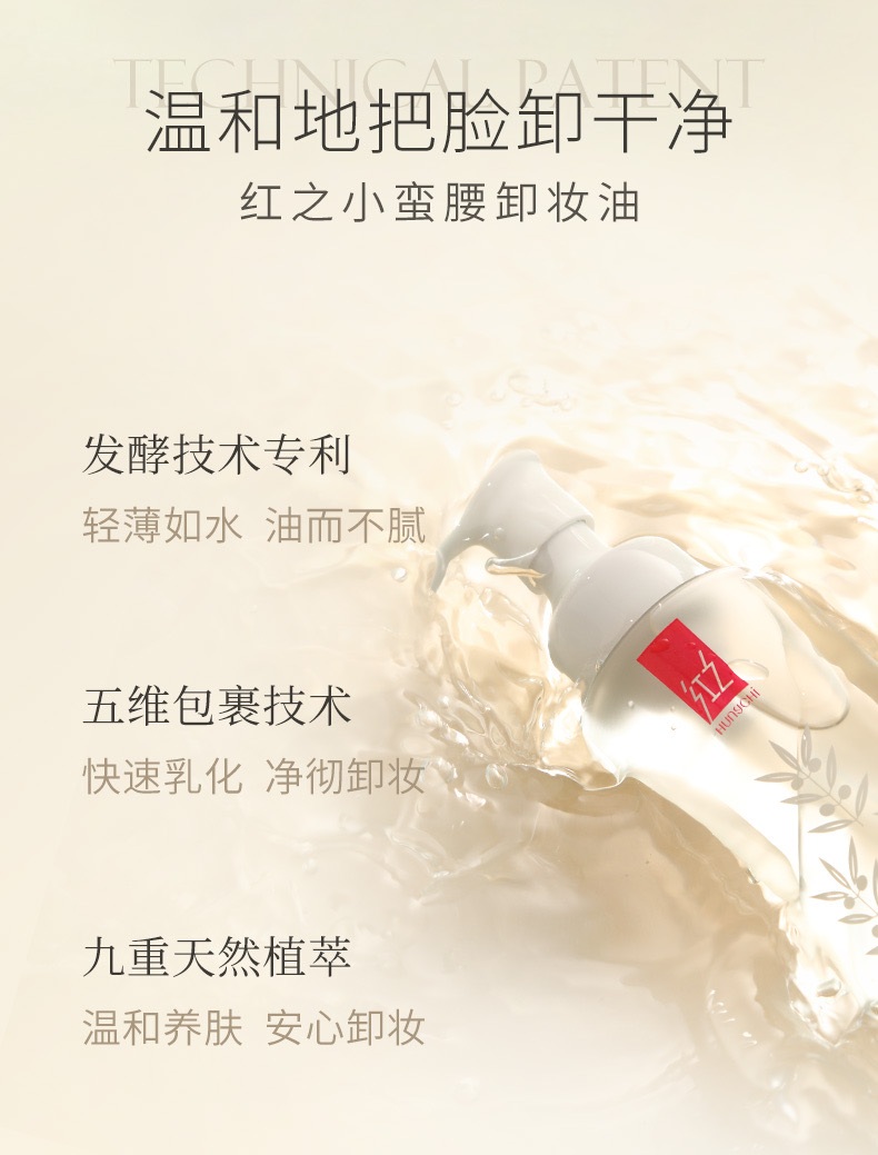 不同于其他普通卸妆油,红之水感卸妆油拥有进口专利——冷压发酵橄榄油技术,料体质地更轻薄,乳化力更强。
