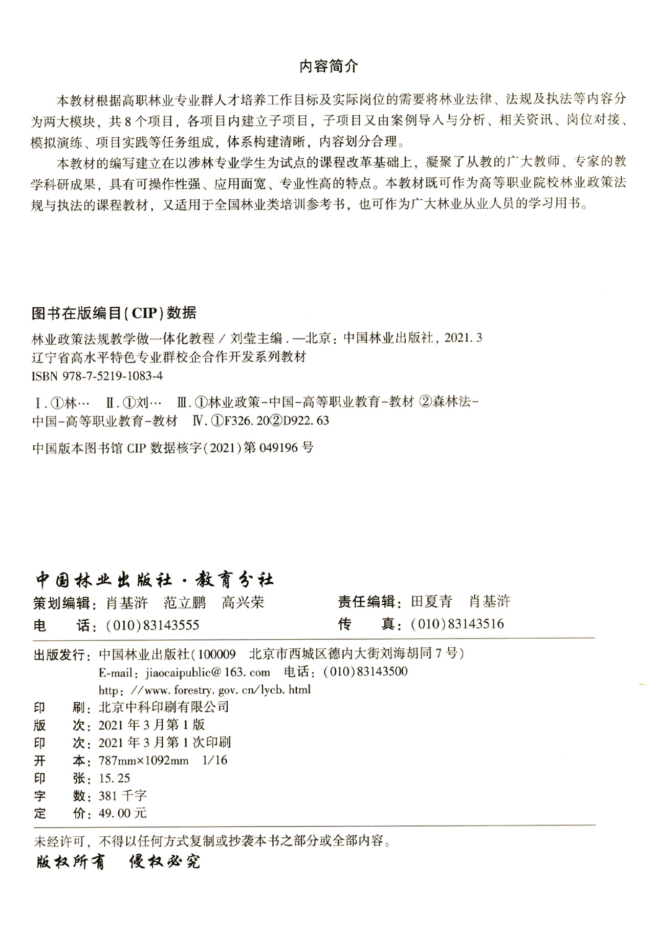 林业政策法规教学做一体化教程 刘莹 (辽宁省高水平特色专业群校企合作开发系列教材) 1083 中国林业出版社