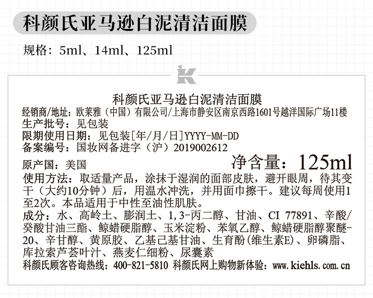 【精选包邮】正品科颜氏(Kiehl's)白泥清洁面膜 收缩毛孔去黑头去角质 护肤礼盒生日礼物 心选到家