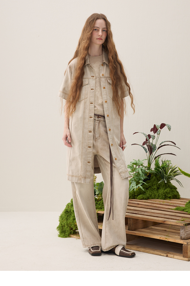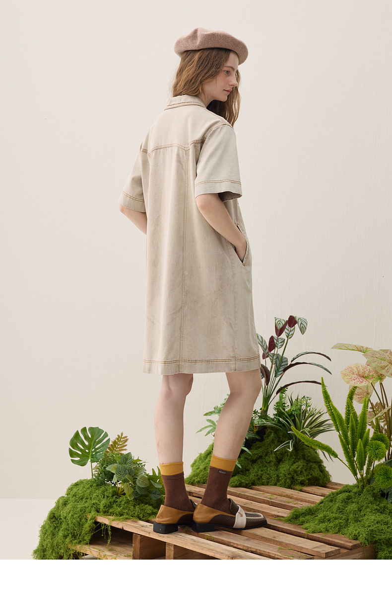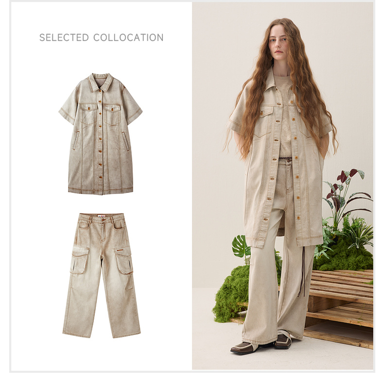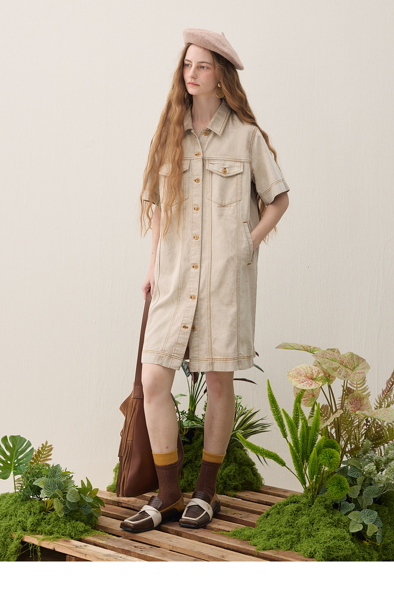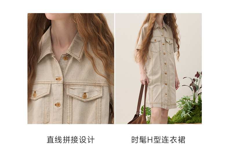 谜底牛仔连衣裙短袖2026春季新品做旧水洗H型拼接亲肤女261ML0044