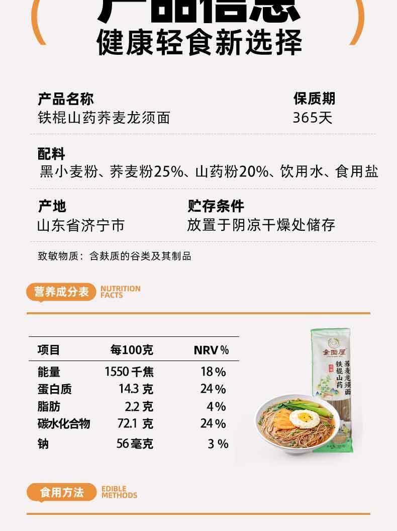 【金面屋铁棍山药荞麦龙须面】非油炸低脂低卡 真粗粮高饱腹