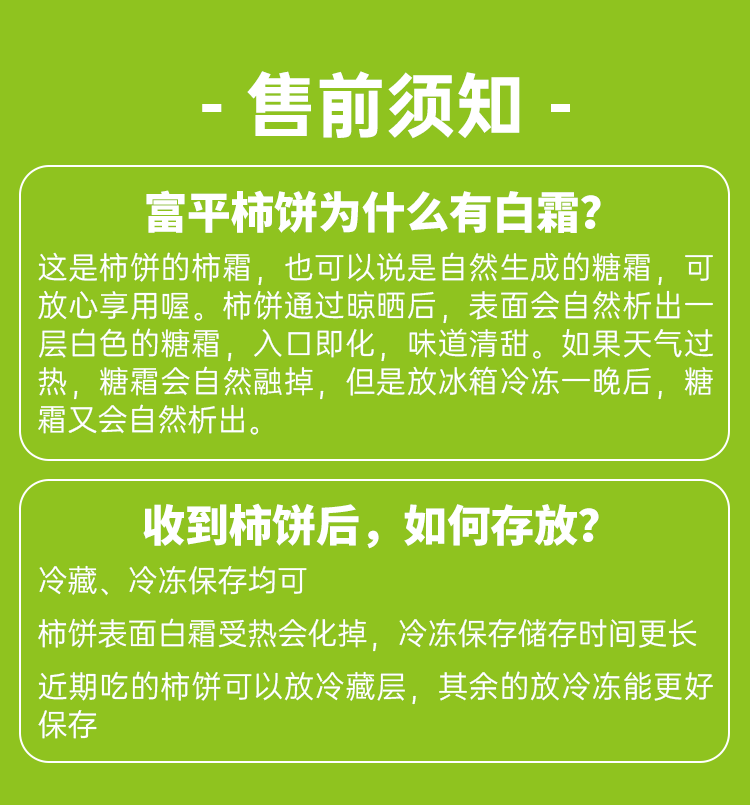 【特别说明】1.柿饼表面杮霜为天然糖霜,遇到高温容易化开,温暖区域请务必及时签收冷冻存放,少霜或无霜、化霜并非坏损,收货后冰箱冷冻存放几天杮霜会慢慢恢复2..一旦发出原则上不可改地址或退款,如若客户强烈要求改地址所产生的物流费和售后由客户承担。