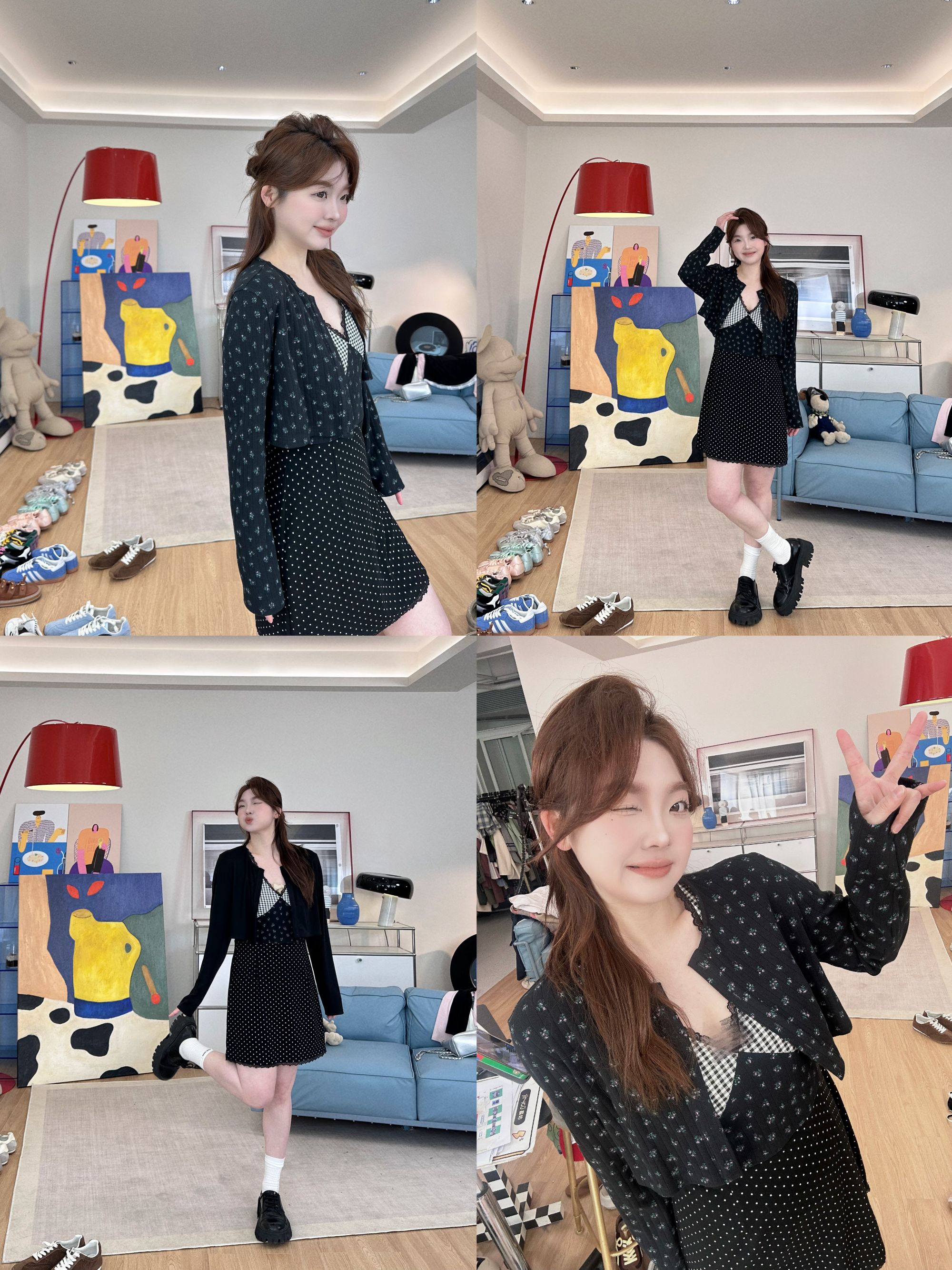 2025新品 蕾蕾同款【初恋露易丝】小众格子V领碎花波点连衣裙+短款长袖开衫