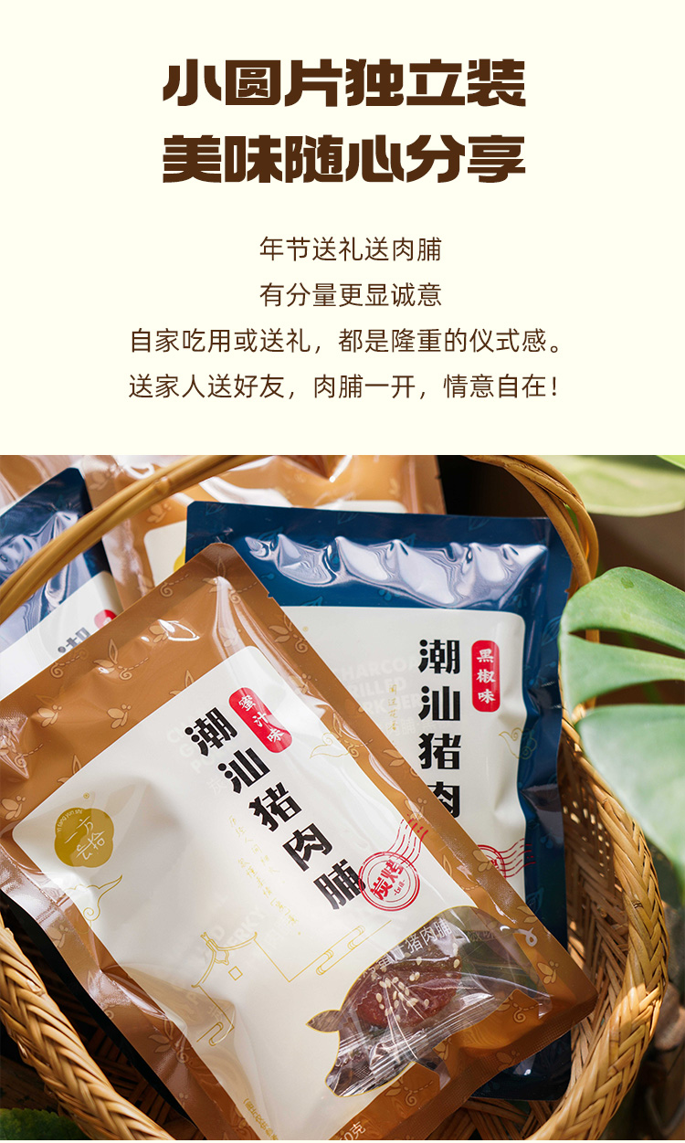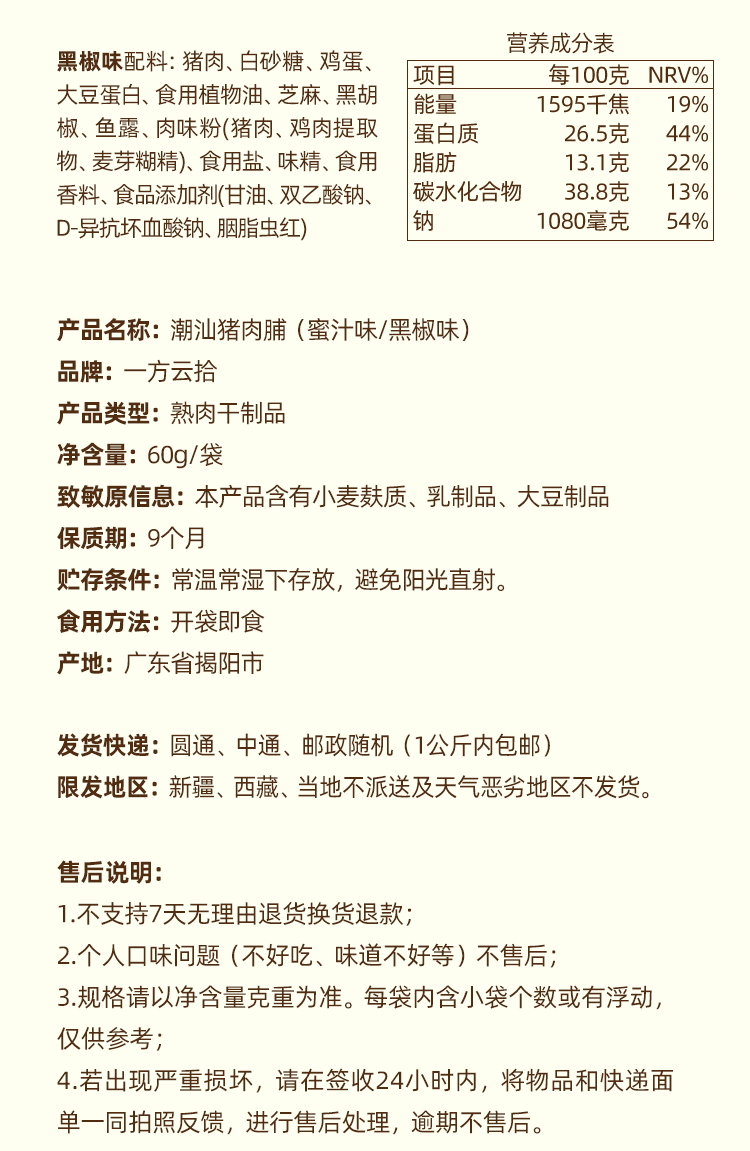 【品名/规格】【一方云拾】潮汕炭烧猪肉脯(60g/袋,蜜汁味/黑椒味)8-9包/袋(个数仅作为参考,以重量为准)