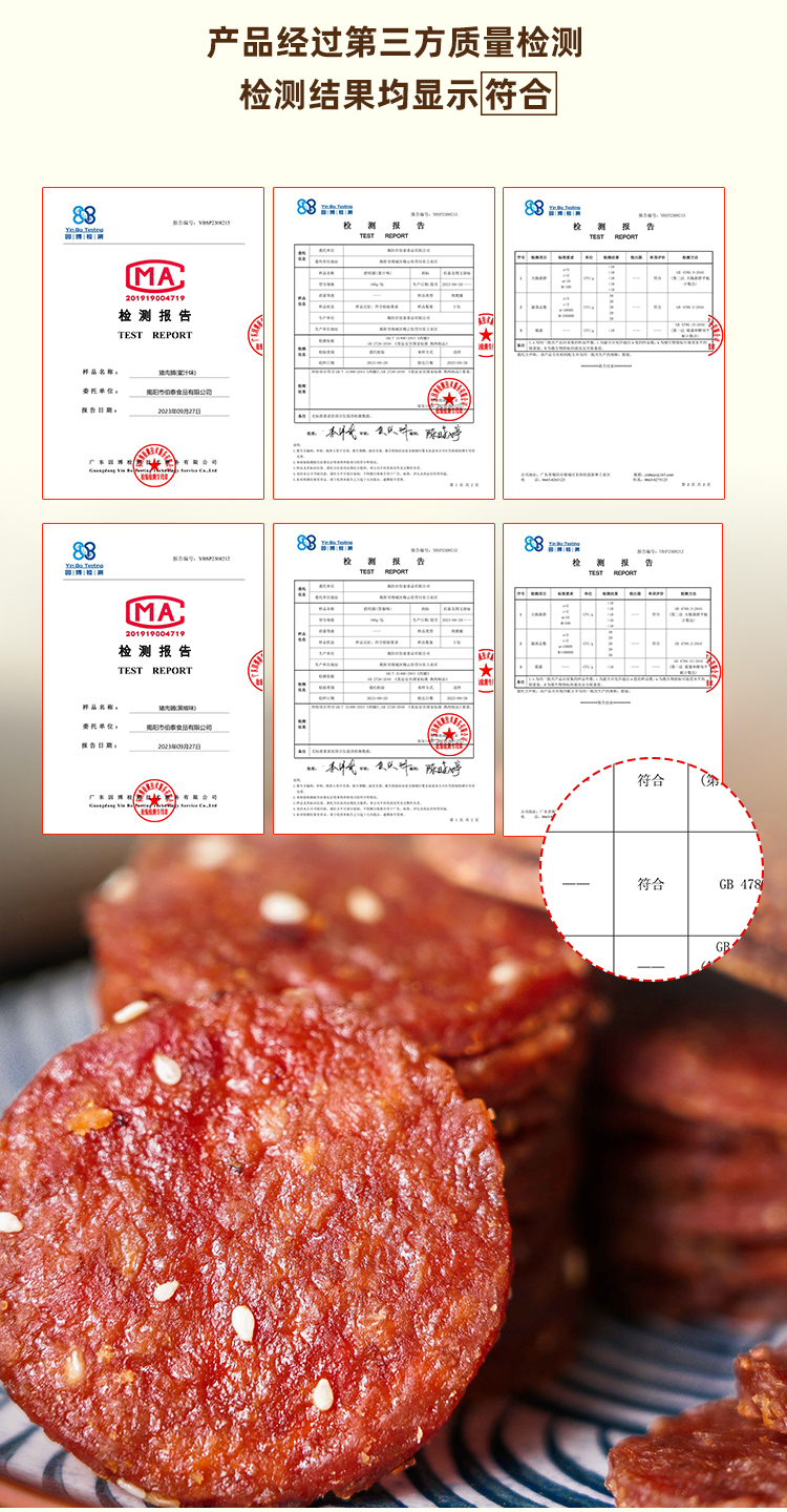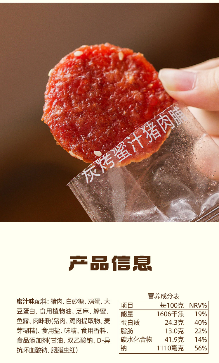 蜜汁味配料:猪肉、白砂糖、鸡蛋、大豆蛋白、植物油、芝麻、蜂蜜、鱼露、肉味粉(猪肉、鸡肉提取物、