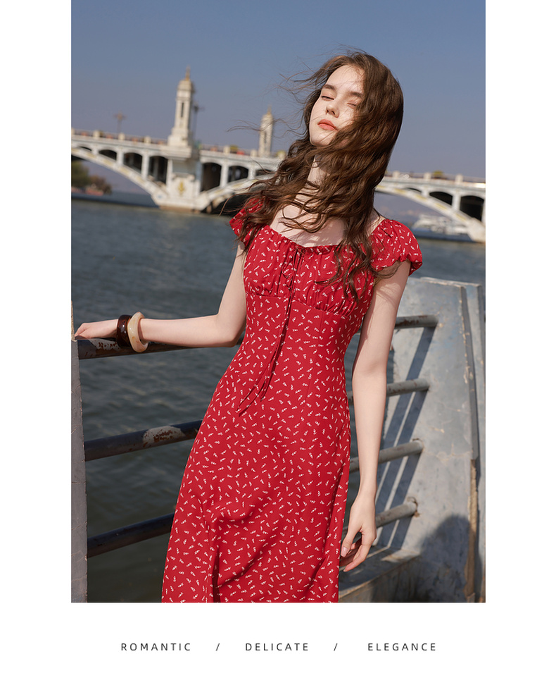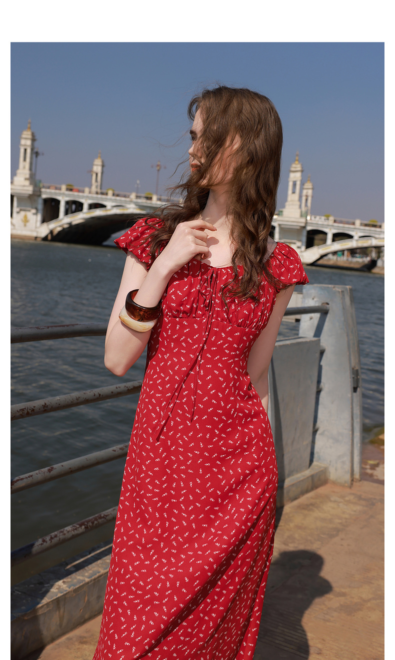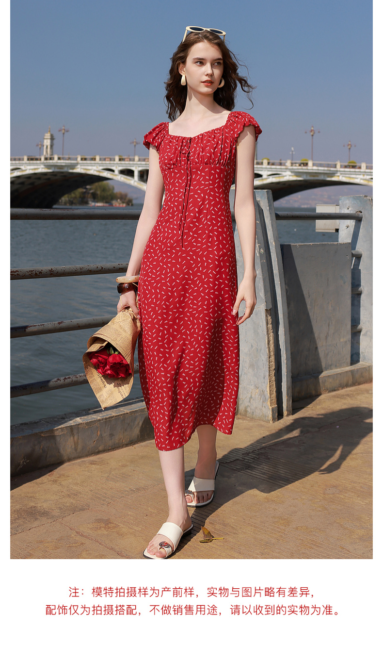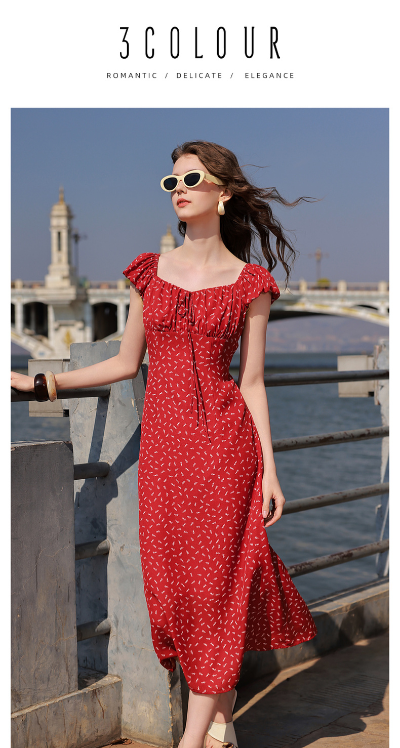 三彩2025夏季新款法式连衣裙方领系带收腰A字裙飞飞袖长裙M