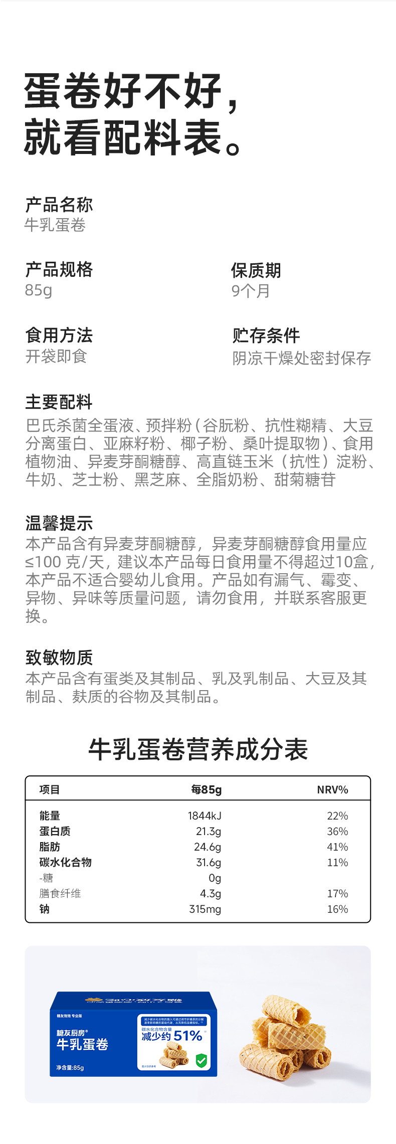 糖友厨房牛乳蛋卷85g×3盒
