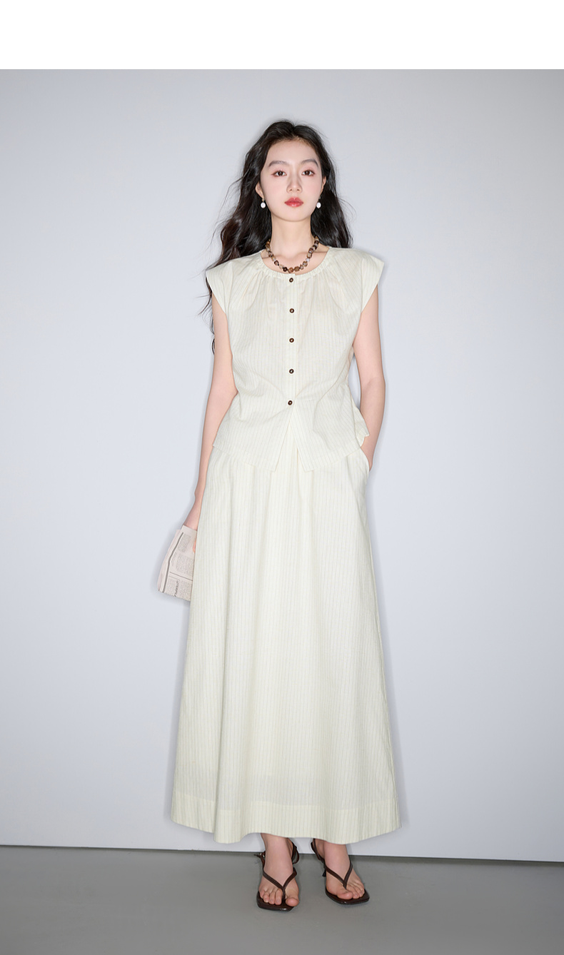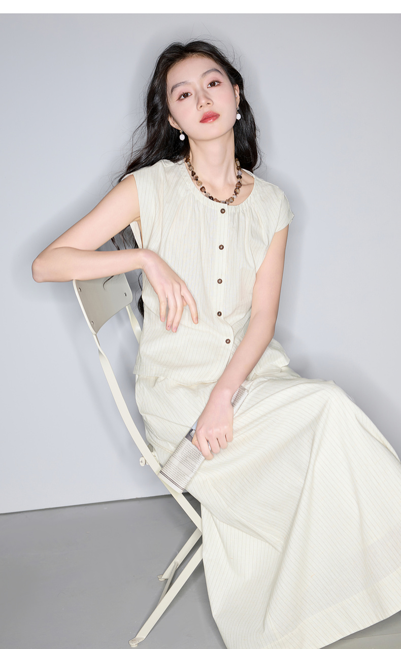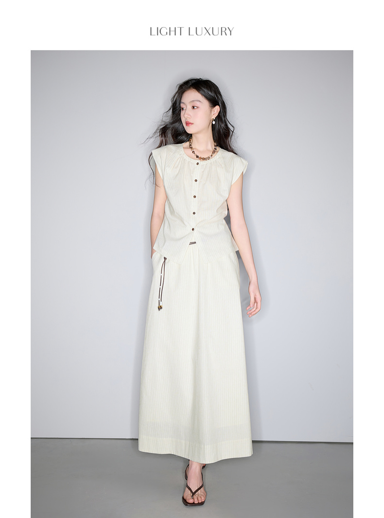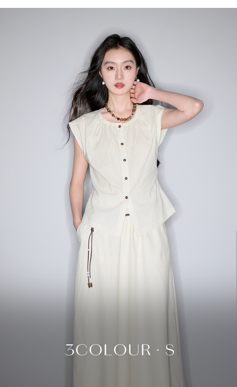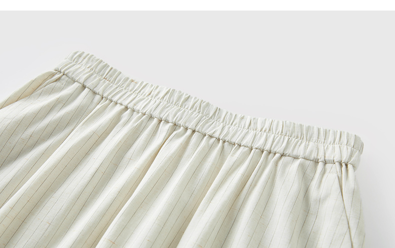 三彩2025夏季新款条纹套装圆领上衣松紧腰半身裙两件套通勤S