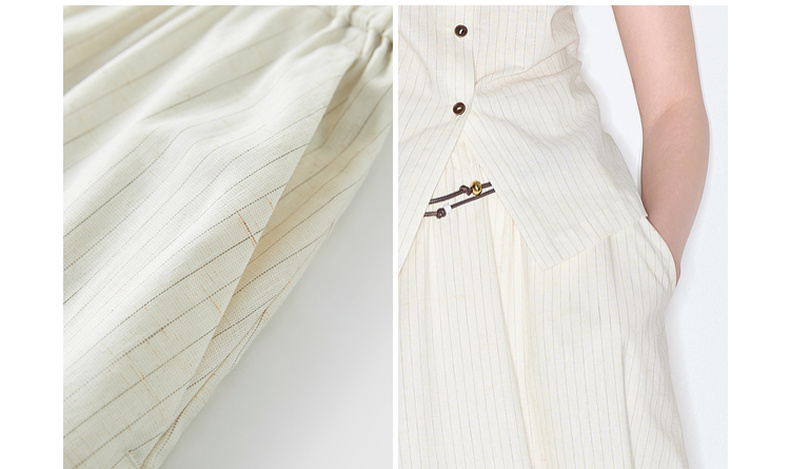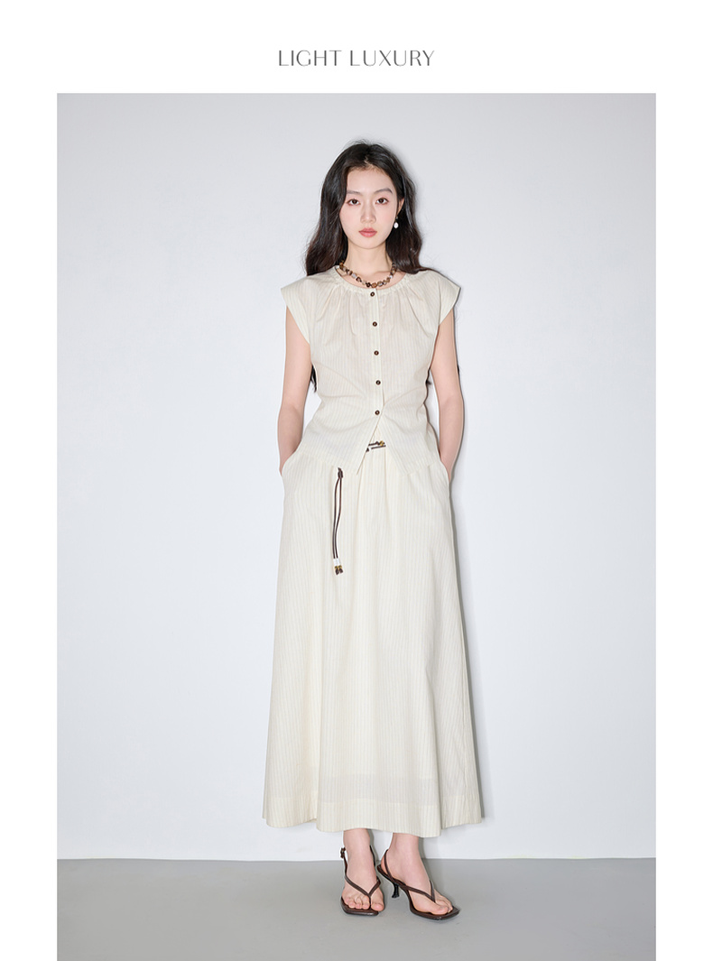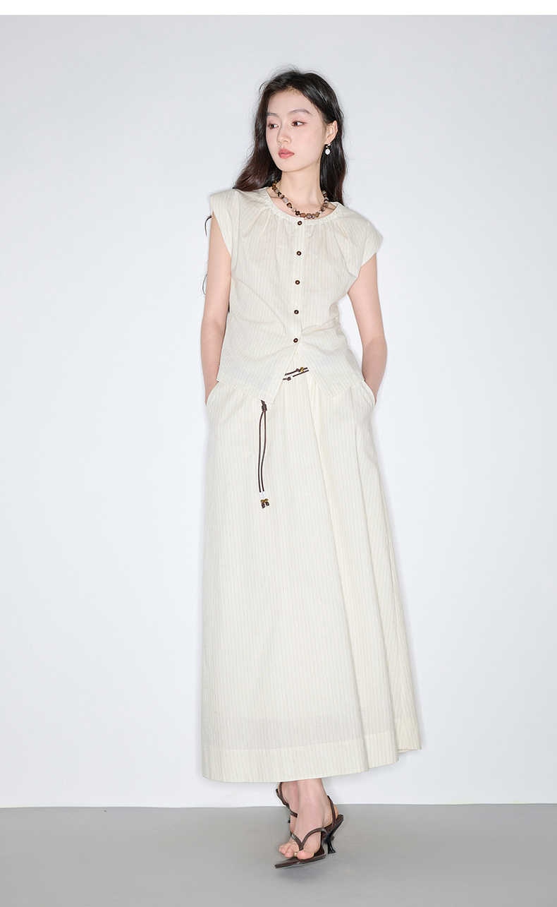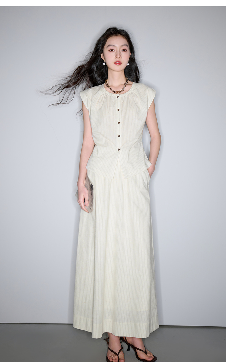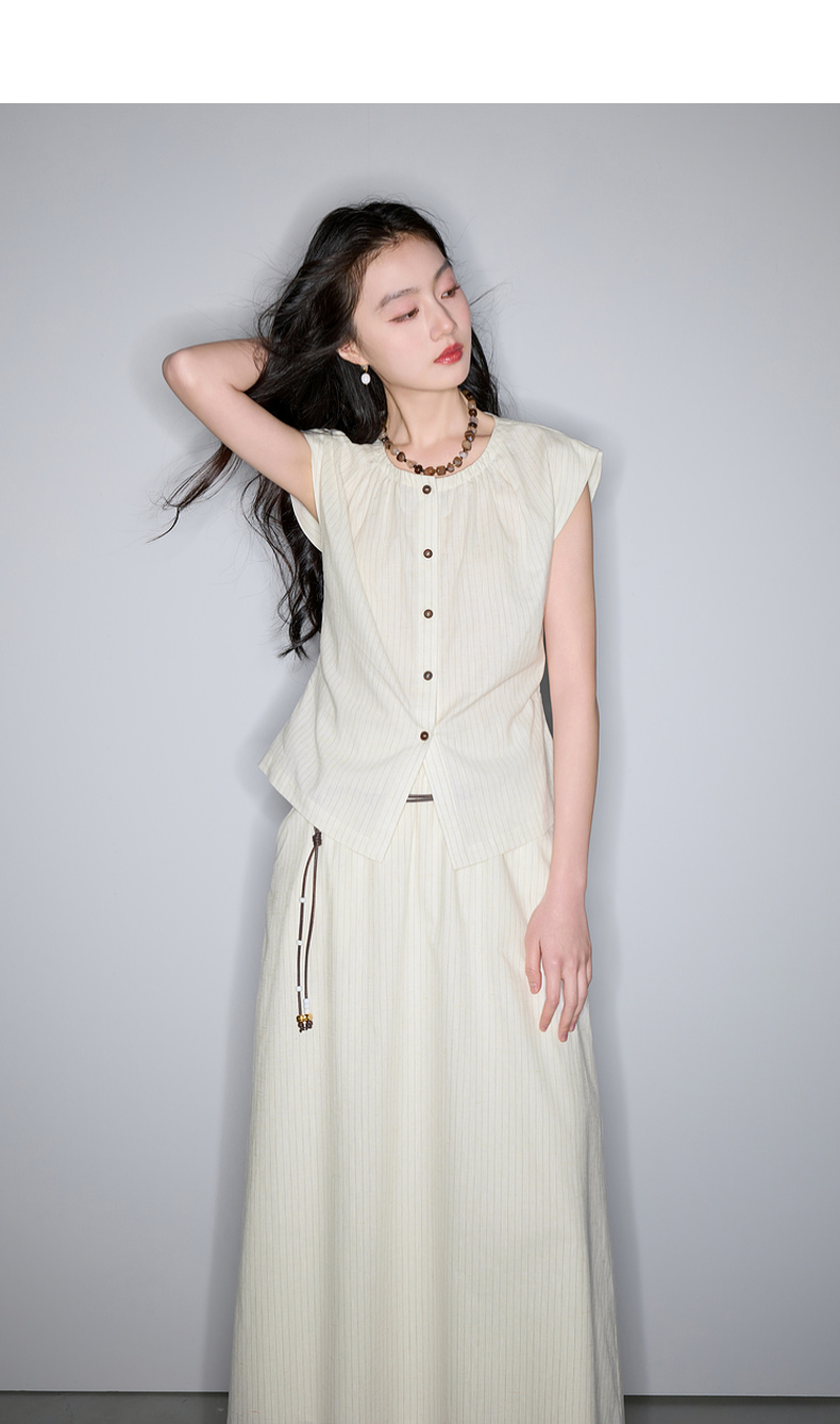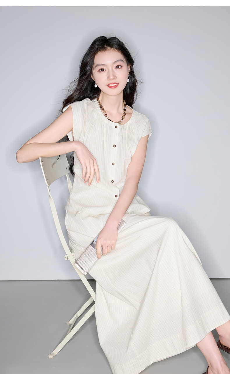 三彩2025夏季新款条纹套装圆领上衣松紧腰半身裙两件套通勤S
