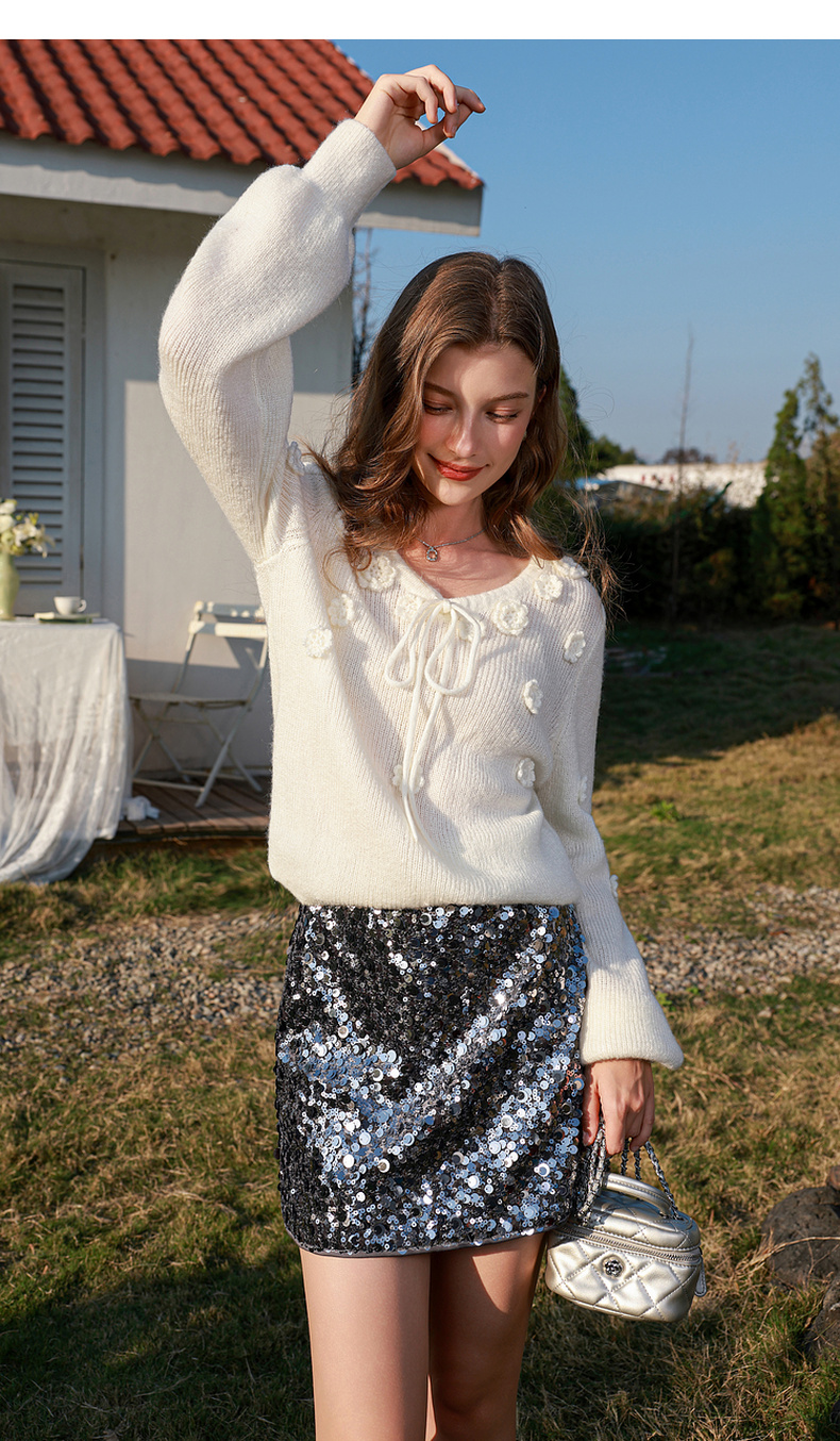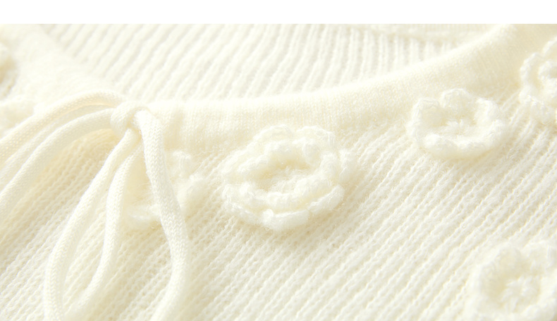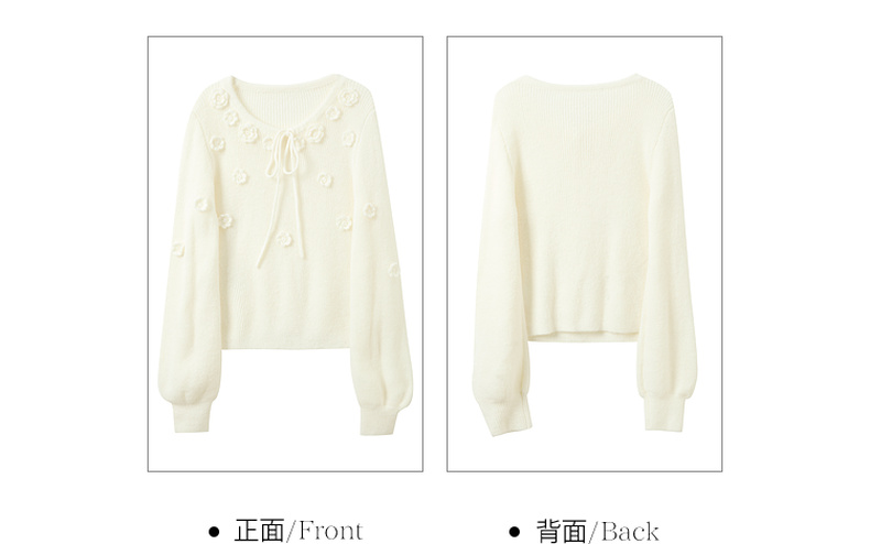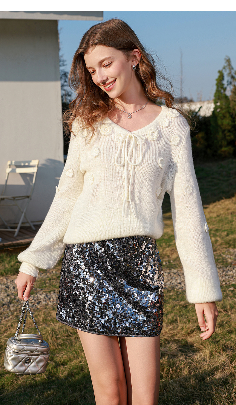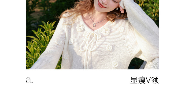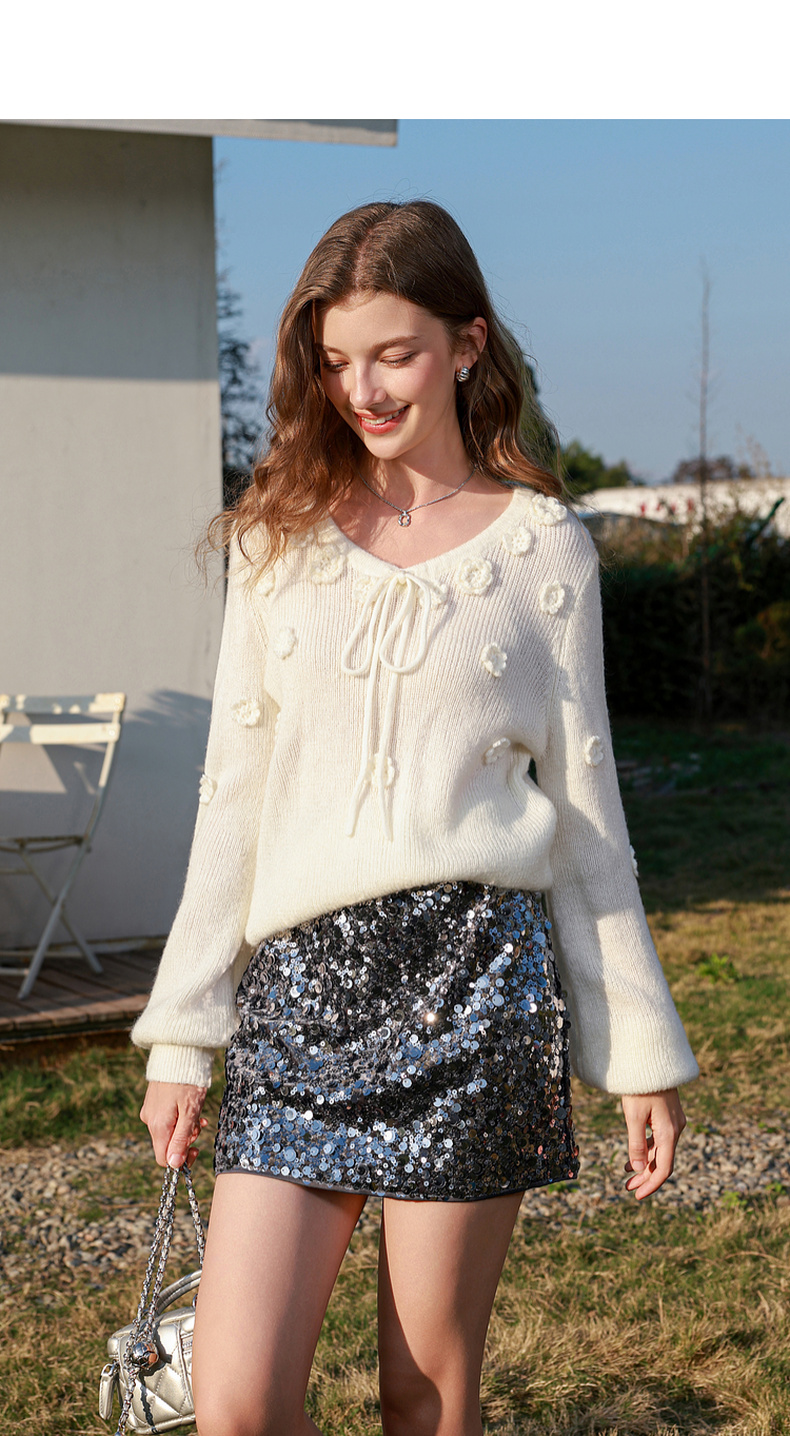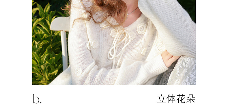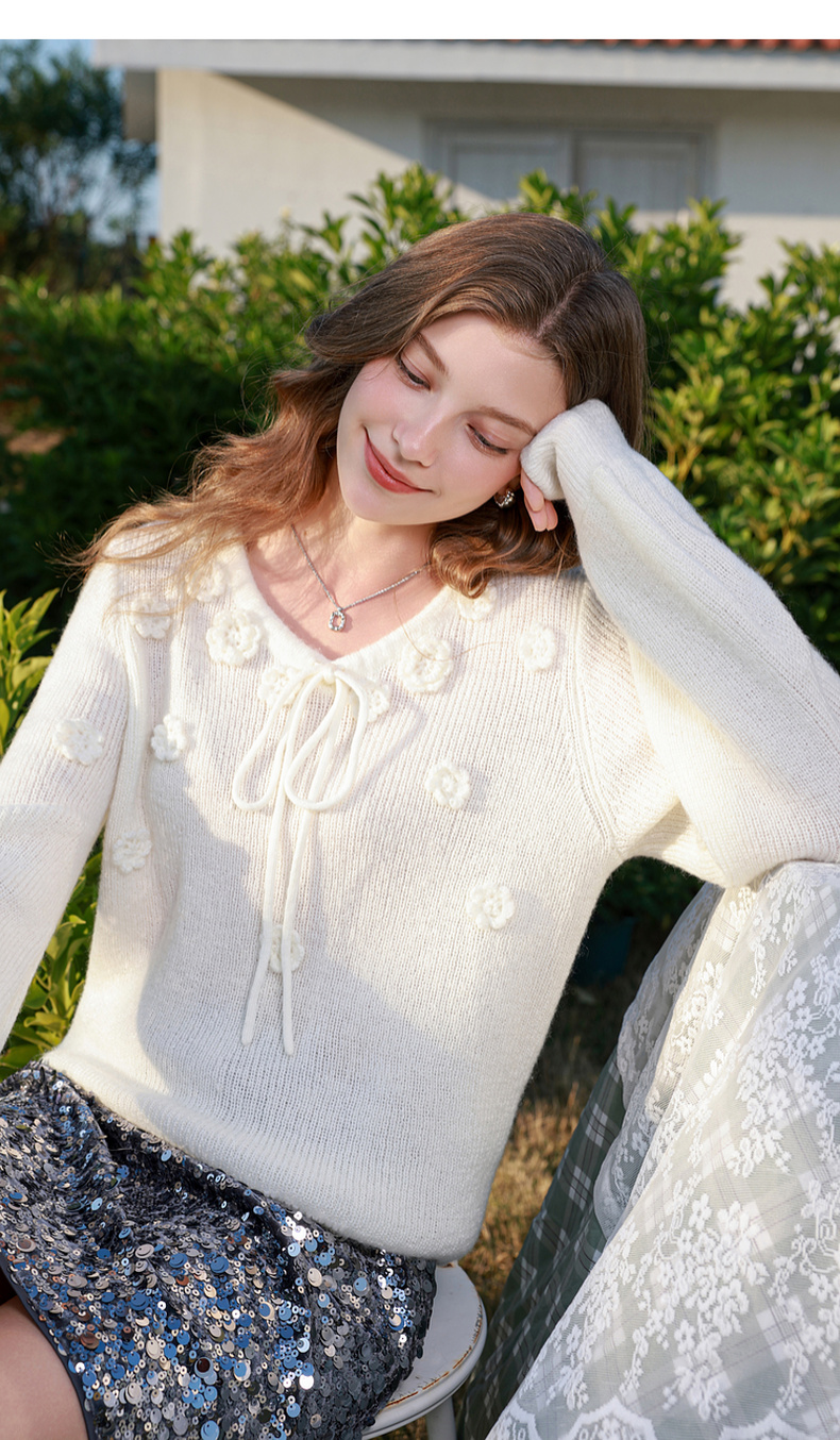 三彩2026春季新款立体花朵毛衣绒感V领毛衫宽松套头长袖M