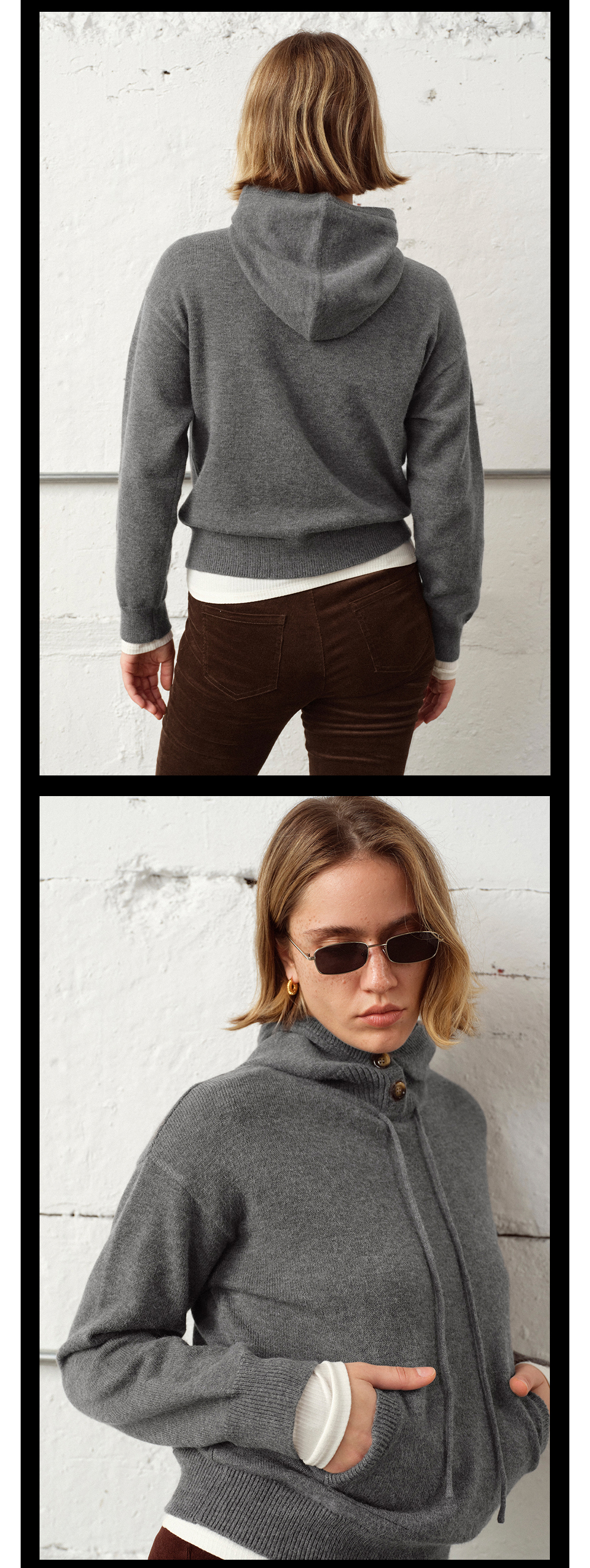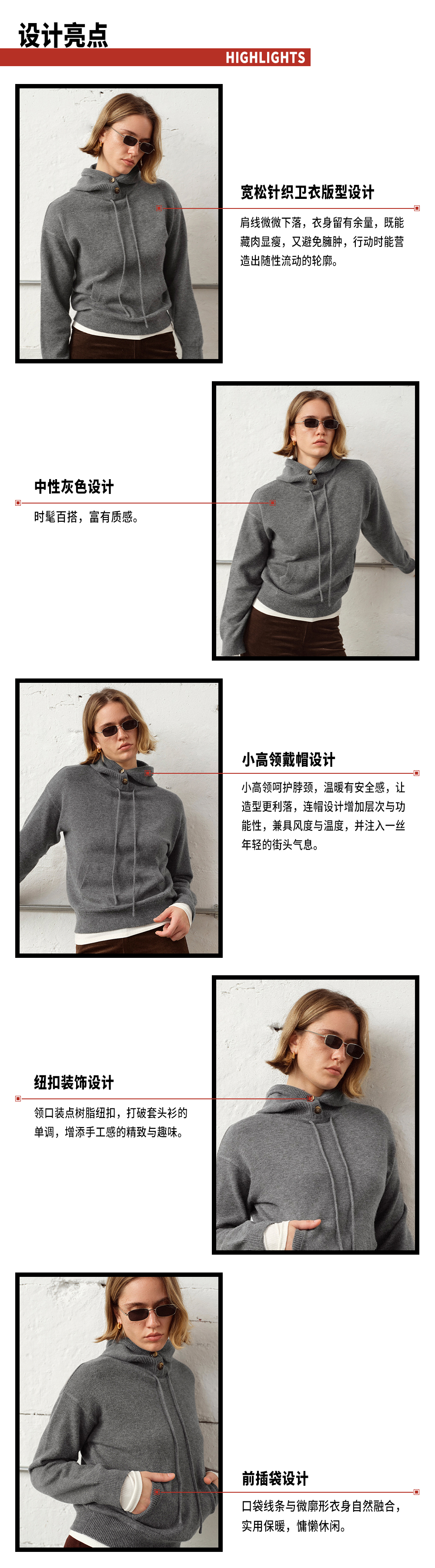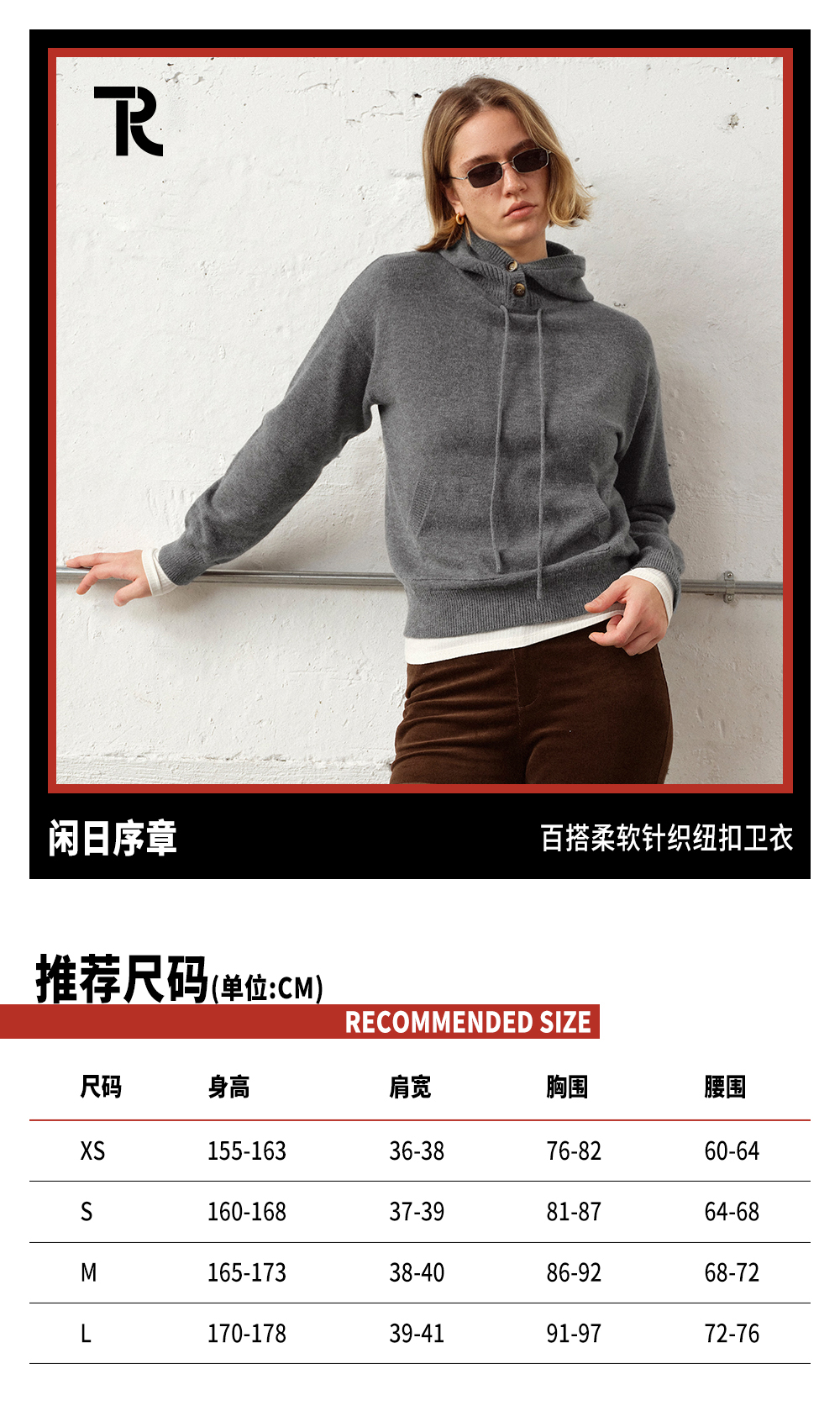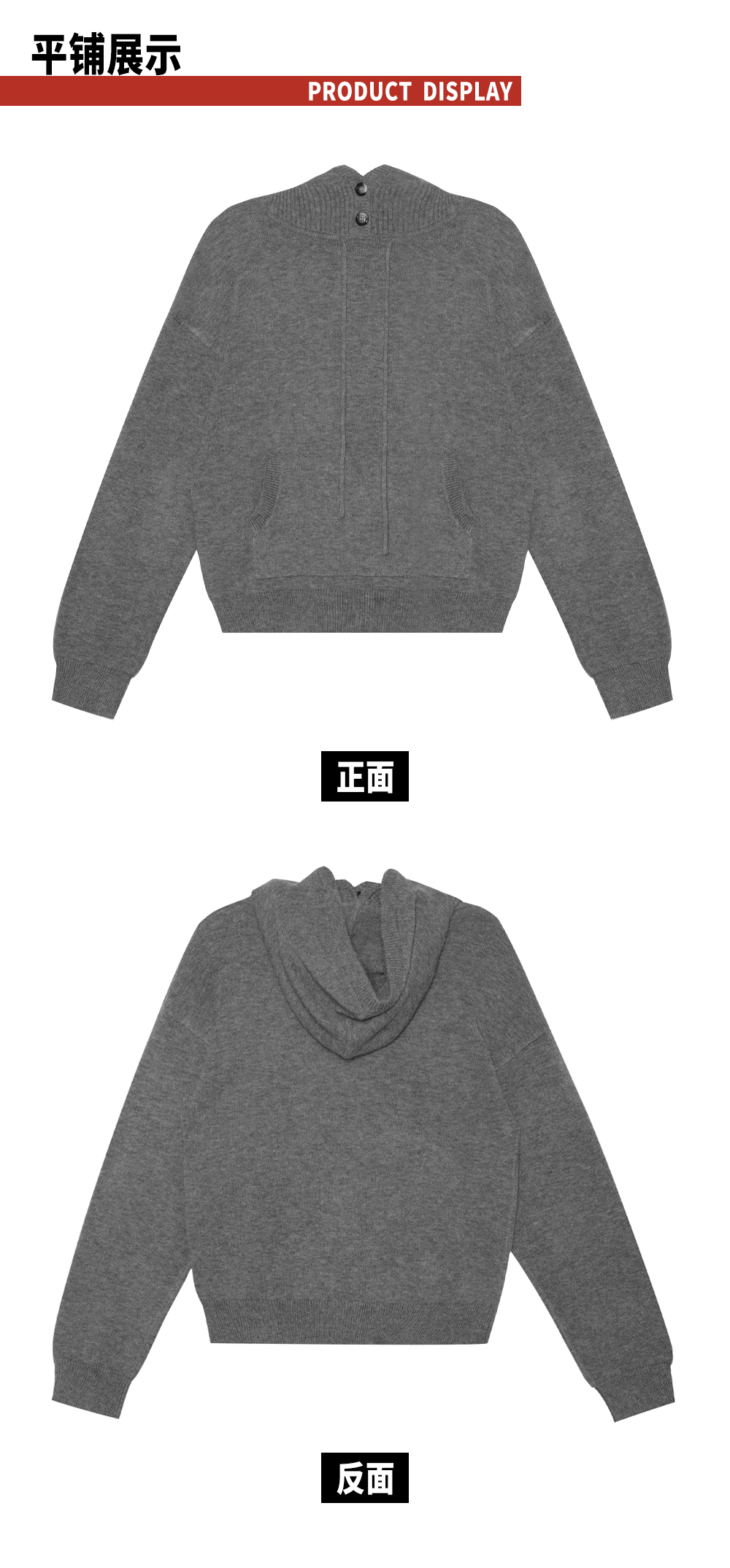TR她热 闲日序章 灰色针织连帽纽扣抽绳设计感宽松卫衣上衣
