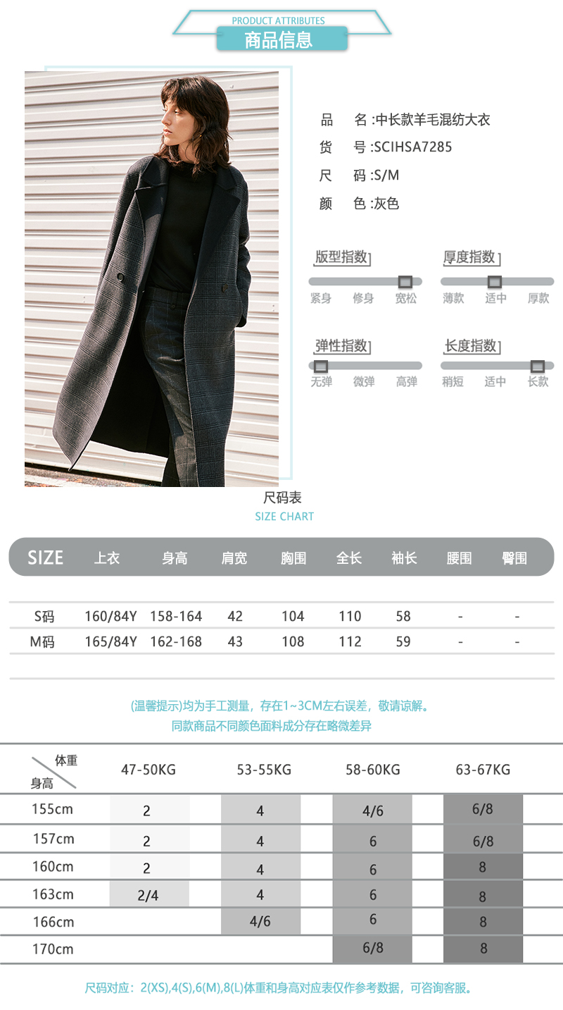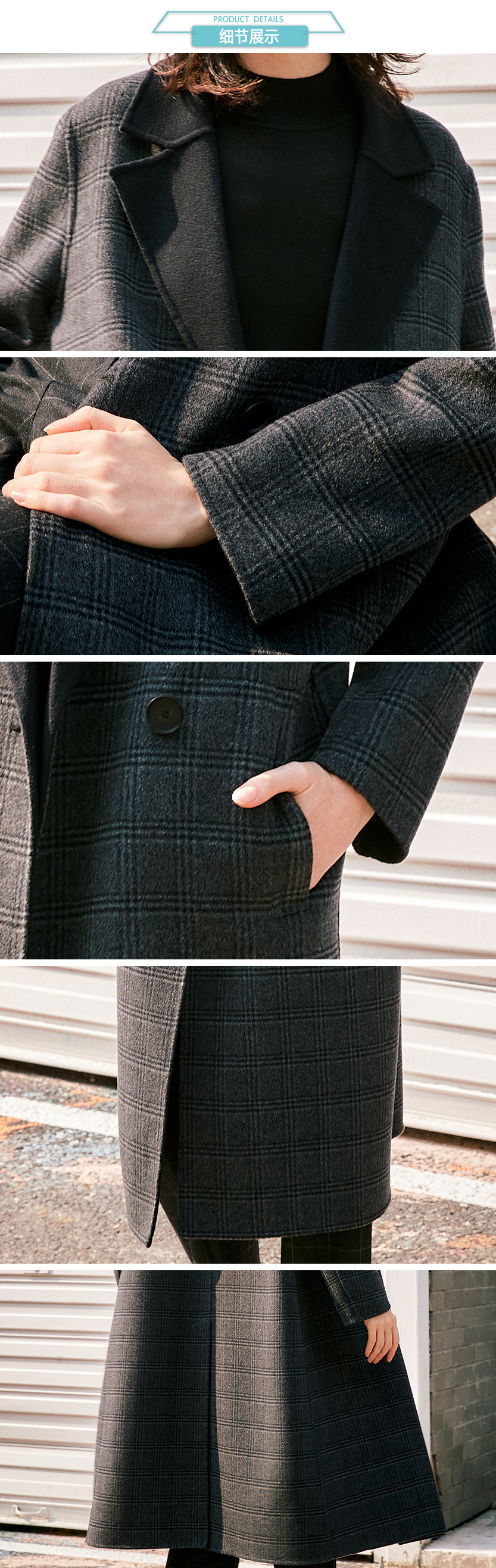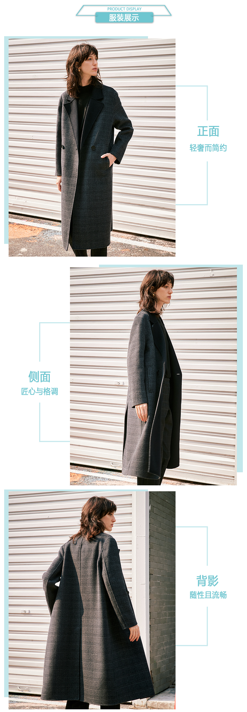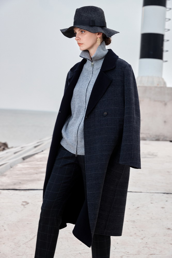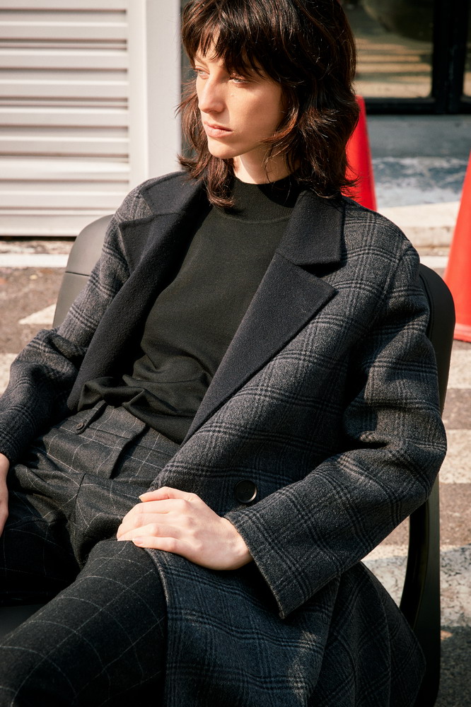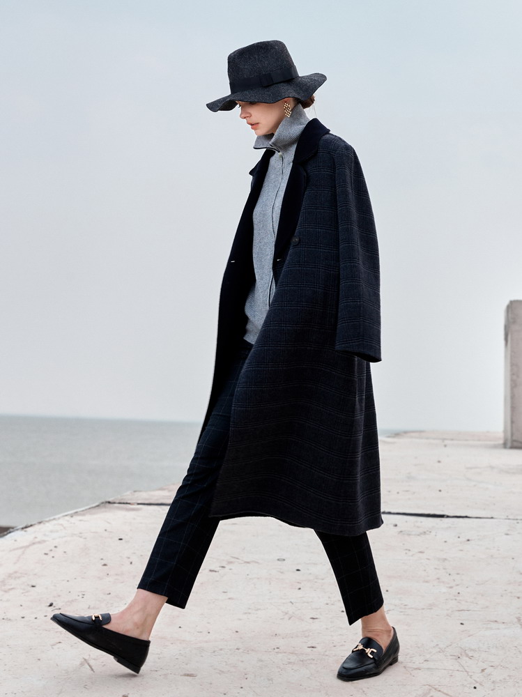 ICB日系秋季通勤直筒羊毛羊绒混纺格子中长大衣毛呢外套商场同款