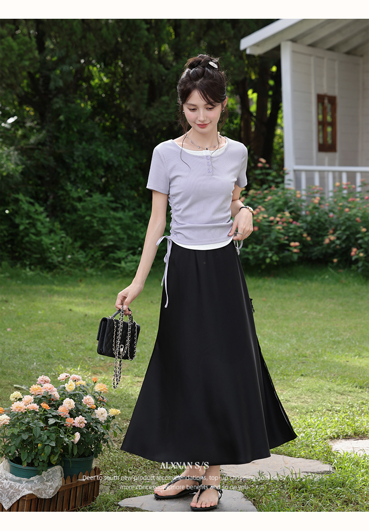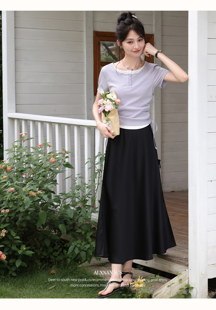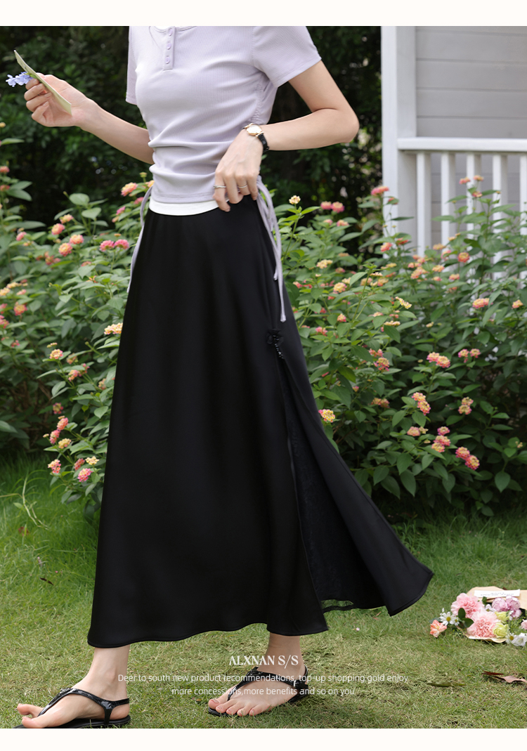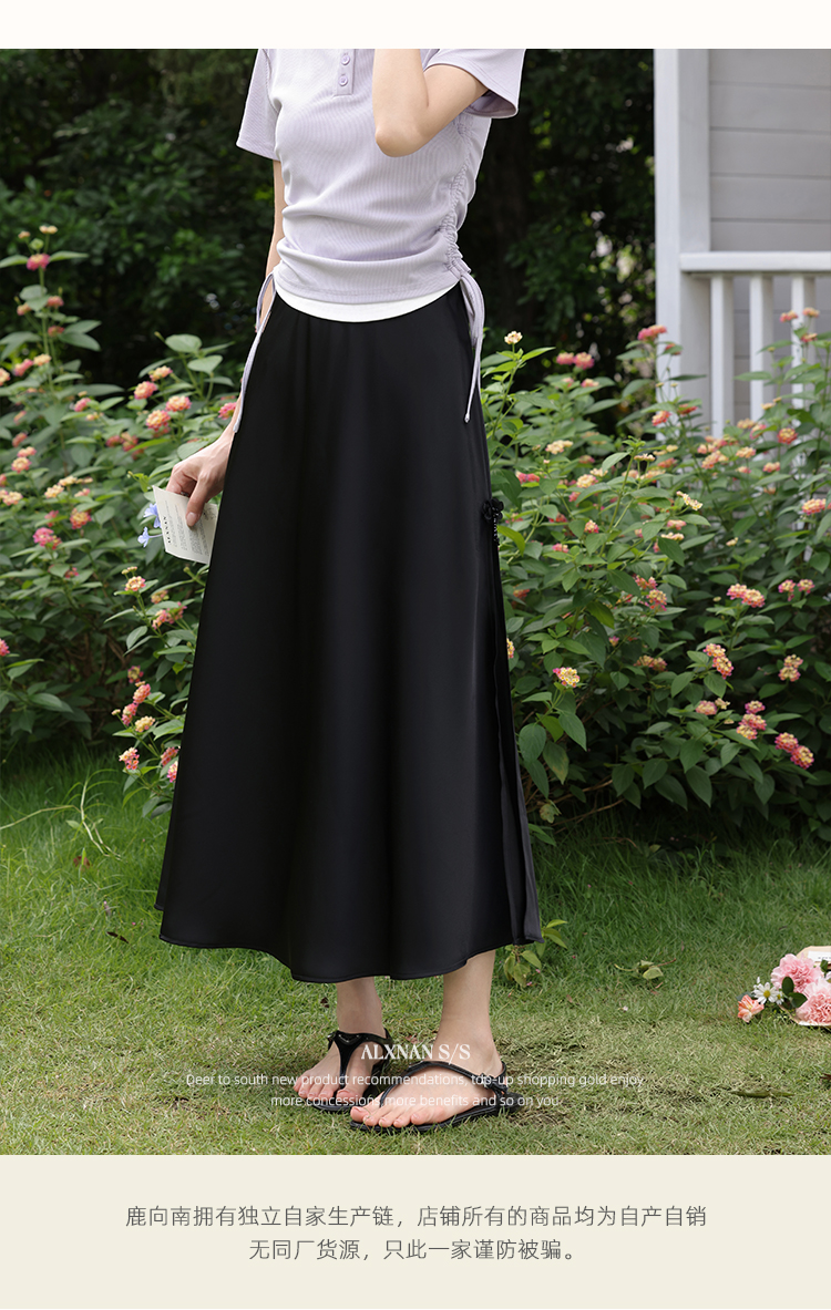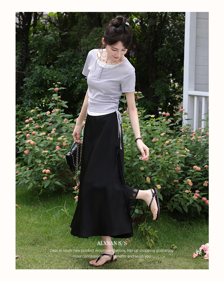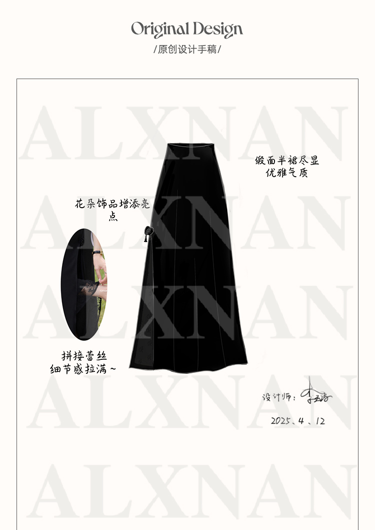 鹿向南「月光烟墨」黑色法式半身裙女夏缎面半裙气质拼接蕾丝裙子