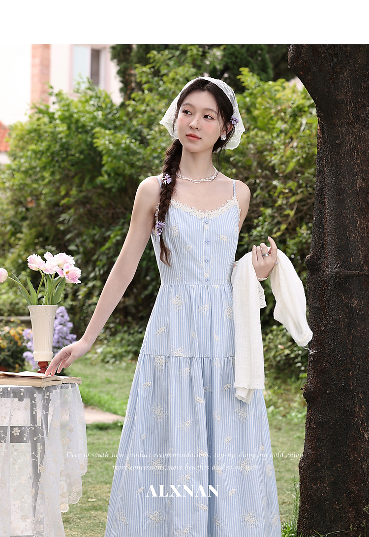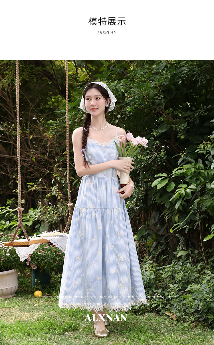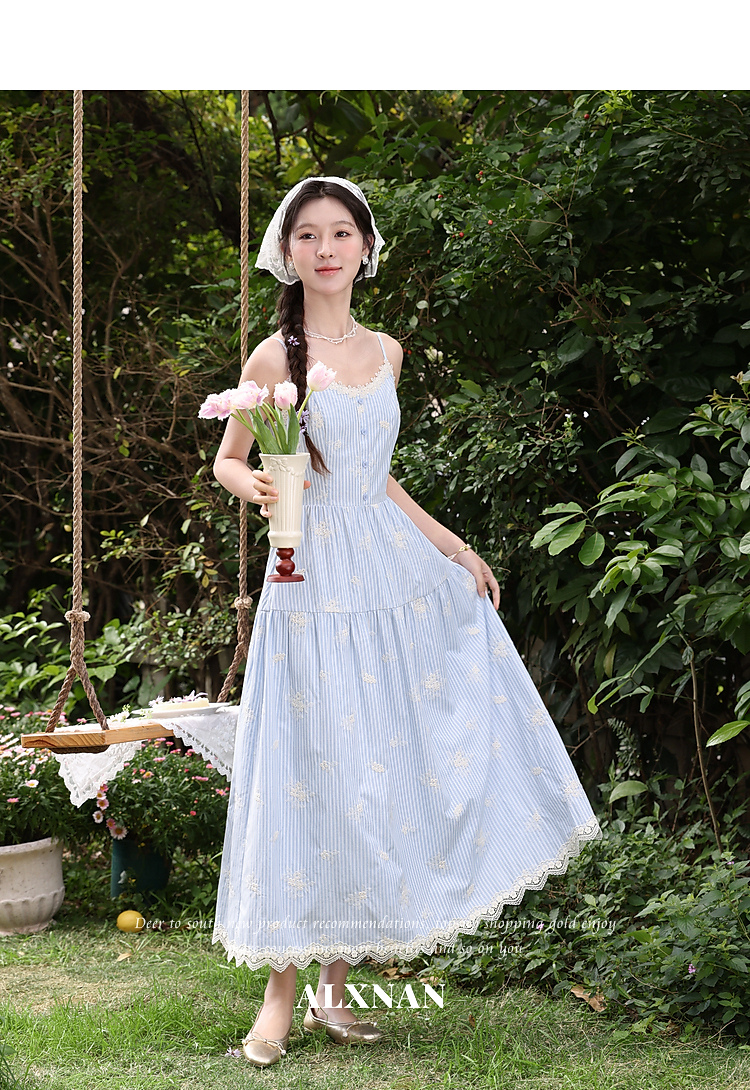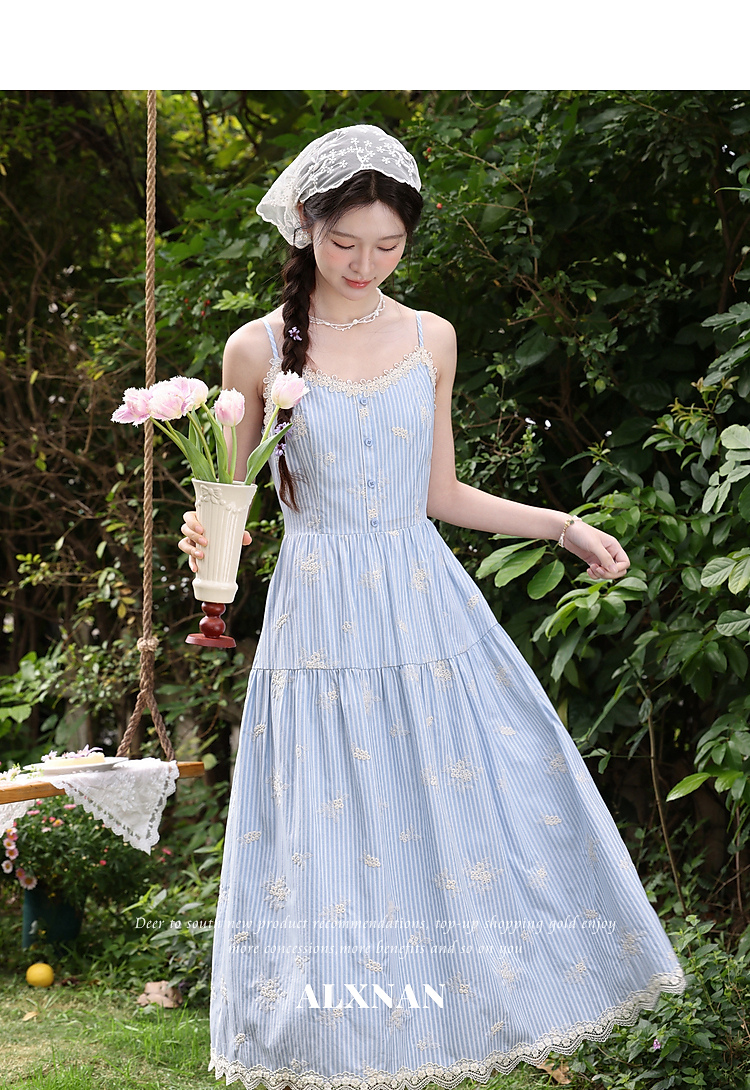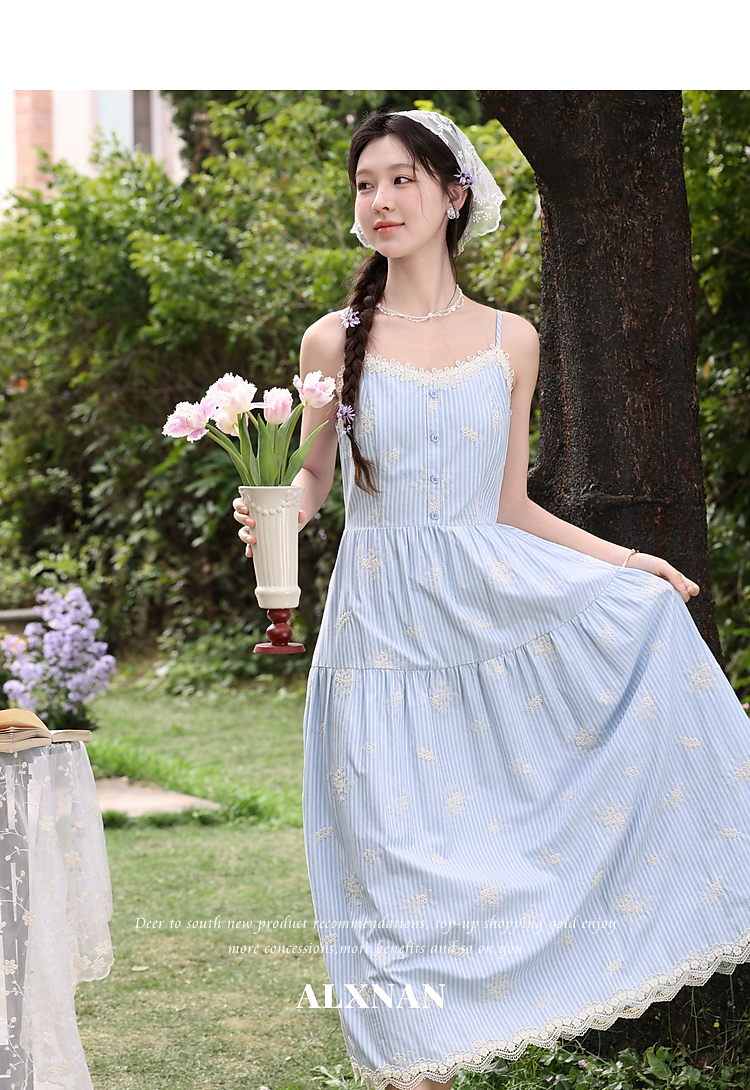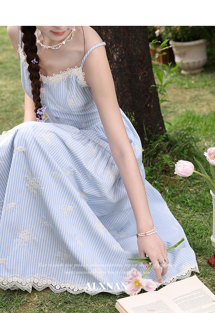 鹿向南「条痕花影」法式气质蓝色连衣裙女夏新款蕾丝花边条纹长裙