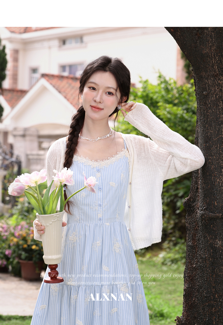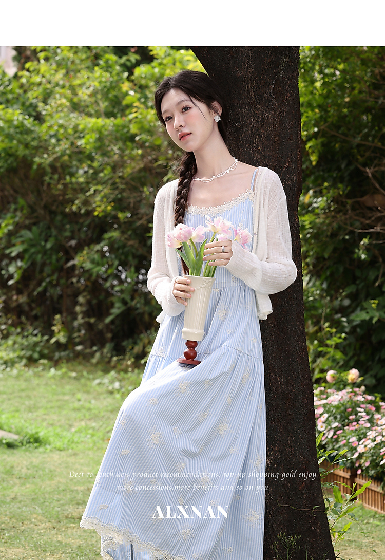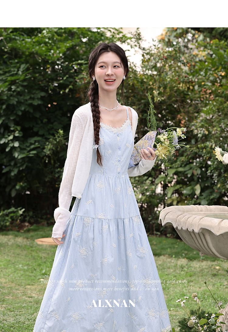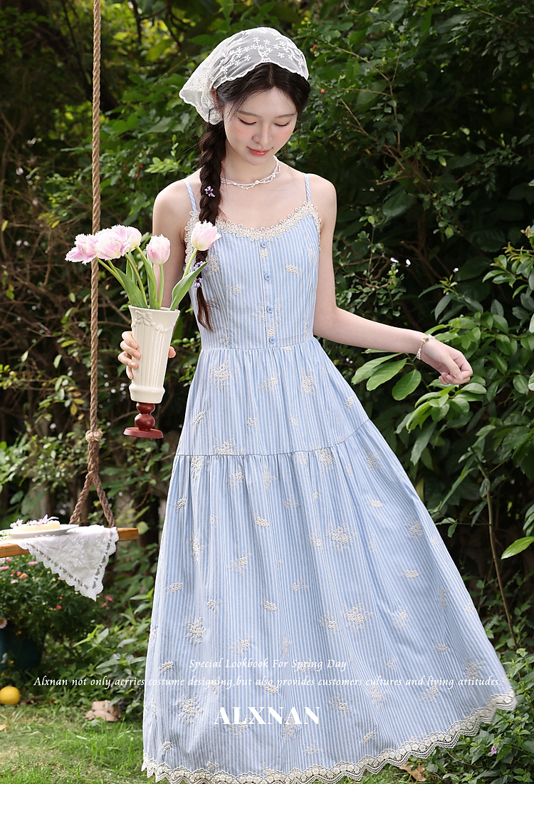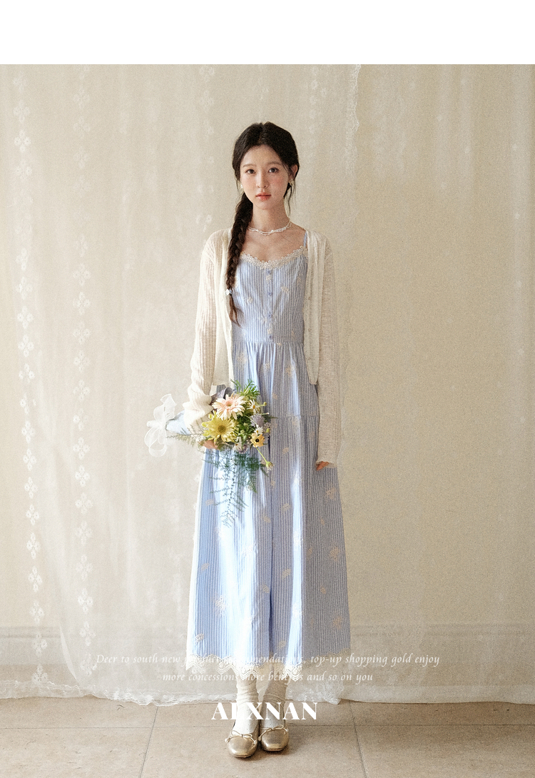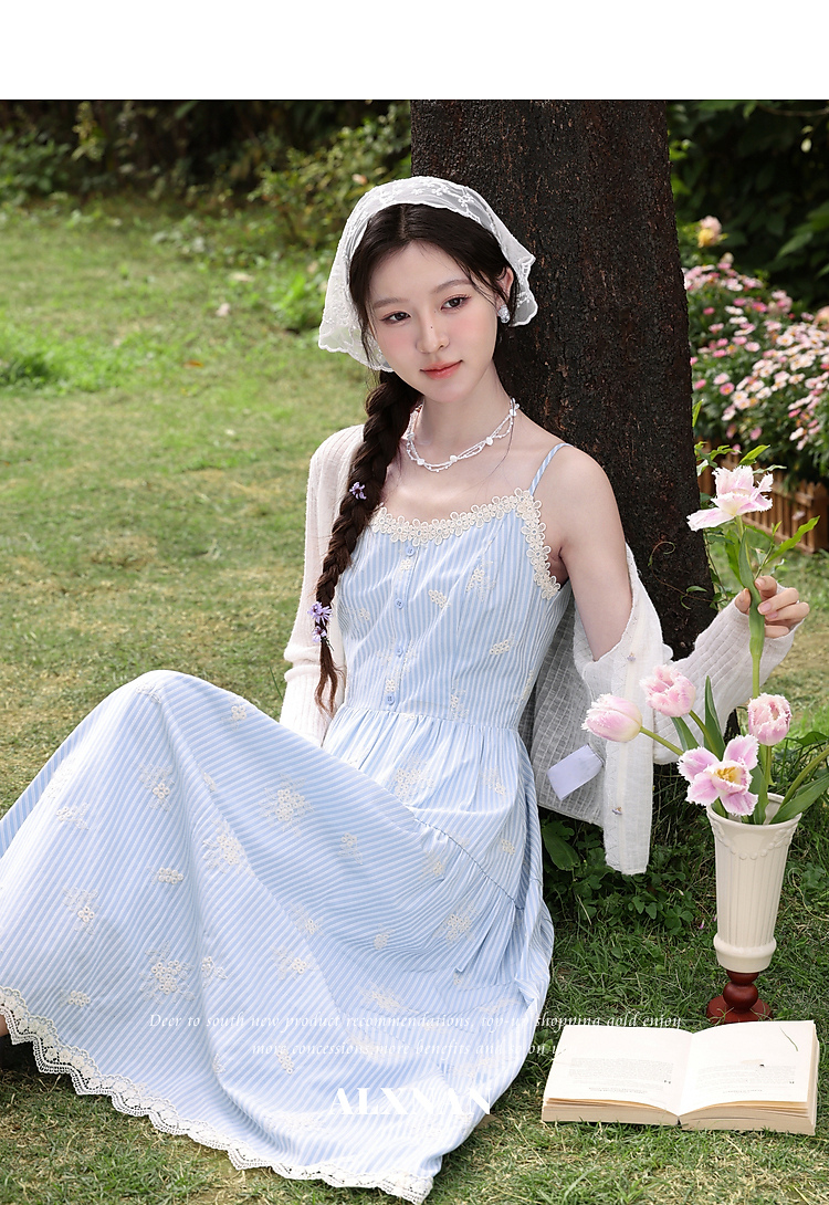 鹿向南「条痕花影」法式气质蓝色连衣裙女夏新款蕾丝花边条纹长裙