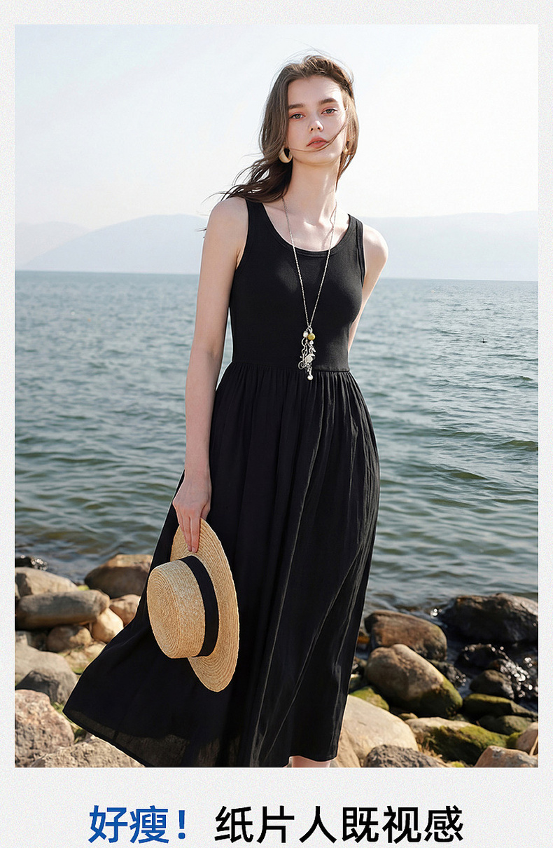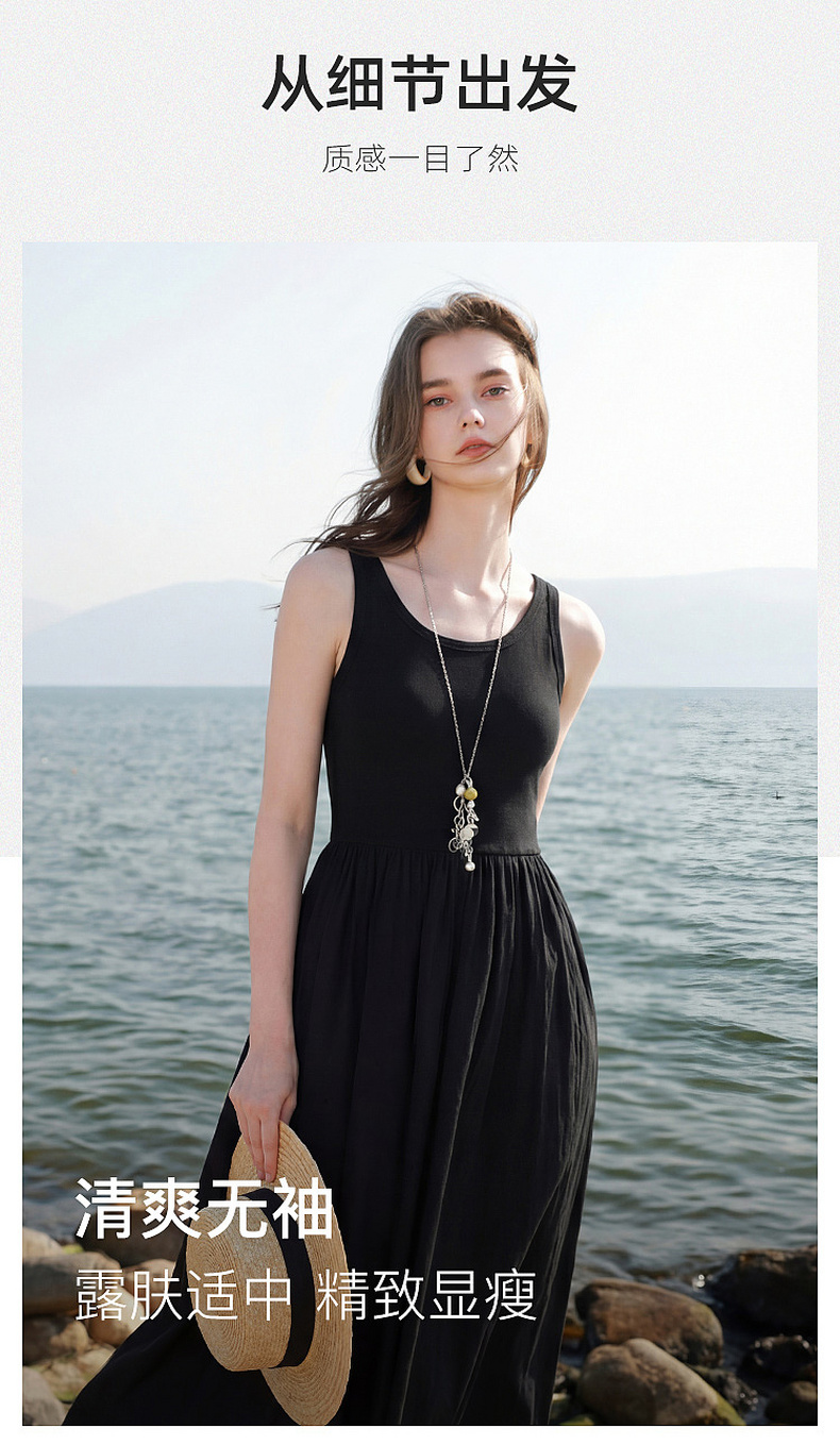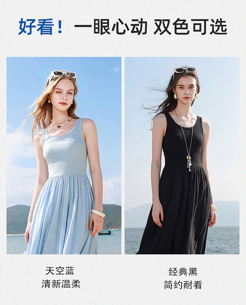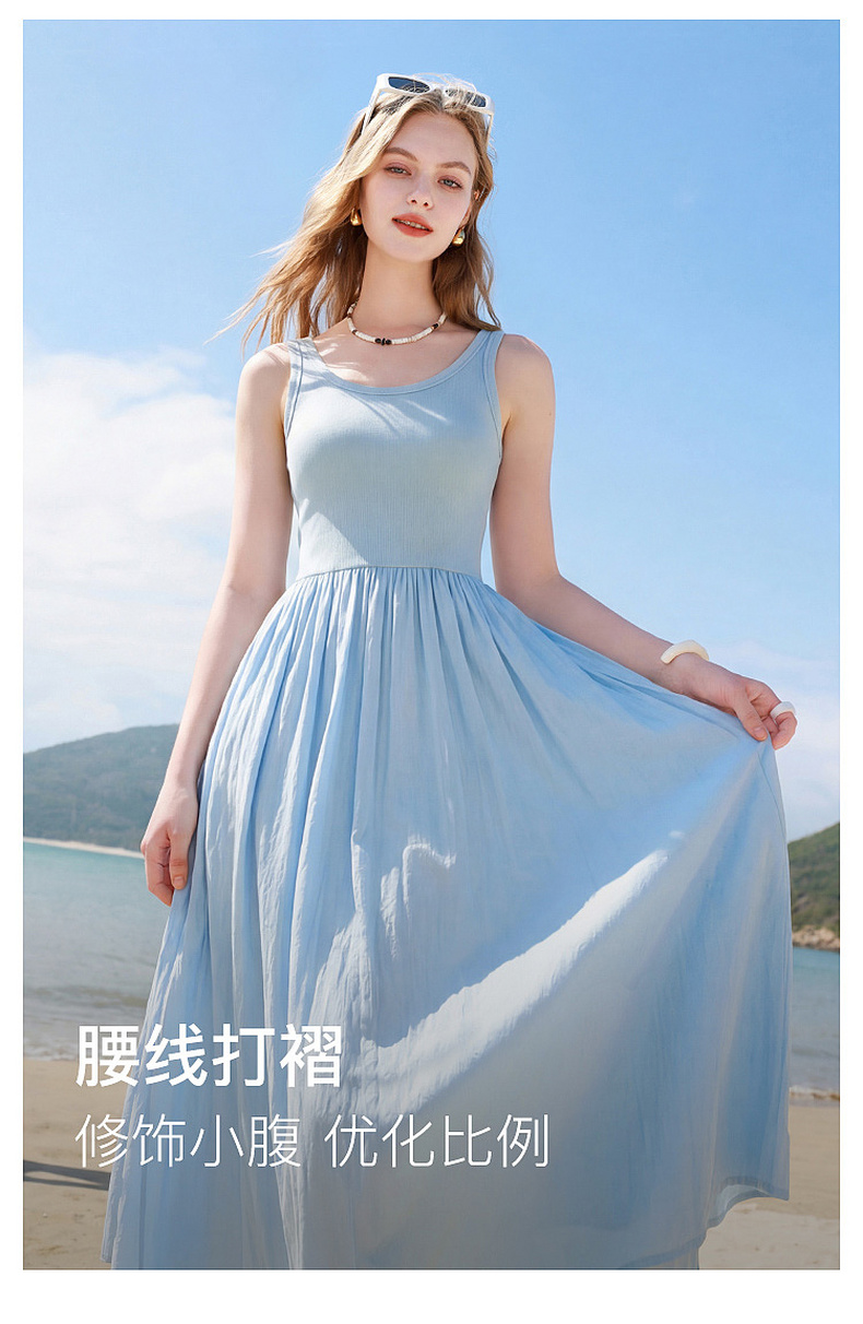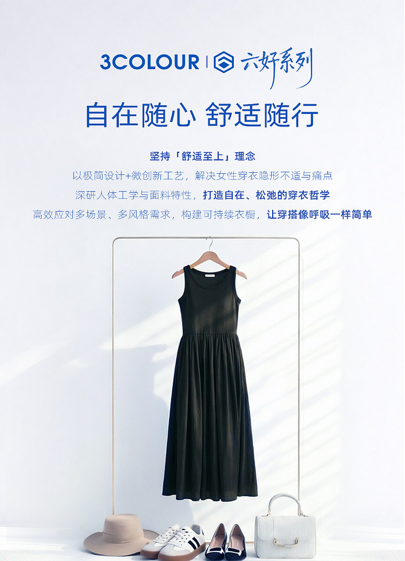 三彩2026夏季新款圆领无袖背心裙休闲连衣裙收腰A字裙长裙Z