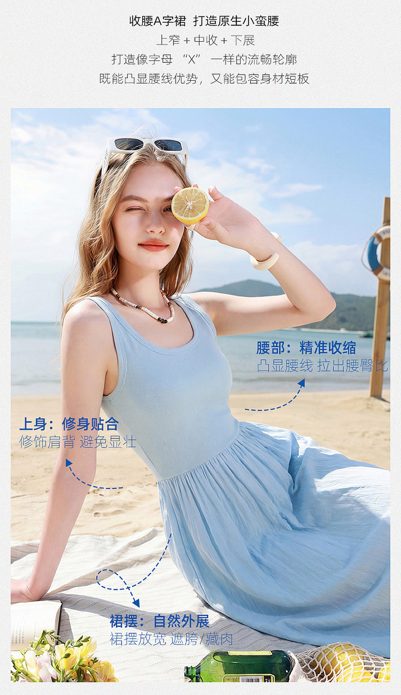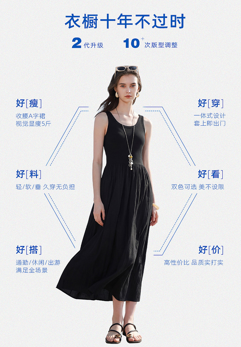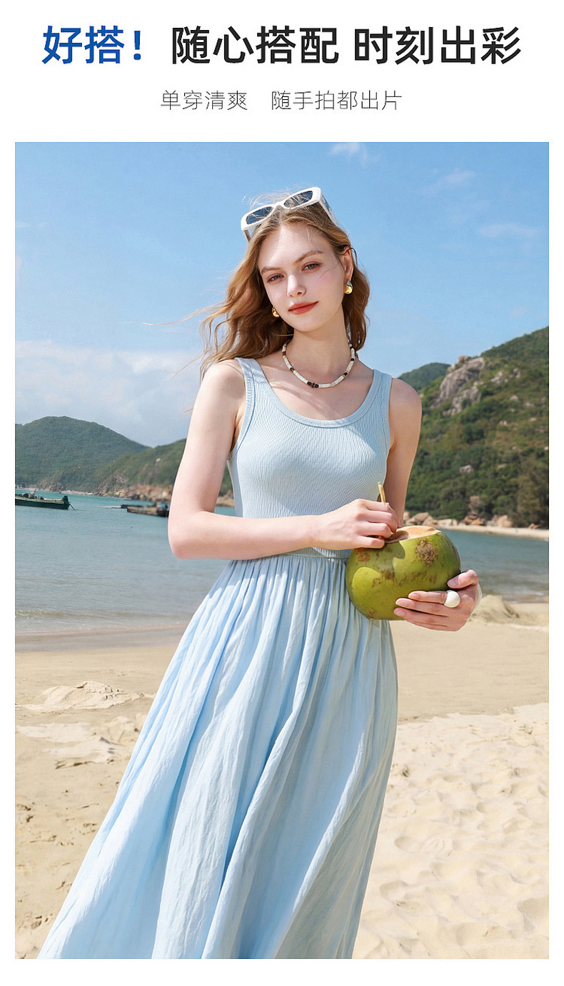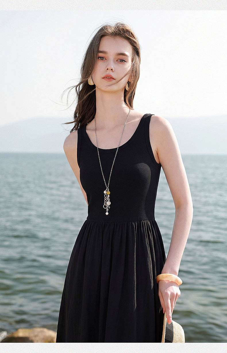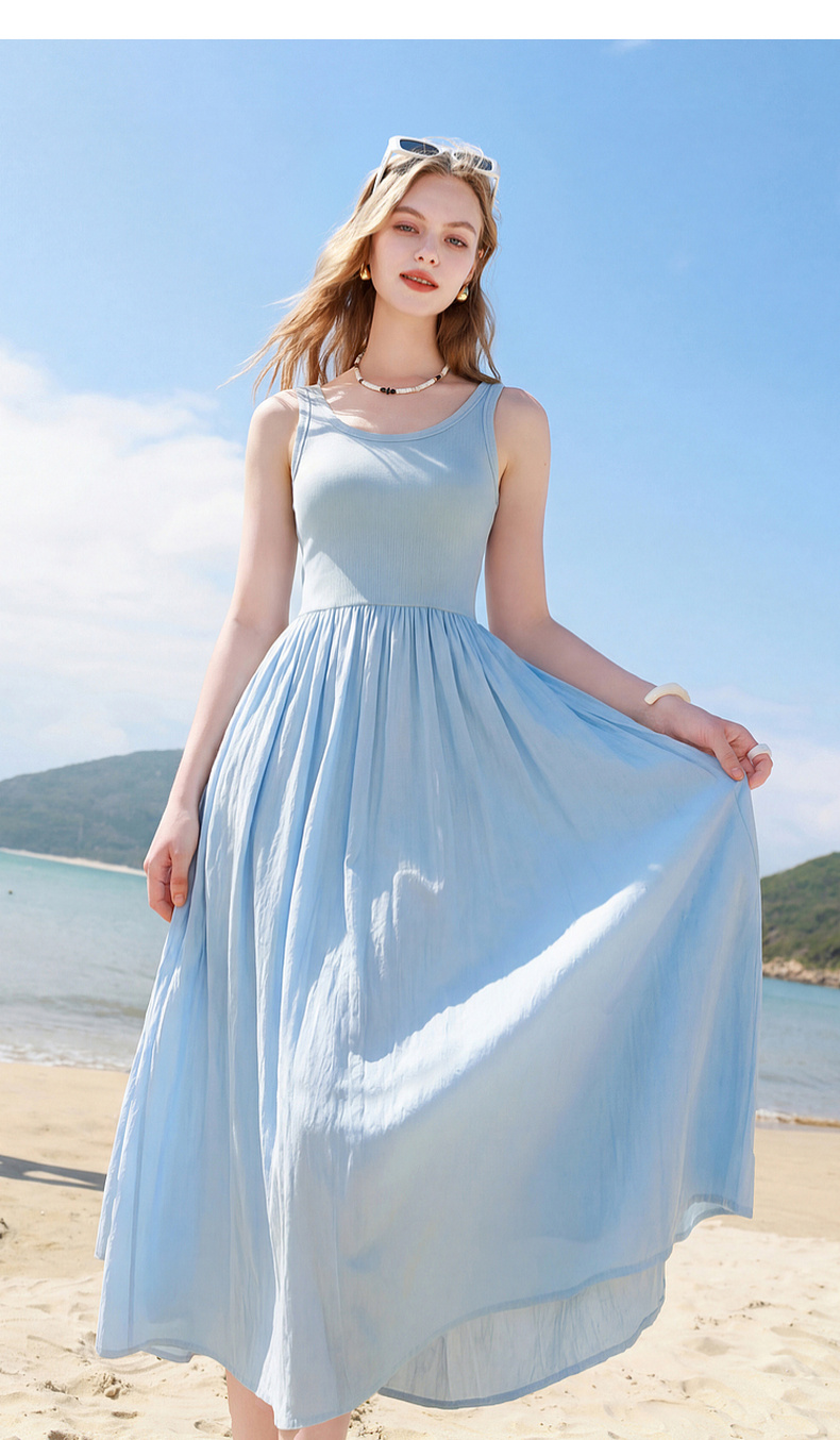 三彩2026夏季新款圆领无袖背心裙休闲连衣裙收腰A字裙长裙Z
